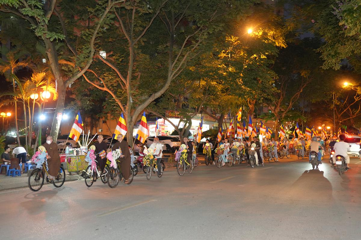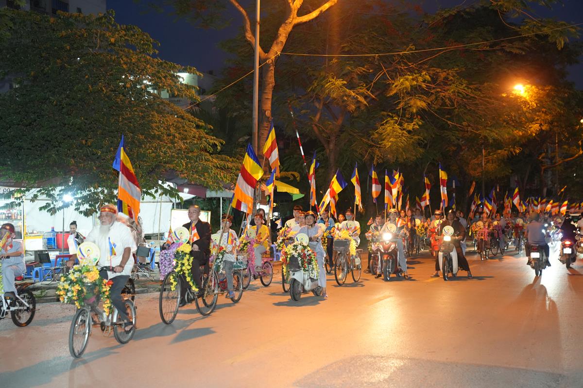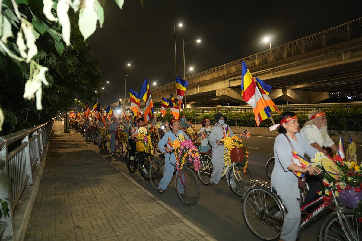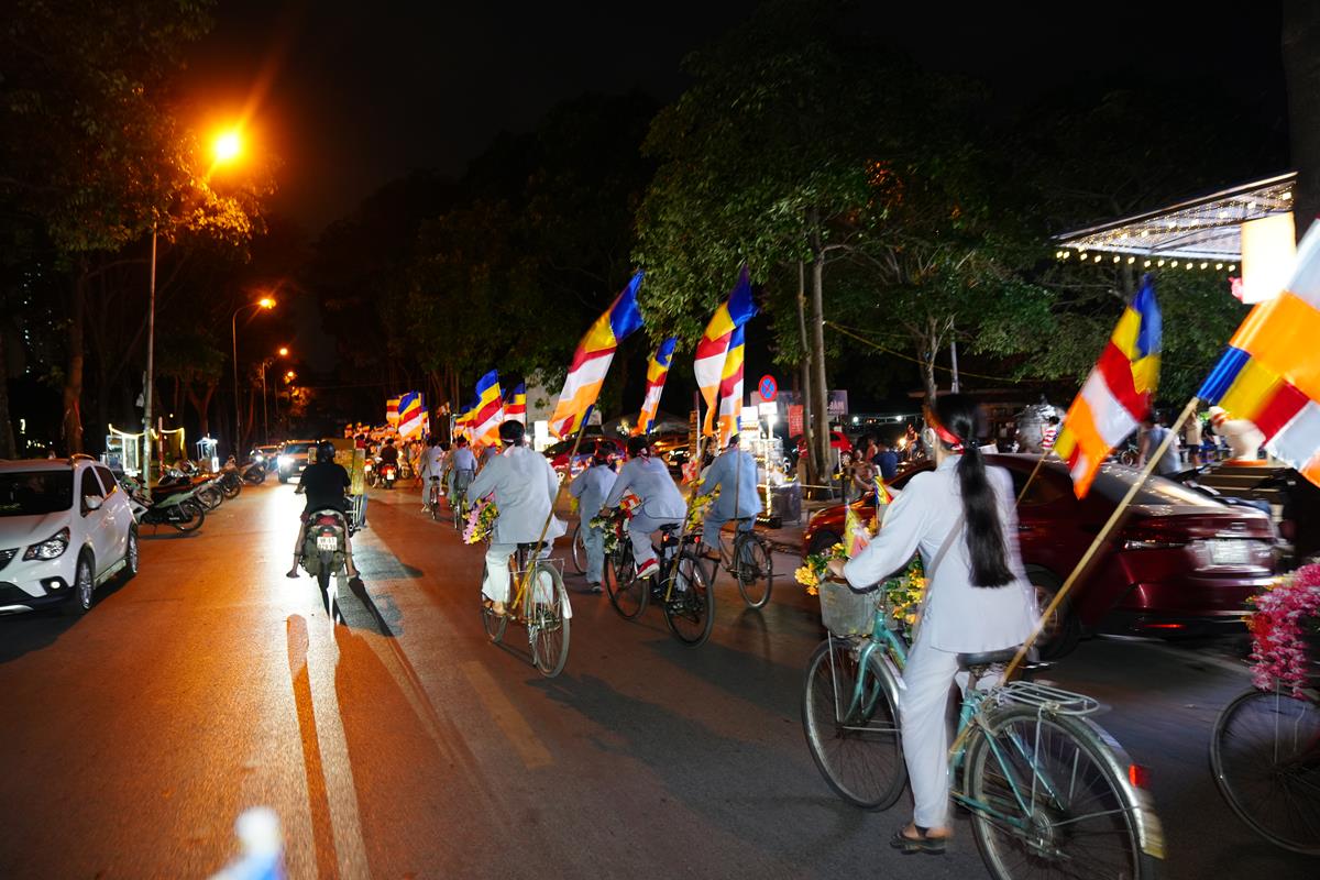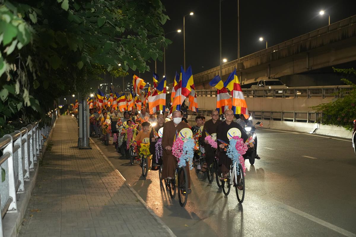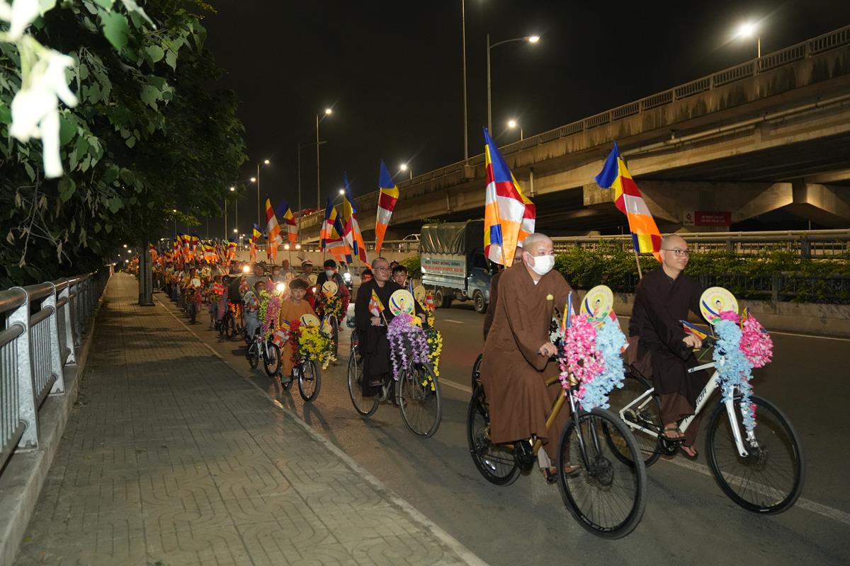 Sau đó đoàn chính thức khởi hành với hàng trăm chiếc xe đạp, xe điện, xe máy do chư Tăng dẫn đầu. Theo đoàn còn có xe nhạc âm vang những bài hát ca ngợi Đấng Thế Tôn, rộn ràng khắp các tuyến phố. Đoàn đạp xe diễu hành tuy dài, nhưng mọi người đều nghiêm chỉnh chấp hành luật lệ giao thông, đội mũ bảo hiểm, đi đúng phần đường, làn đường của mình, dừng chờ đèn tín hiệu giao thông.