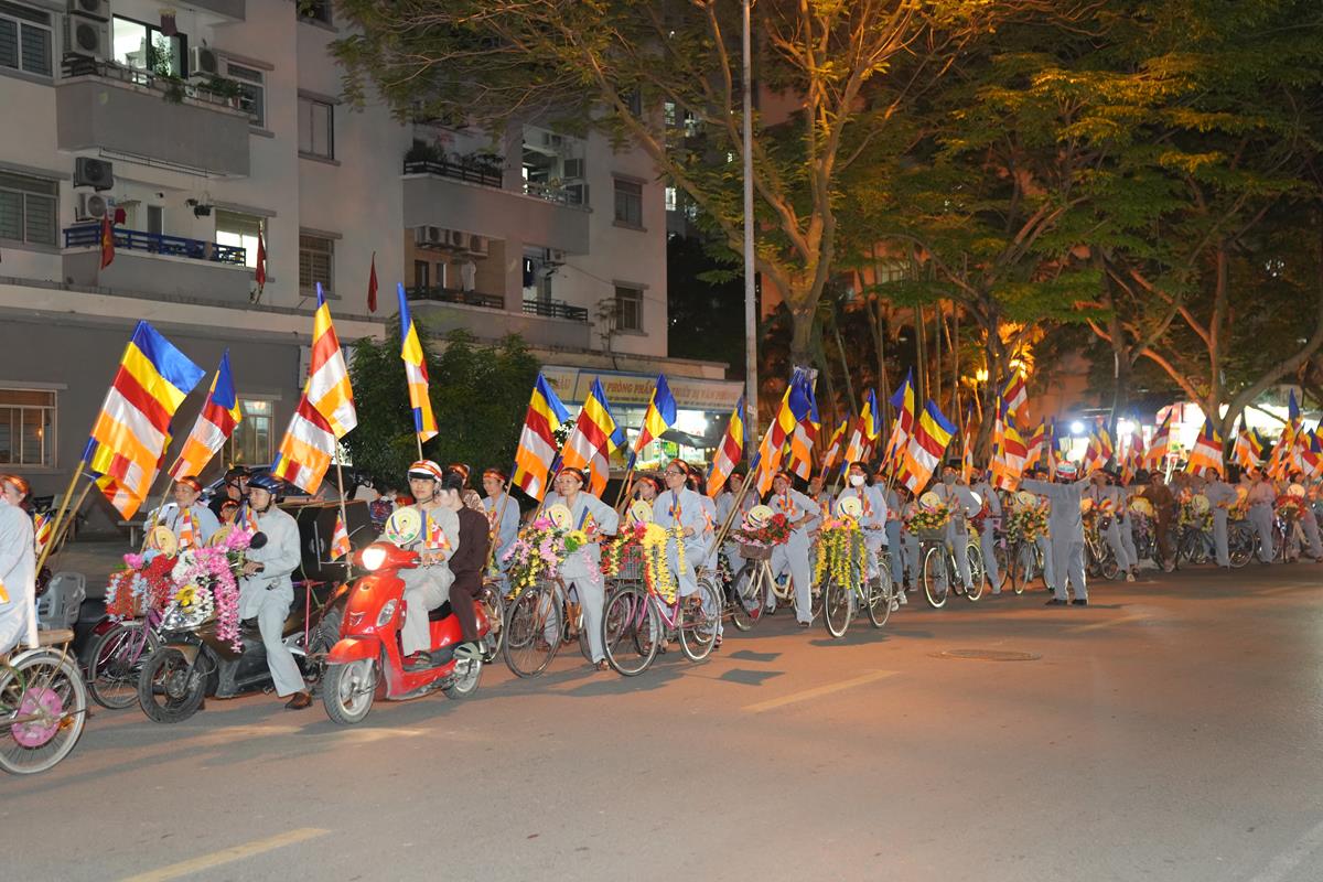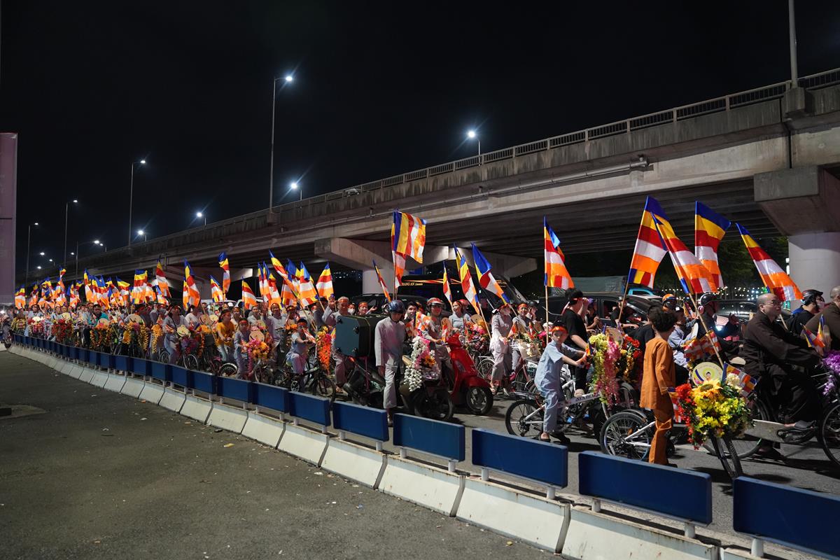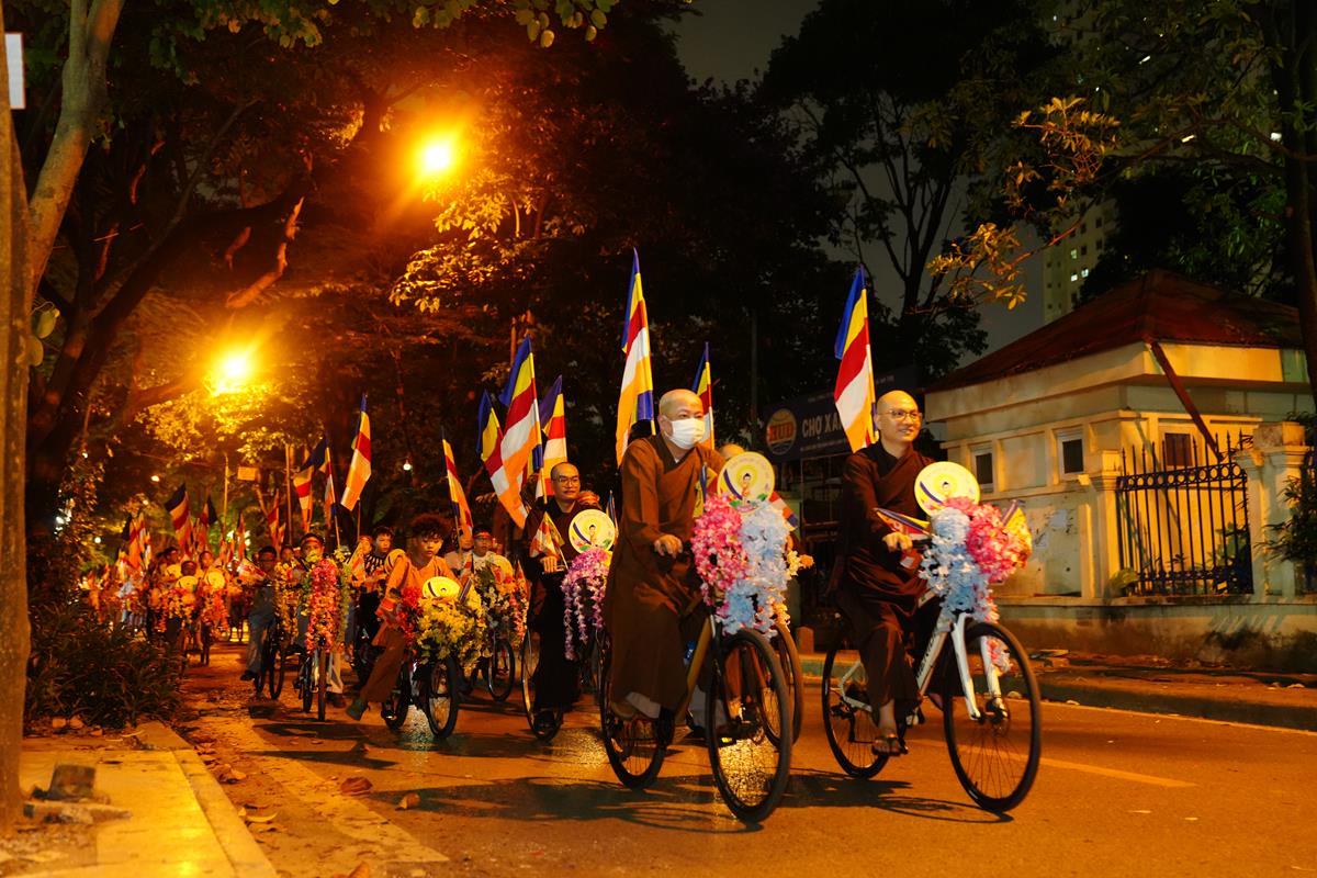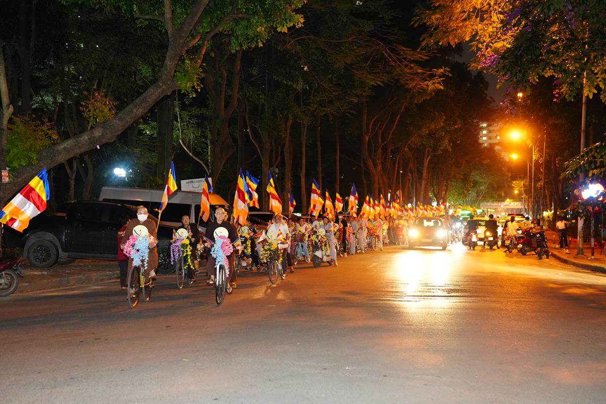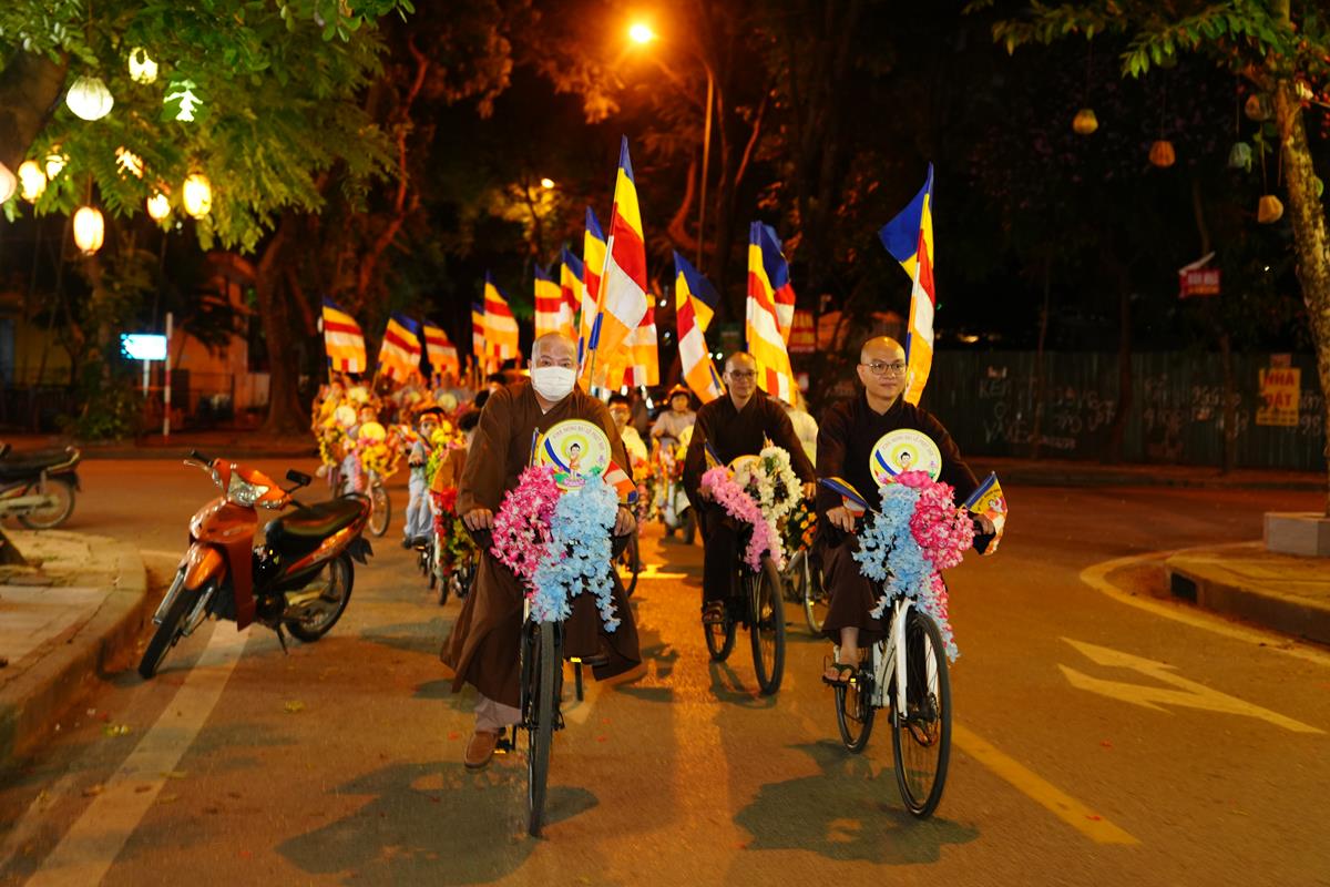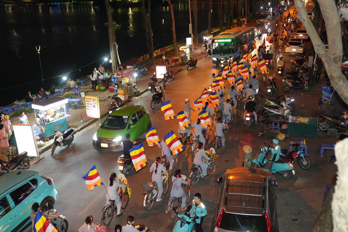 Sau đó đoàn chính thức khởi hành với hàng trăm chiếc xe đạp, xe điện, xe máy do chư Tăng dẫn đầu. Theo đoàn còn có xe nhạc âm vang những bài hát ca ngợi Đấng Thế Tôn, rộn ràng khắp các tuyến phố. Đoàn đạp xe diễu hành tuy dài, nhưng mọi người đều nghiêm chỉnh chấp hành luật lệ giao thông, đội mũ bảo hiểm, đi đúng phần đường, làn đường của mình, dừng chờ đèn tín hiệu giao thông.