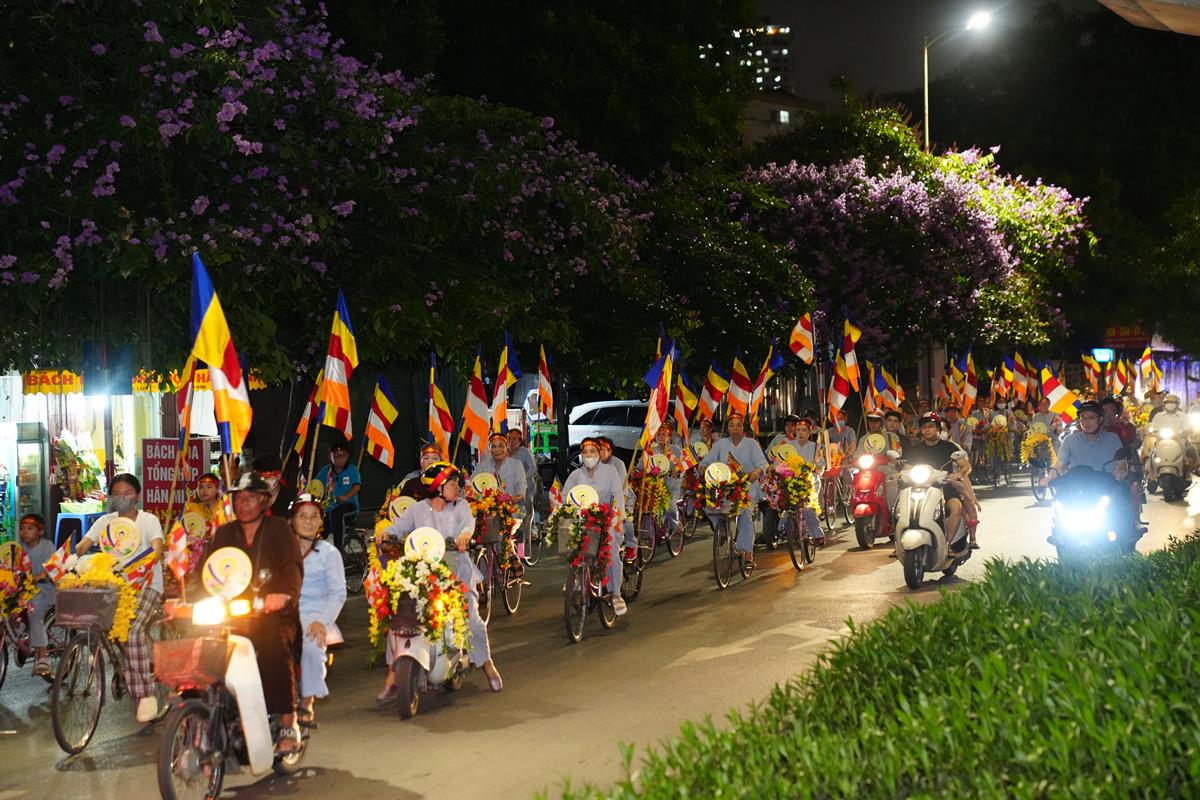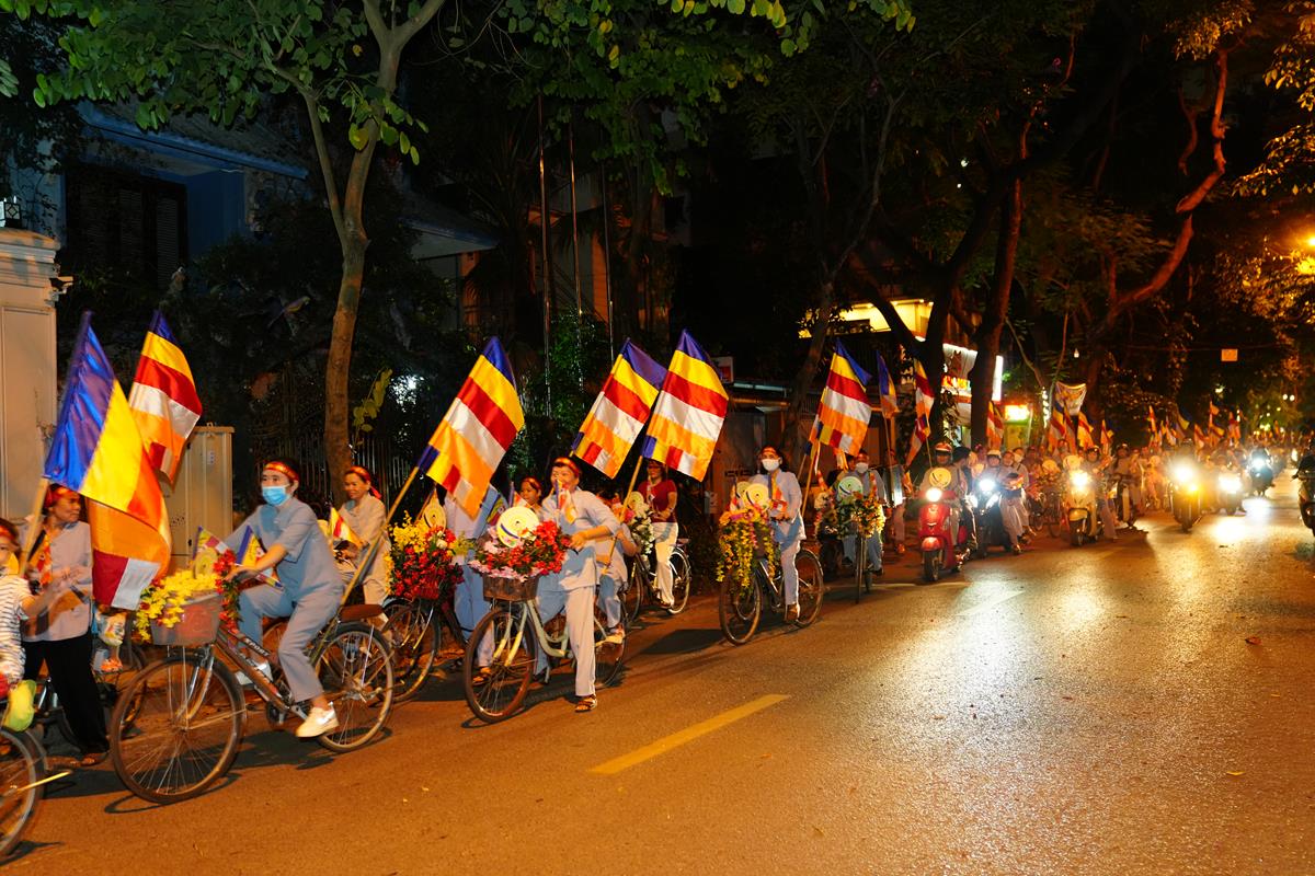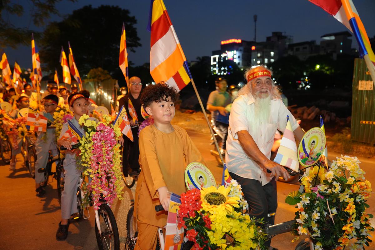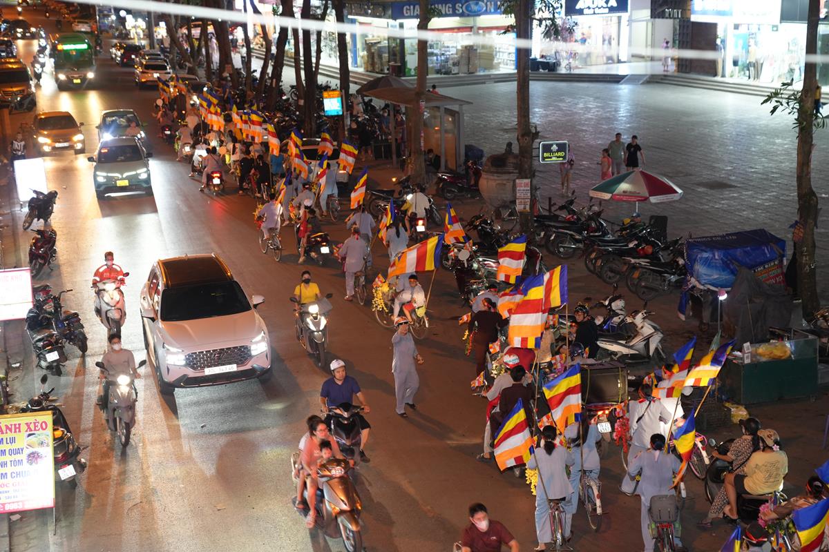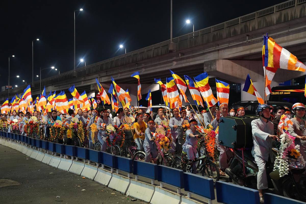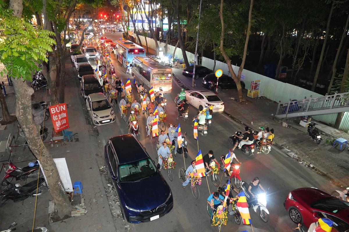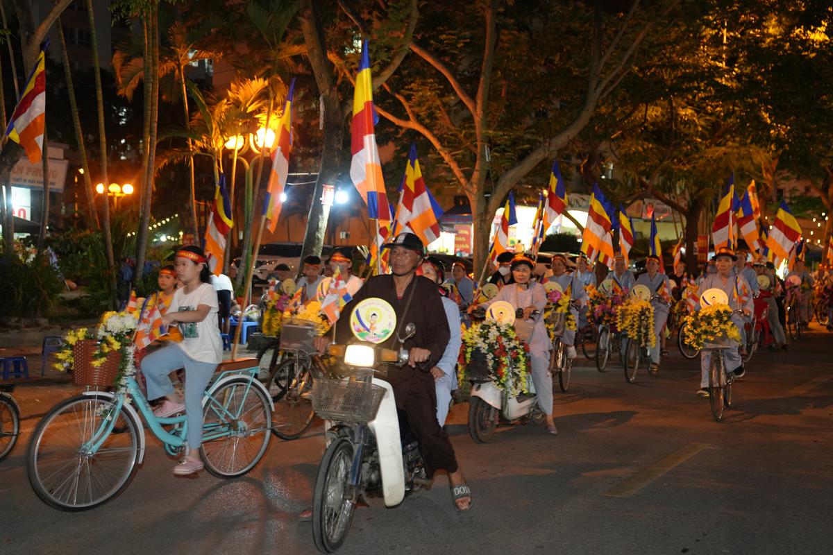 Sau đó đoàn chính thức khởi hành với hàng trăm chiếc xe đạp, xe điện, xe máy do chư Tăng dẫn đầu. Theo đoàn còn có xe nhạc âm vang những bài hát ca ngợi Đấng Thế Tôn, rộn ràng khắp các tuyến phố. Đoàn đạp xe diễu hành tuy dài, nhưng mọi người đều nghiêm chỉnh chấp hành luật lệ giao thông, đội mũ bảo hiểm, đi đúng phần đường, làn đường của mình, dừng chờ đèn tín hiệu giao thông.