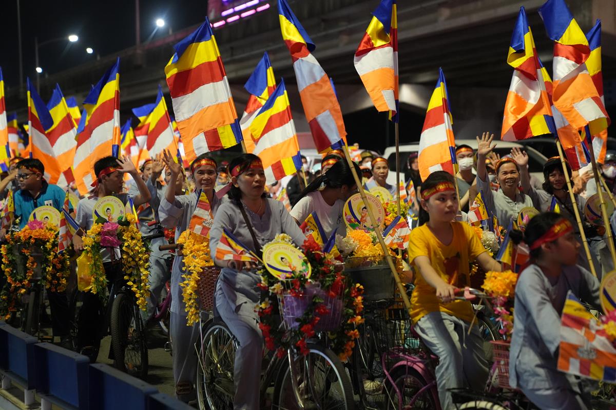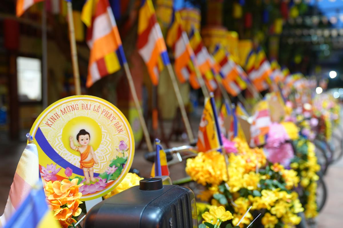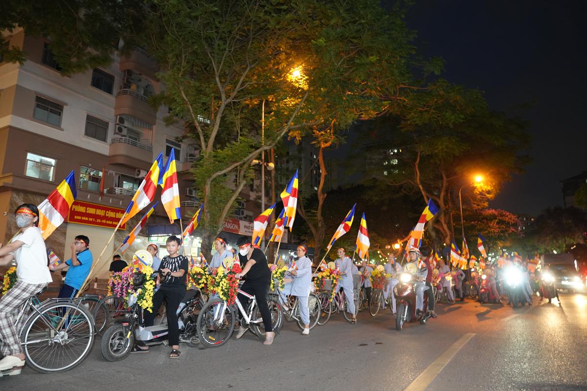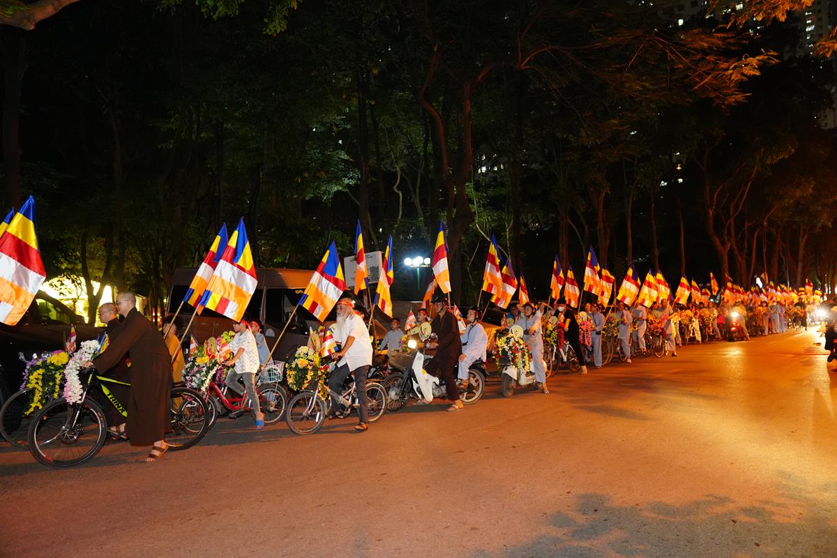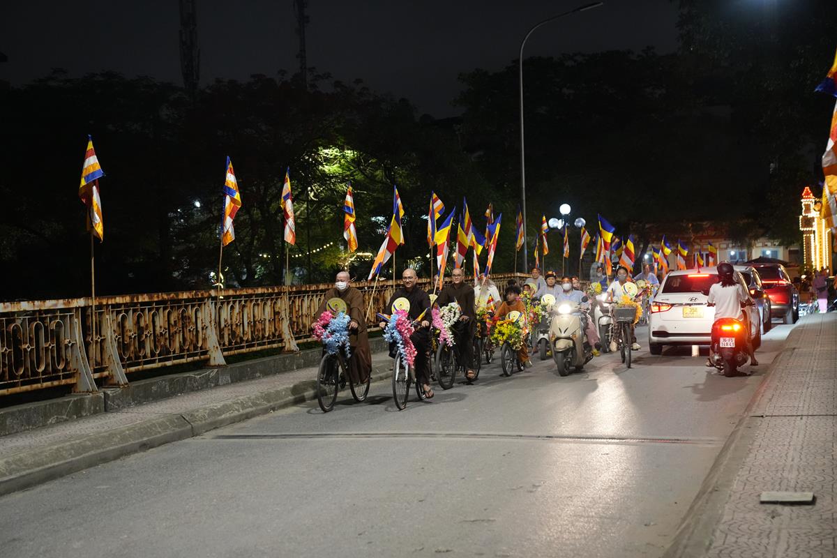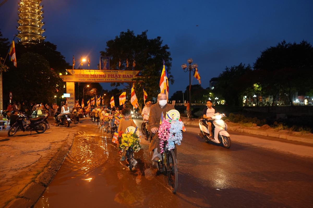 Sau đó đoàn chính thức khởi hành với hàng trăm chiếc xe đạp, xe điện, xe máy do chư Tăng dẫn đầu. Theo đoàn còn có xe nhạc âm vang những bài hát ca ngợi Đấng Thế Tôn, rộn ràng khắp các tuyến phố. Đoàn đạp xe diễu hành tuy dài, nhưng mọi người đều nghiêm chỉnh chấp hành luật lệ giao thông, đội mũ bảo hiểm, đi đúng phần đường, làn đường của mình, dừng chờ đèn tín hiệu giao thông.