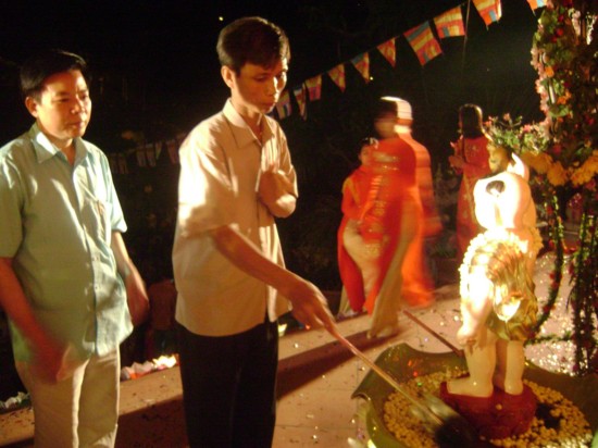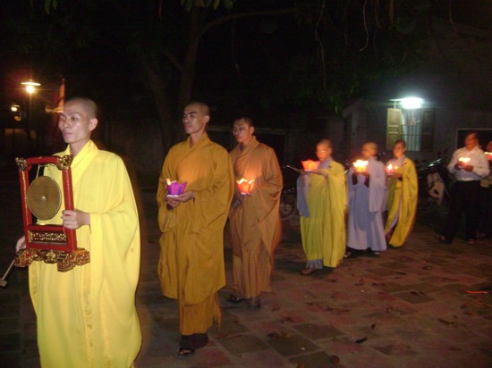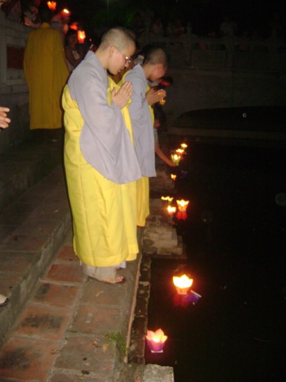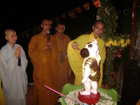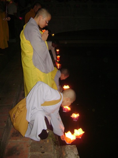 Sau nghi thức Tắm Phật trang trọng, các Đại đức, Tăng, Ni, quan khách và các phật tử đã cùng thực hiện lễ thả hoa đăng, hàng trăm ngọn nến lung linh được thả trong hồ trước đến Cự Linh linh thiêng như lòng con Phật tử gửi đến Đức Phật lời cầu mong cho Quốc Thái Dân An.