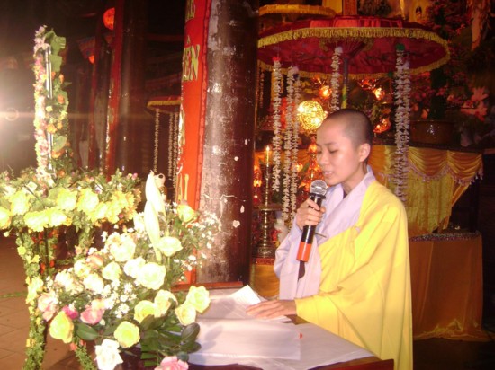 Trong không khí trang nghiêm nhưng ấm áp lòng của những người con Phật, Đại đức Thích Quảng Toàn trân trọng đọc Thông điệp của Đức Pháp Chủ Giáo hội Phật Giáo Việt Nam Thích Phổ Tuệ.