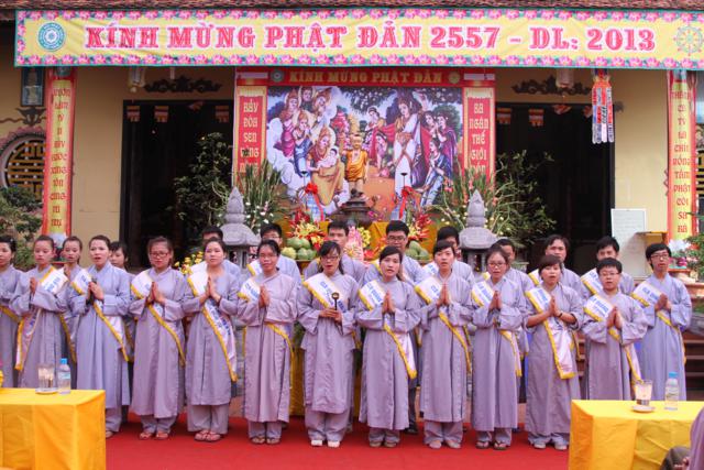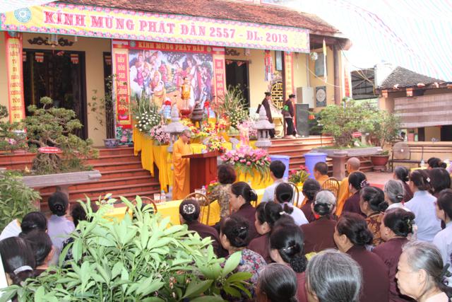 Đúng 8h15’, Chư tôn đức cùng Phật tử niệm Phật cầu gia bị, toàn thể đại chúng trang nghiêm trước lễ đài Phật đản tại sân chính điện chùa Duệ Tú cử hành nghi lễ Phật Đản Sinh.