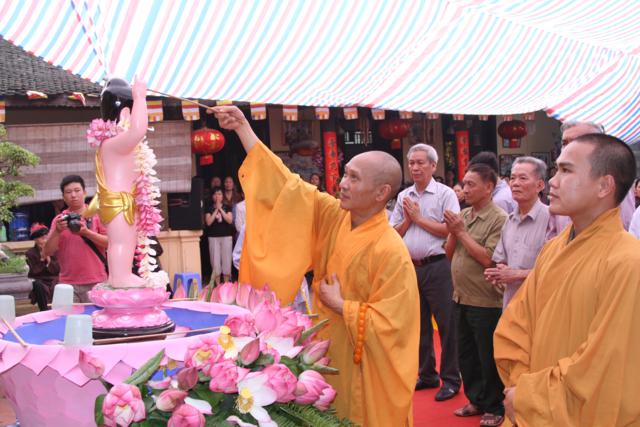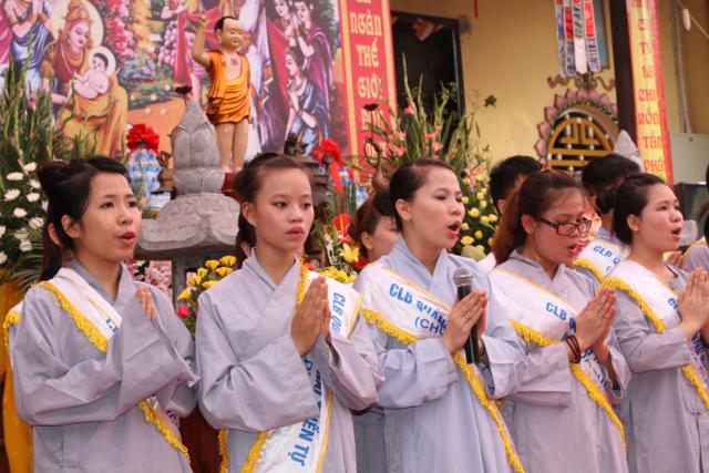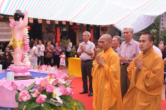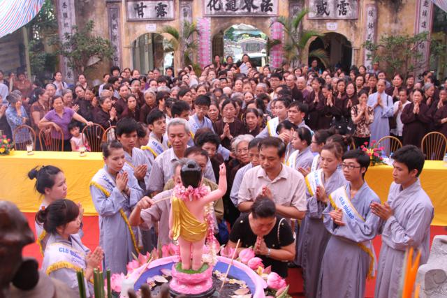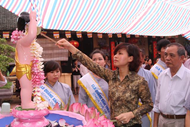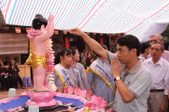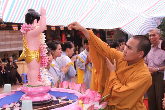 Đúng 9h15’, đại chúng cử hành nghi lễ tụng kinh Phật đản truyền thống và làm lễ tắm tượng Phật. Tất cả hàng Phật tử đều thành kính như đang được tắm mình trong ánh hào quang của Đức Phật ngày khánh đản.
