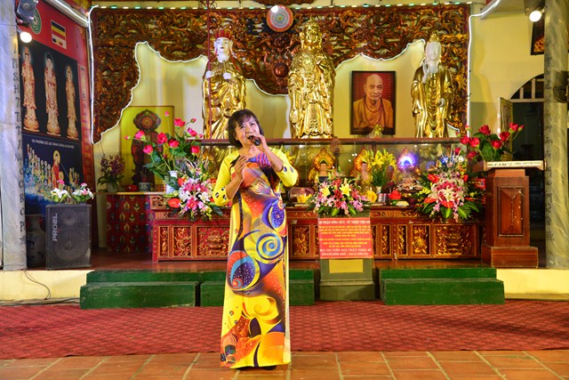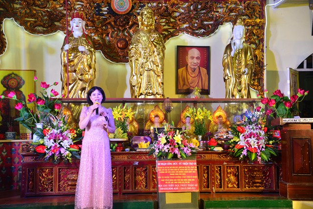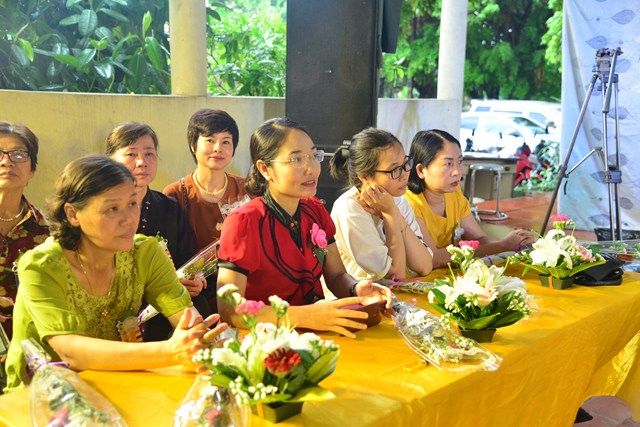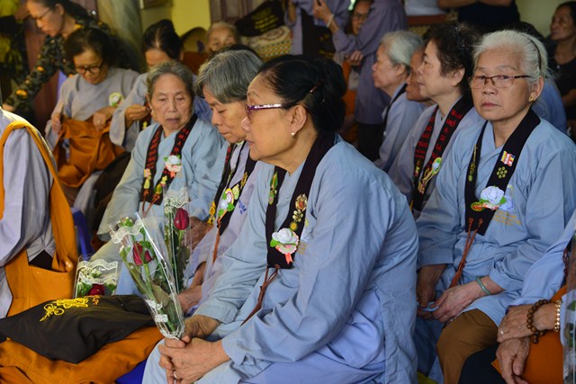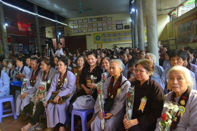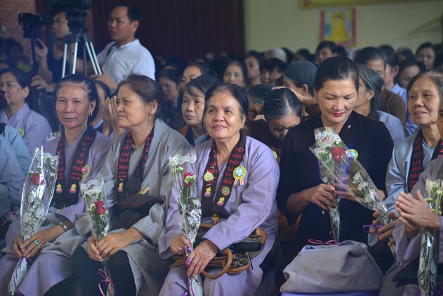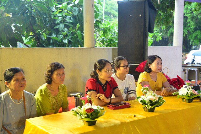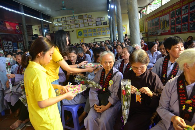 Phật tử tặng hoa chúc mừng các bà, các mẹ nhân mùa Vu lan