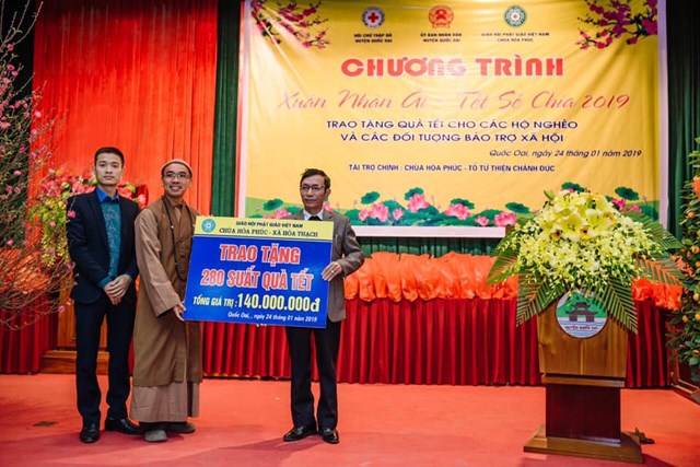 Nằm trong chuỗi các hoạt động thiện nguyện “TẾT ĐOÀN VIÊN – KỶ HỢI AN VUI” Sáng ngày 25/1/2019 tại Hội trường UBND huyện Quốc Oai, Chùa Hòa Phúc (xã Hòa Thạch, huyện Quốc Oai, TP, Hà Nội) đã trao tặng 280 suất quà Tết, mỗi suất quà trị giá 500.000đ cho các hoàn cảnh khó khăn cùng Hội người mù trong huyện.