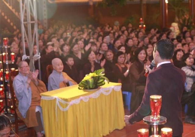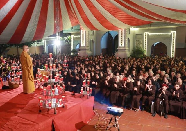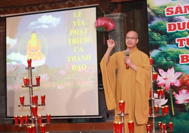 Sau khi kết thúc chương trình văn nghệ chào mừng, Đại đức Thích Quảng Hiếu – Trưởng Ban tổ chức đại lễ đã chia sẻ cùng các Phật tử có mặt tại đạo tràng về lược sử Đức Phật Thích Ca từ khi đản sinh đến khi nhập niết bàn, ý nghĩa của ngày Đức Phật Thích Ca Nâu Ni thành đạo. Sự kiện Phật thành đạo không chỉ là một cuộc chinh phục vĩ đại, một sự chiến thắng vẻ vang đối với bản thân Ngài mà còn là một sự khai sáng tuyệt vời cho hết thảy nhân loại và chúng sinh. Sự kiện này cũng là mốc son đánh dấu một bước ngoặt lớn đối với sự ra đời của đạo Phật, là thời điểm mà chính thức xuất hiện một vị giáo chủ cõi Ta Bà để dẫn dắt chúng sinh hướng về nẻo giác. Việc tổ chức kỷ niệm ngày đức Phật Thích Ca Mâu Ni thành đạo không chỉ tổ chức trong một ngày, một giờ là đủ mà chúng ta cần phải chuyển hiện, khơi nguồn sáng đó vào đời sống, vào thời đại, từng giây, từng phút, từng sát na, từng hơi thở của mình để từ đó cố gắng tu tập, noi theo tấm gương của Ngài trên bước đường tìm cầu giác ngộ, giải thoát.