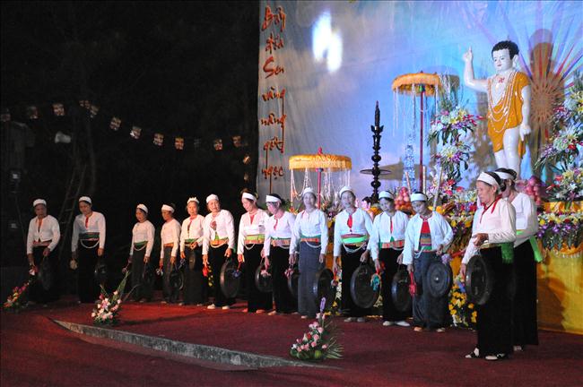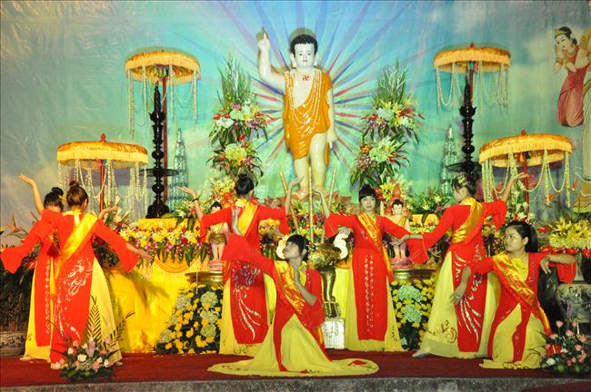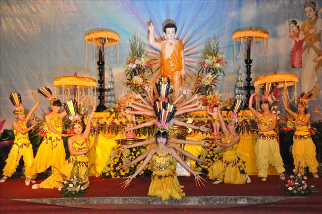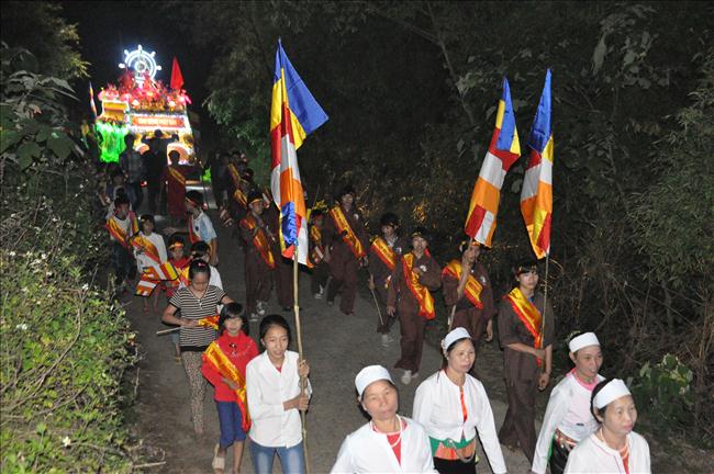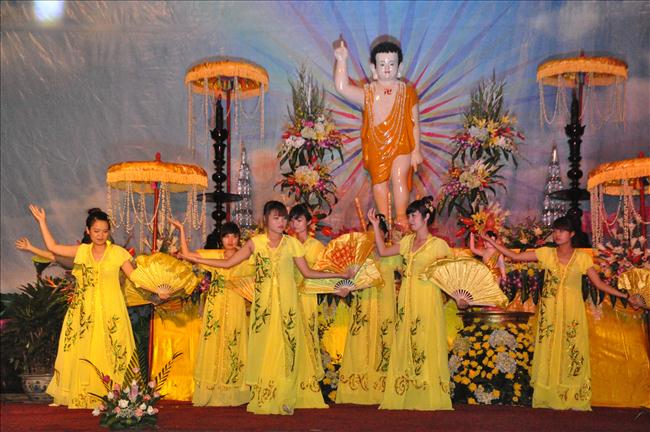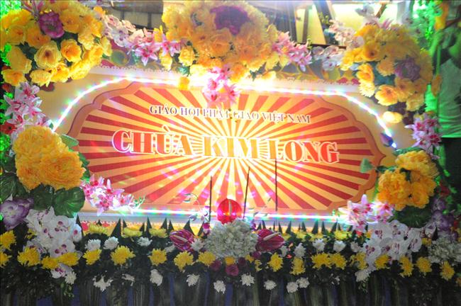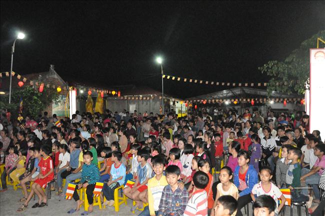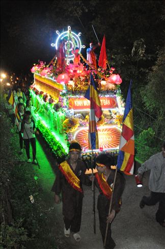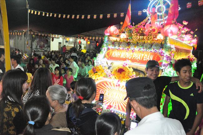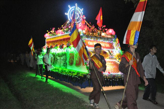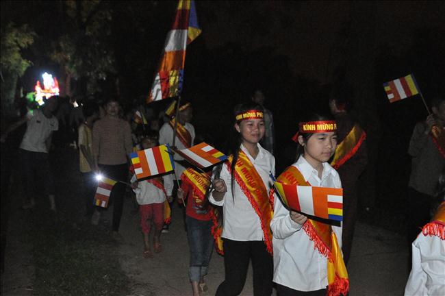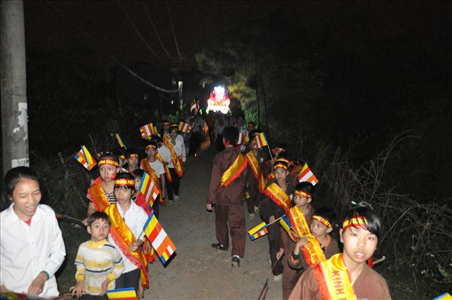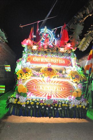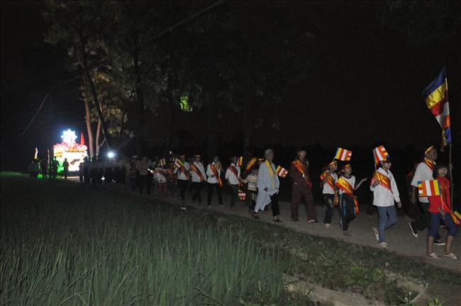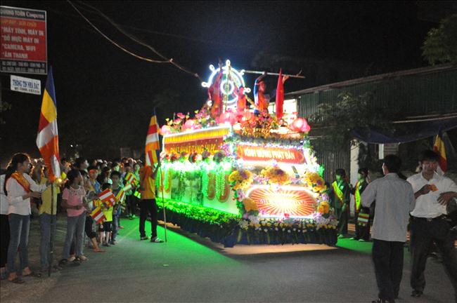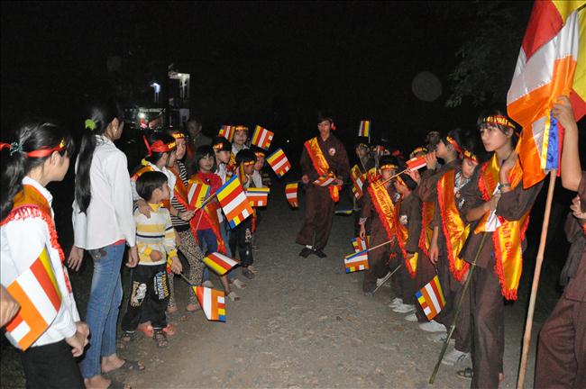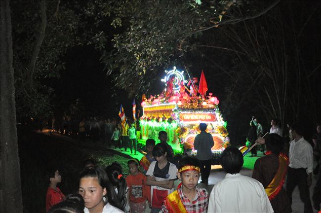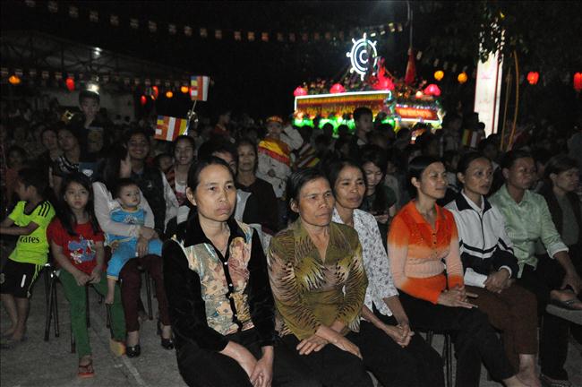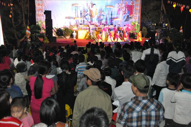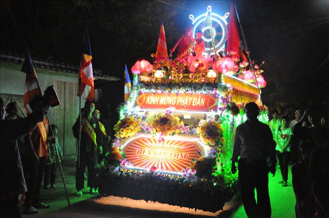 Và đến 20h30 cùng ngày, đoàn xe đã trở về chùa Kim Long nơi các chư tôn đức Tăng – Ni, các Phật tử, nhân dân địa phương đã quy tụ sẵn tại sân khấu chính, lễ đài để cùng tưng bừng tổ chức đêm văn nghệ chào mừng ngày Đản Sinh của Đức Thích Ca. Đêm văn nghệ với lòng thành kính và các tiết mục đặc sắc được BTC chuẩn bị công phu và kĩ lưỡng đã diễn ra thành công rực rỡ trong sự hồ hởi niềm vui và niềm hạnh phúc của toàn thể mọi người có mặt.