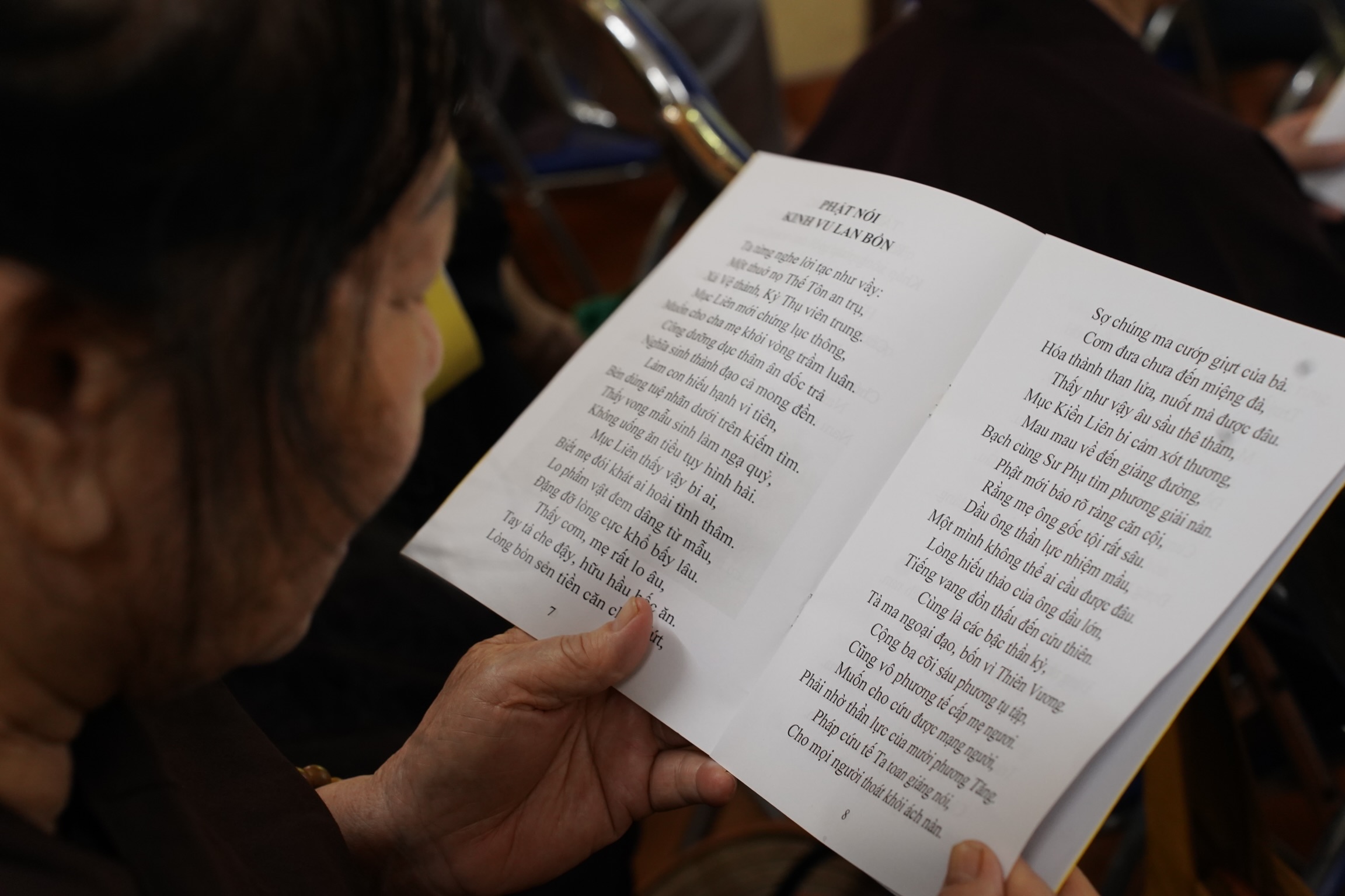 Tại buổi lễ, Chư tăng và đại chúng cùng nhất tâm tụng kinh Vu Lan, dành một phút tĩnh tâm, cùng cầu nguyện cho cha mẹ đã quá vãng và những người còn hiện tiền đây là một truyền thống rất tốt đẹp và lâu đời của dân tộc Việt Nam. Truyền thống đó từ xa xưa đã được giữ vững và trao truyền từ thế hệ này sang thế hệ khác, cho đến ngày nay.