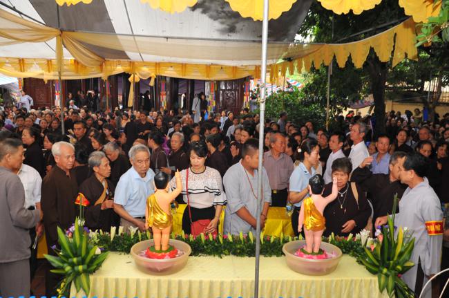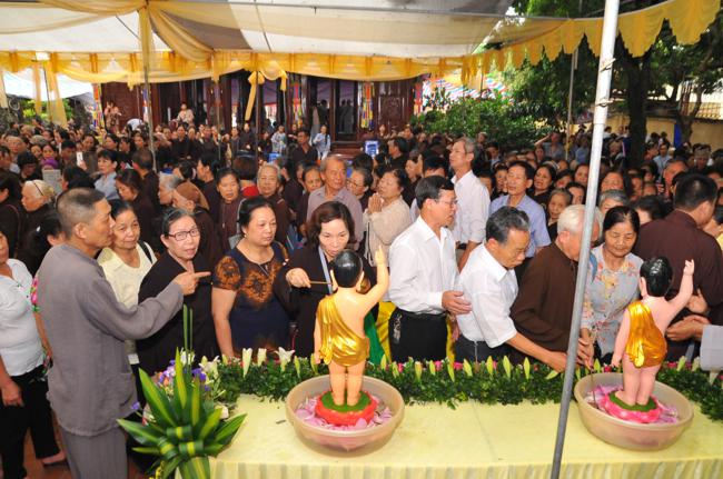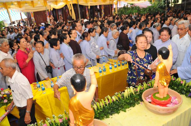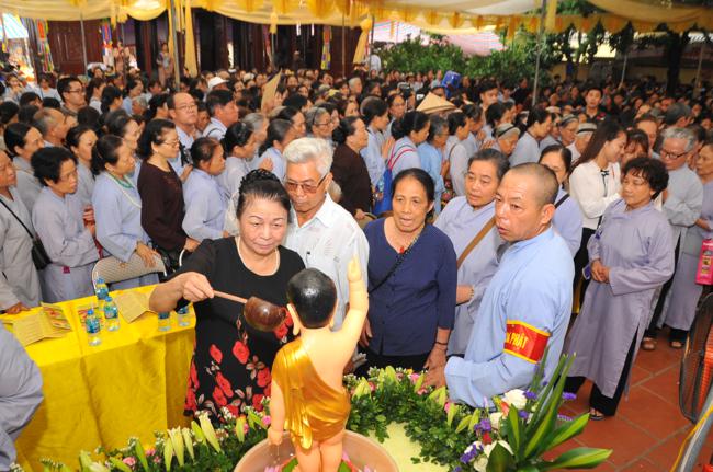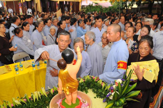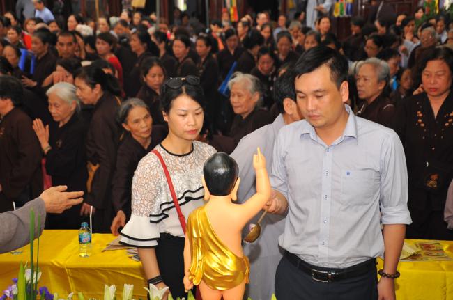 Tiếp đến, Thượng Tọa Thích Tiến Đạt đã thay mặt cho toàn thể hội chúng làm lễ niêm hương bạch Phật, tụng kinh Phật đản và thực hiện nghi thức tắm Phật.