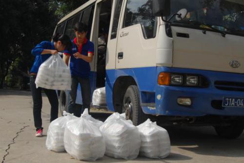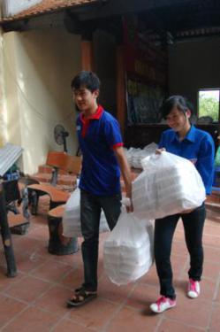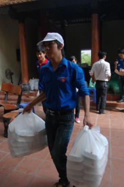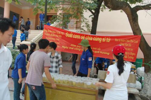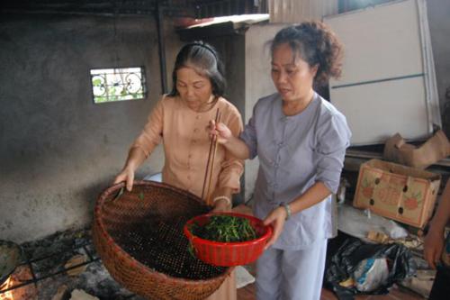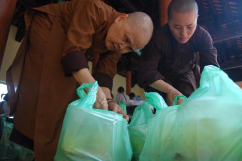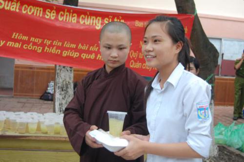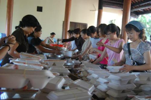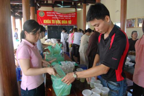Các cô các bác Phật tử đã rất chu đáo tận tình, đóng từng suất cơm chay thật cẩn thận để phát cho các sĩ tử.