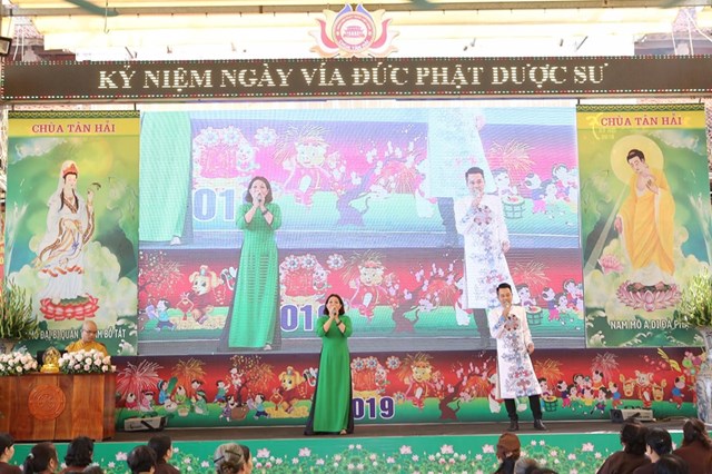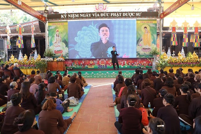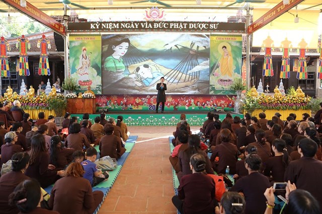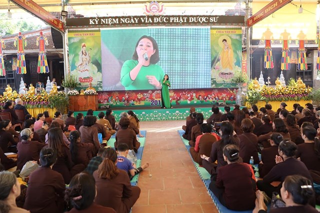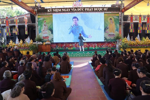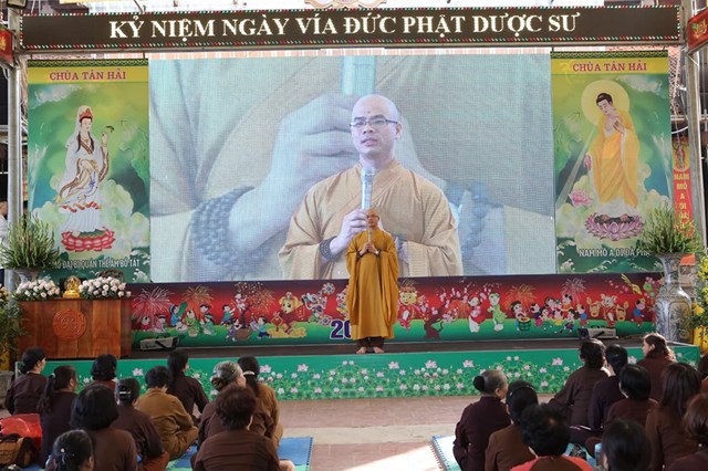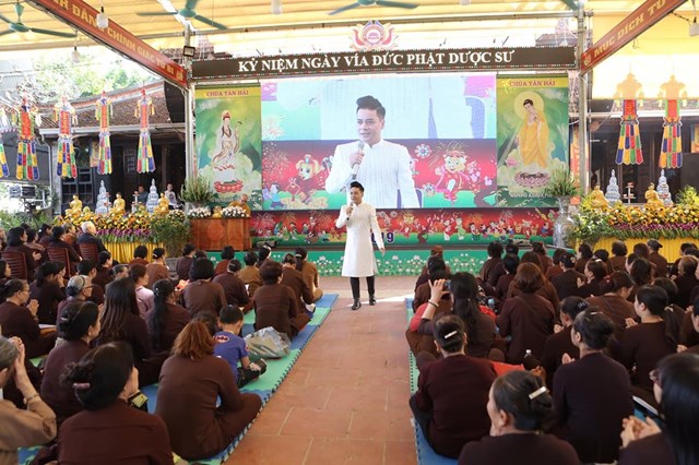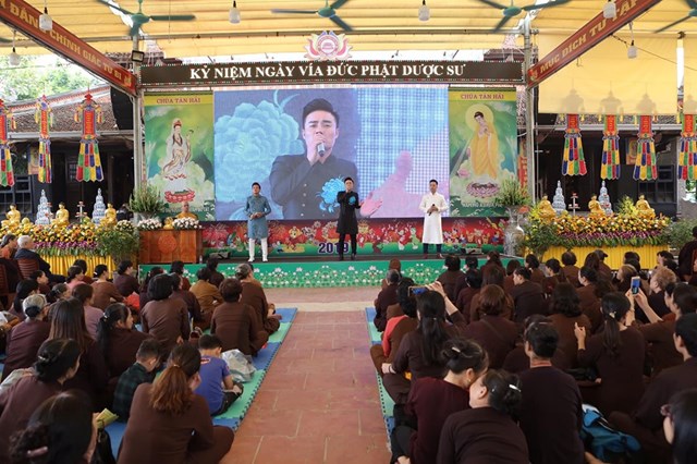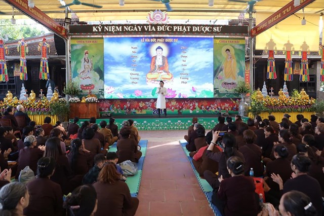Đại lễ kính mừng vía Đức Phật Dược Sư năm nay, số lượng Phật tử về chùa đông hơn mọi năm, các Phật tử đã trang nghiêm thành kính lắng nghe Đại đức Thích Quảng Hiếu – Bản tự chùa Tân Hải, trưởng BTC đại lễ chia sẻ về ý nghĩa Thánh hiệu của Đức Phật Dược Sư, cũng như công năng của việc trì niệm danh hiệu Đức Phật Dược Sư, ánh sáng của Đức Phật Dược Sư. Theo đó, ánh sáng của Đức Phật Dược Sư là không nghĩ bàn: “Trong ngoài sáng suốt, tinh sạch hoàn toàn, không có chút nhơ bợn, ánh quang minh chói lọi khắp nơi”. Ánh sáng ấy chiếu đến đâu đều phá hết tăm tối vô minh của chúng sinh, đem lợi lạc và diệt tất cả những bệnh khổ thân tâm của chúng sinh, khiến cho họ xa lìa mê vọng mà hướng đến giác ngộ, giải thoát. Về công năng của việc trì niệm danh hiệu Phật Dược Sư, có thể nói là không thể nghĩ bàn.