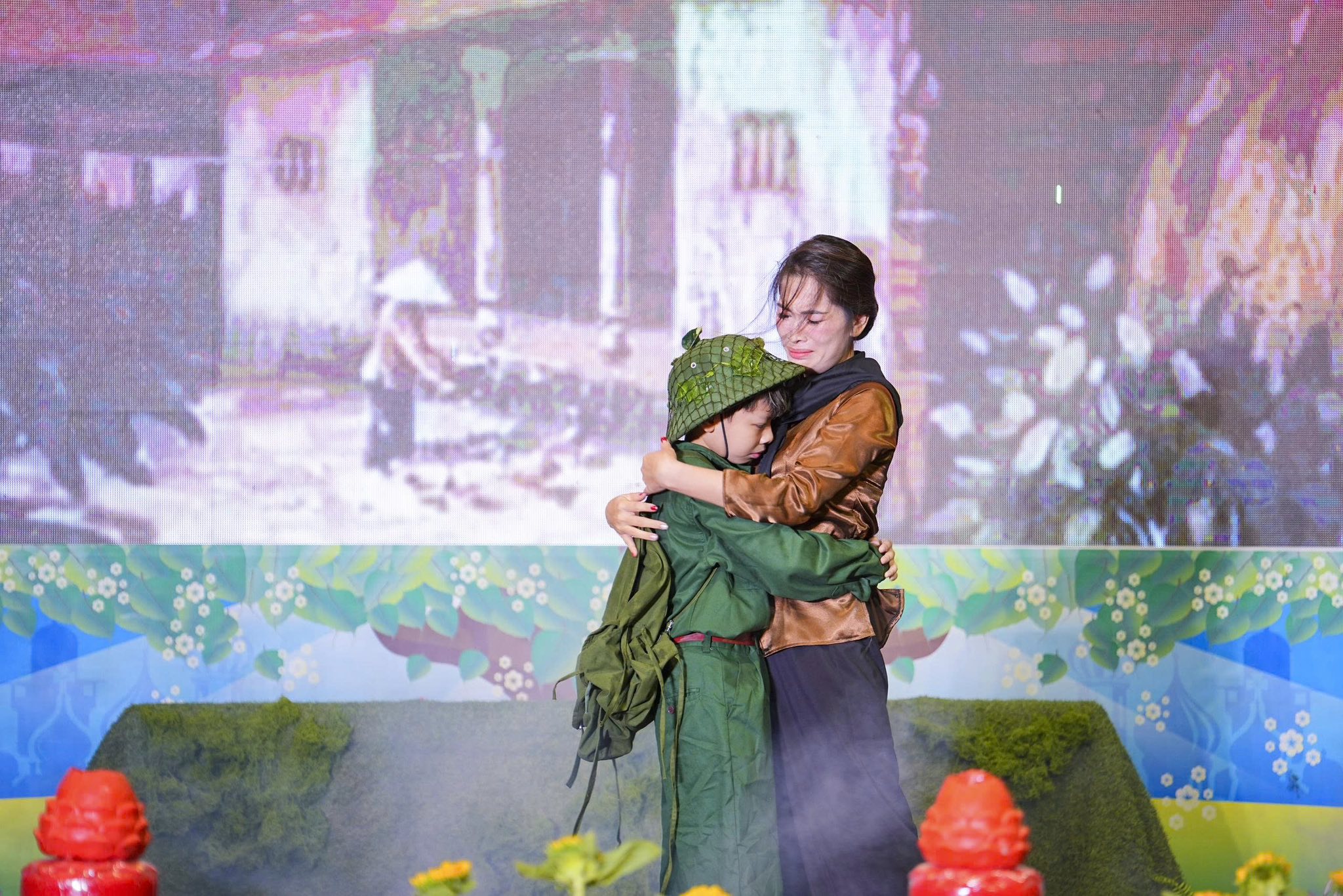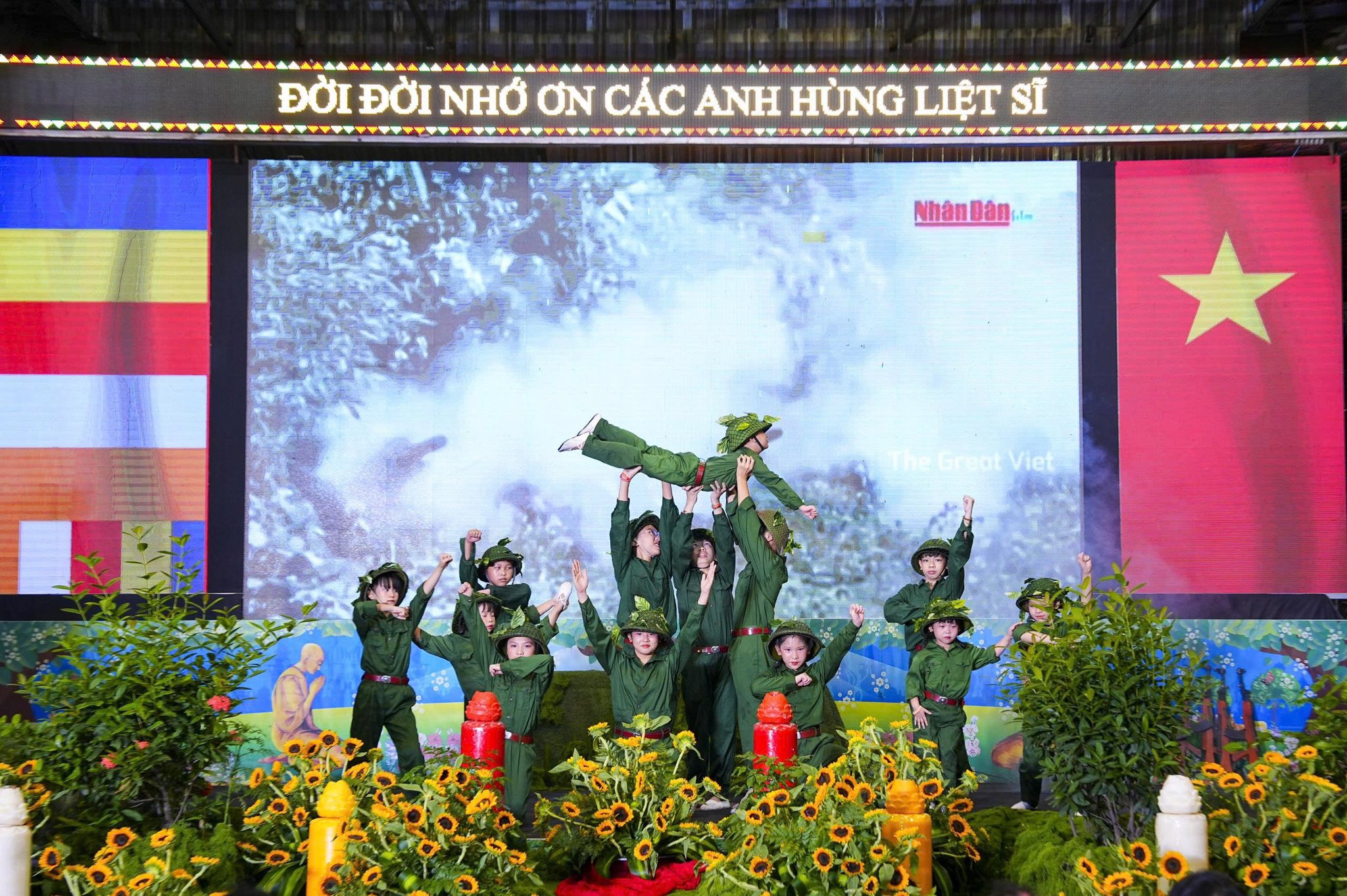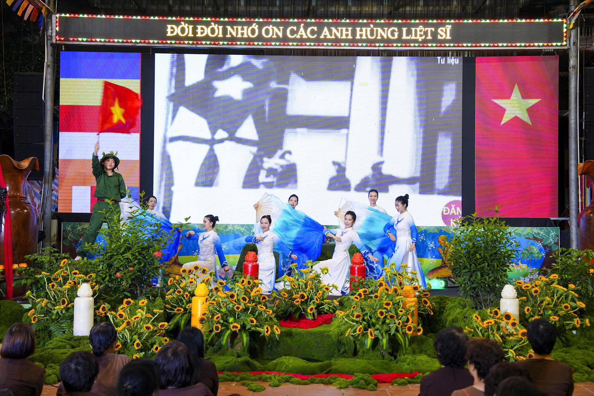 Chương trình nghệ thuật và sân khấu được Ban tổ chức thiết kế, dàn dựng rất công phu, một dải lụa đỏ được kéo từ trên cao xuống dưới sân khấu, tượng trưng cho dòng máu của cha ông, dòng máu các anh hùng liệt sĩ đã đổ xuống để chúng ta có cuộc sống ấm no, hạnh phúc như ngày hôm nay. Đêm nghệ thuật có sự góp mặt của các văn nghệ sĩ Nhà hát nghệ thuật truyền thống Hà Nội, các ca sĩ, nghệ sĩ Phật tử Ban văn nghệ chùa Tân Hải, các cháu thiếu niên nhi đồng nhóm mùa “Từ Tâm”… Rất nhiều ca khúc ý nghĩa, những hoạt cảnh, những vở kịch ngắn đầy xúc động, trình diễn lại những chiến thắng oanh liệt của Dân tộc ta qua các cuộc chiến tranh chống thực dân Pháp và đế quốc Mỹ đã được các văn nghệ sĩ thể hiện một cách hoàn hảo, làm cho không khí trong chốn thiền môn trở nên linh thiêng, sâu lắng, rất nhiều những giọt nước mắt đã rơi khi nhớ tới công ơn của các Anh hùng, liệt sĩ.