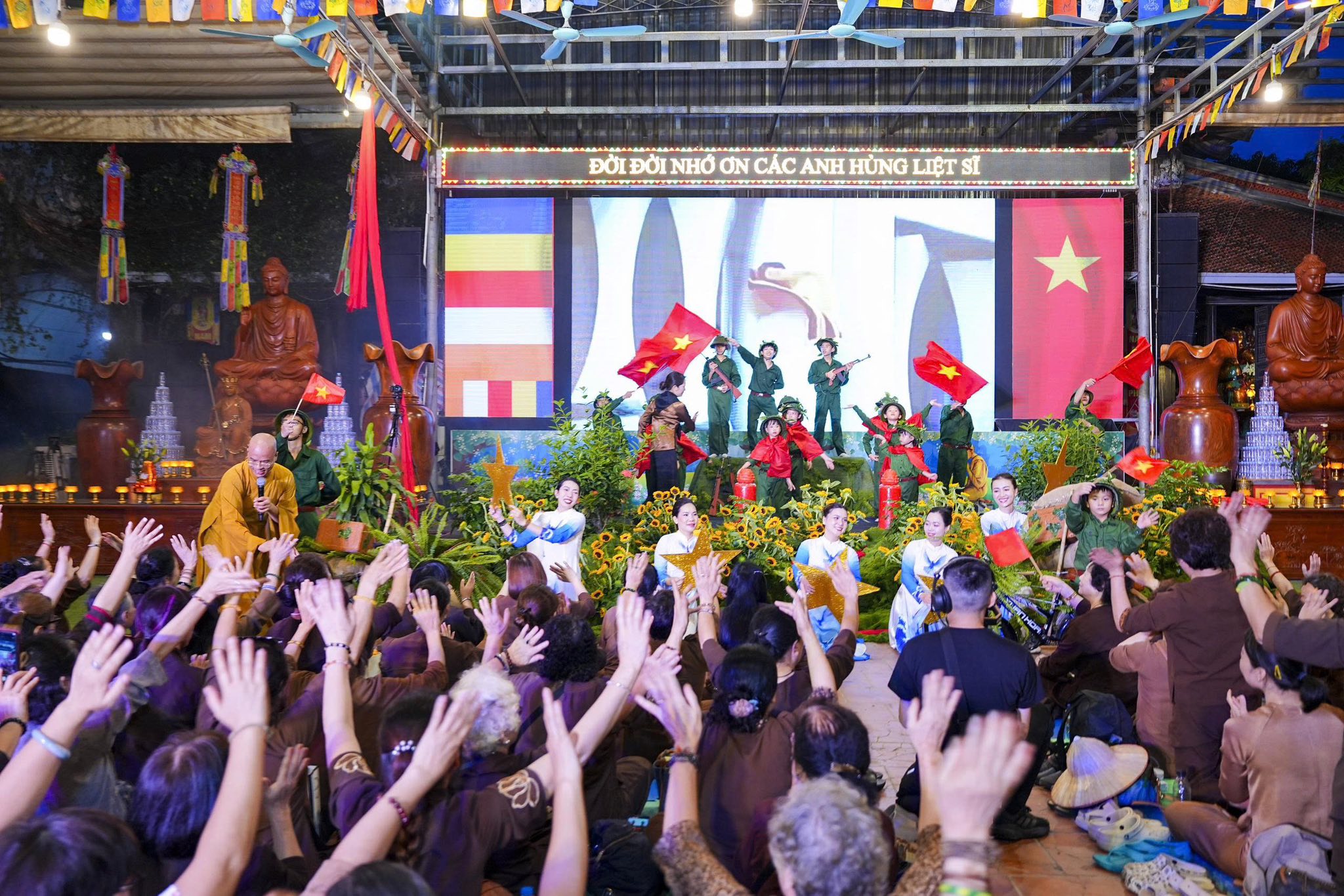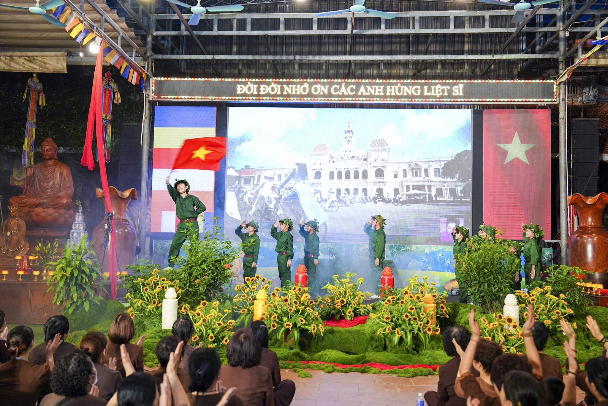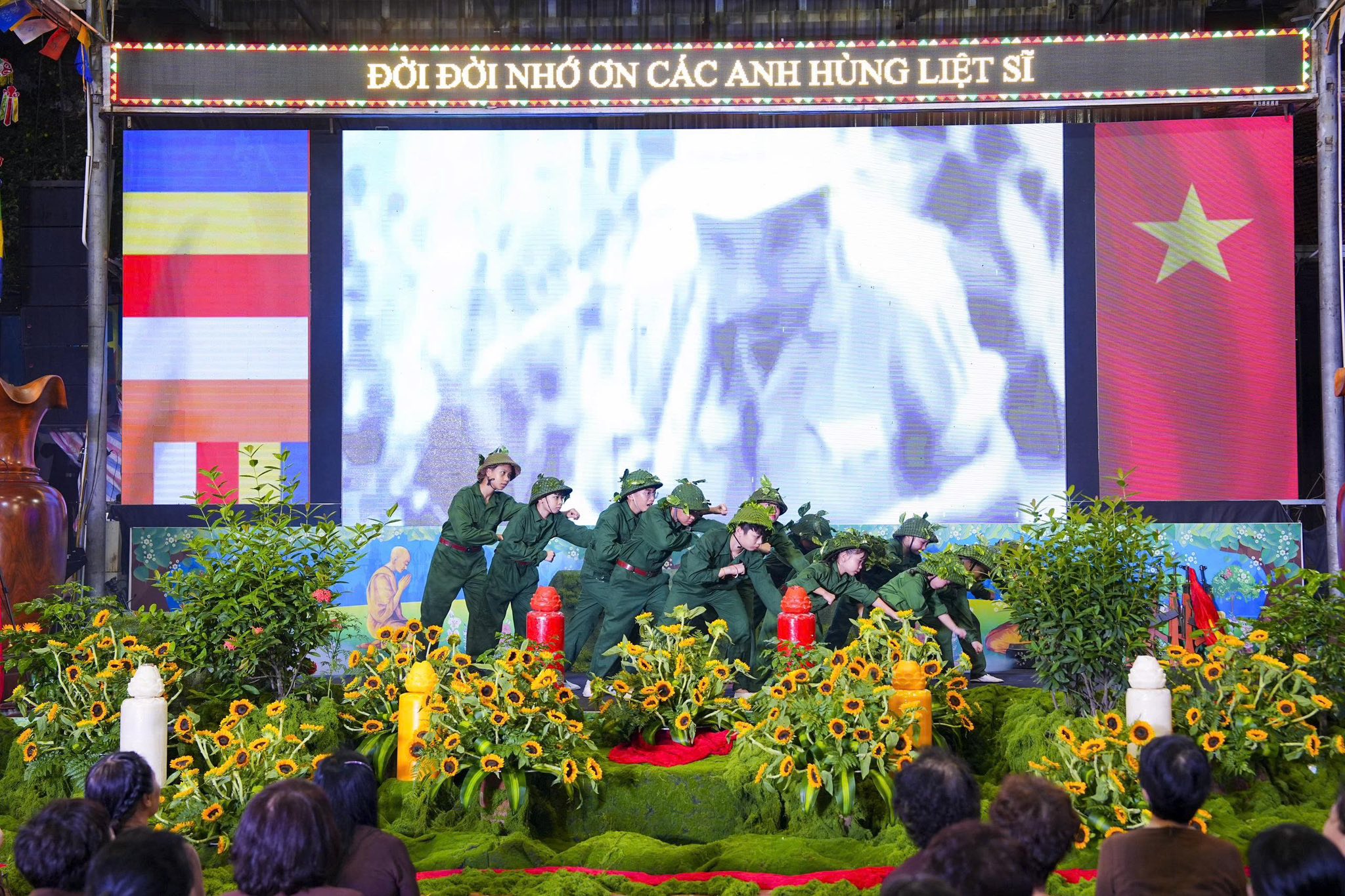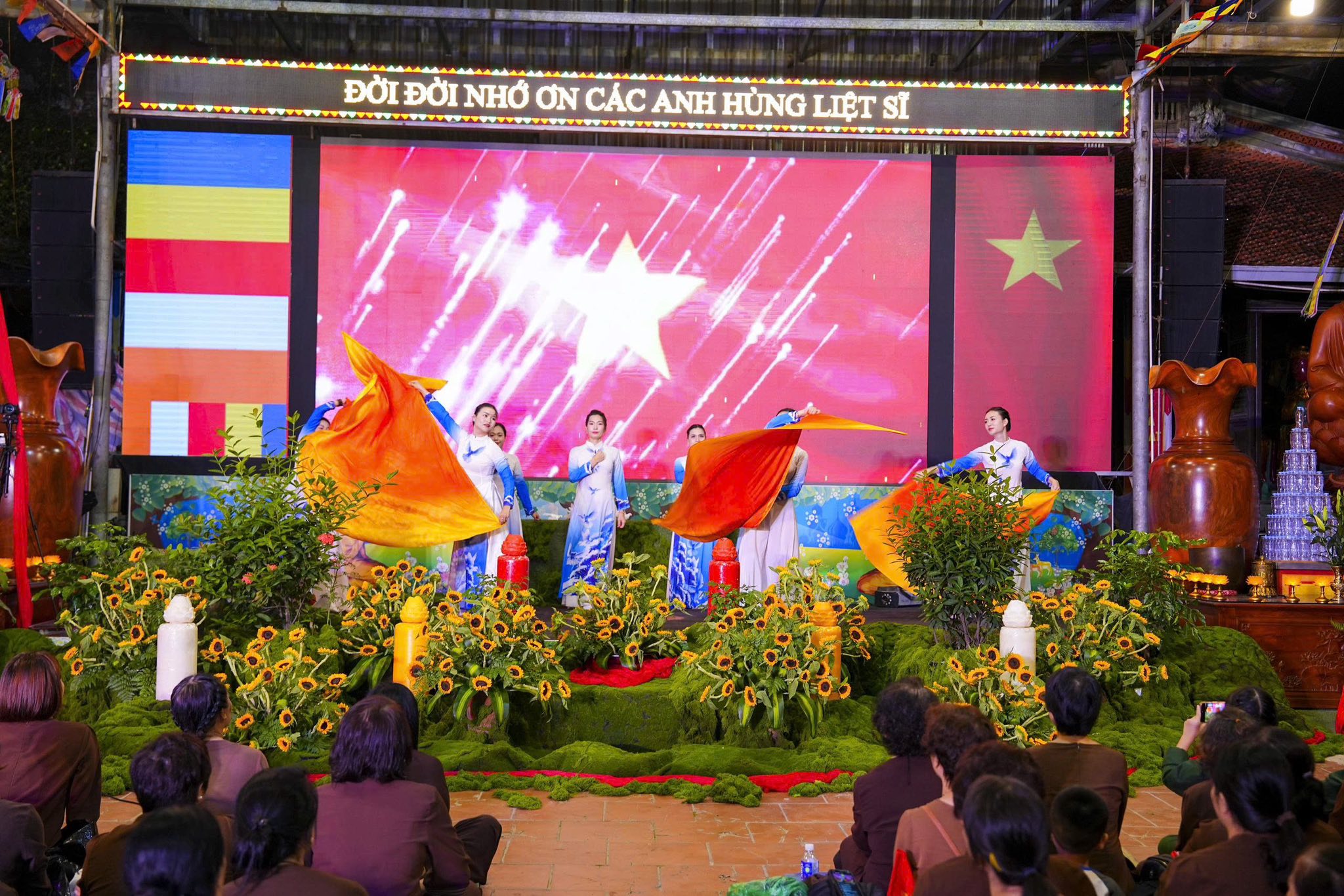 Chương trình nghệ thuật và sân khấu được Ban tổ chức thiết kế, dàn dựng rất công phu, một dải lụa đỏ được kéo từ trên cao xuống dưới sân khấu, tượng trưng cho dòng máu của cha ông, dòng máu các anh hùng liệt sĩ đã đổ xuống để chúng ta có cuộc sống ấm no, hạnh phúc như ngày hôm nay. Đêm nghệ thuật có sự góp mặt của các văn nghệ sĩ Nhà hát nghệ thuật truyền thống Hà Nội, các ca sĩ, nghệ sĩ Phật tử Ban văn nghệ chùa Tân Hải, các cháu thiếu niên nhi đồng nhóm mùa “Từ Tâm”… Rất nhiều ca khúc ý nghĩa, những hoạt cảnh, những vở kịch ngắn đầy xúc động, trình diễn lại những chiến thắng oanh liệt của Dân tộc ta qua các cuộc chiến tranh chống thực dân Pháp và đế quốc Mỹ đã được các văn nghệ sĩ thể hiện một cách hoàn hảo, làm cho không khí trong chốn thiền môn trở nên linh thiêng, sâu lắng, rất nhiều những giọt nước mắt đã rơi khi nhớ tới công ơn của các Anh hùng, liệt sĩ.