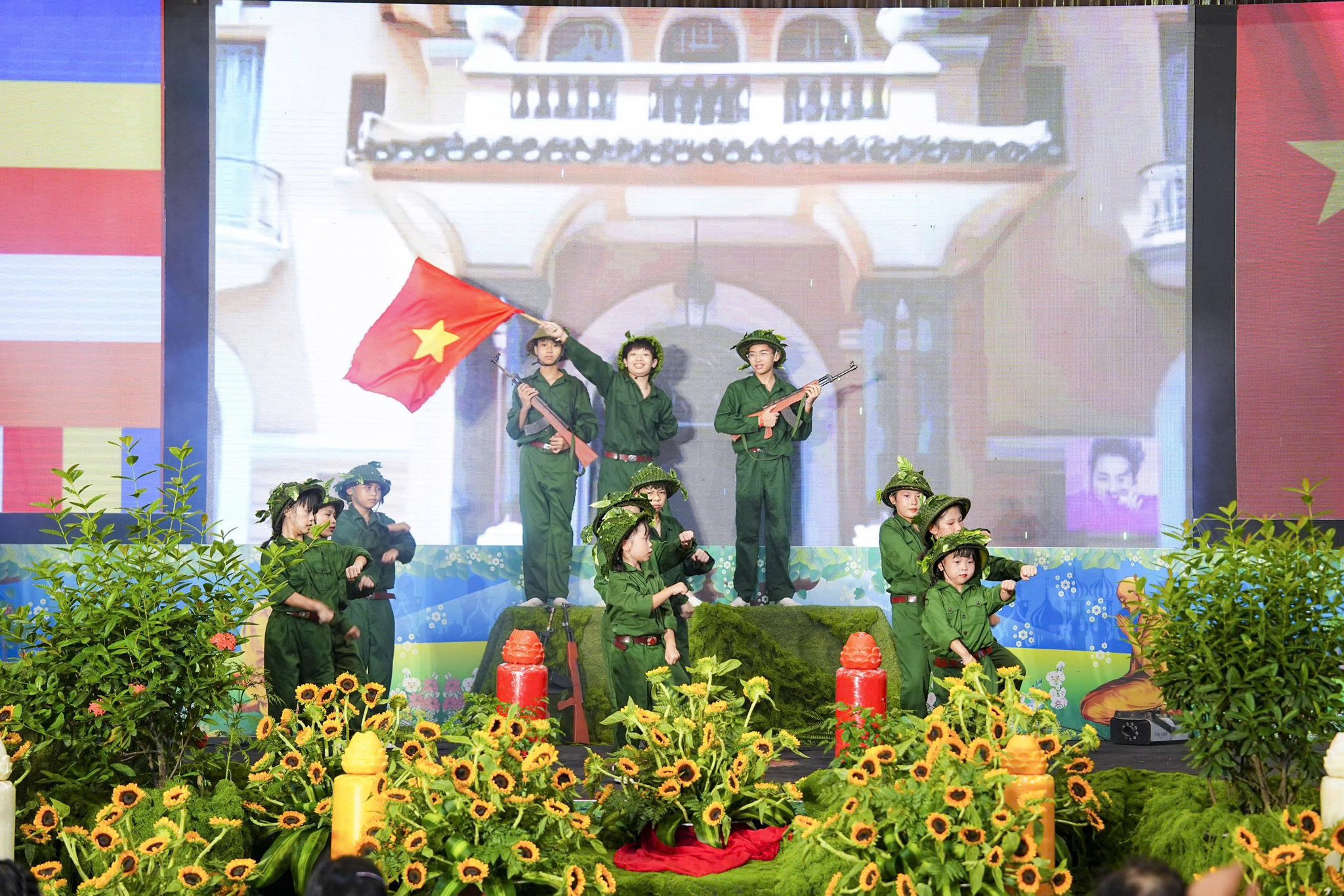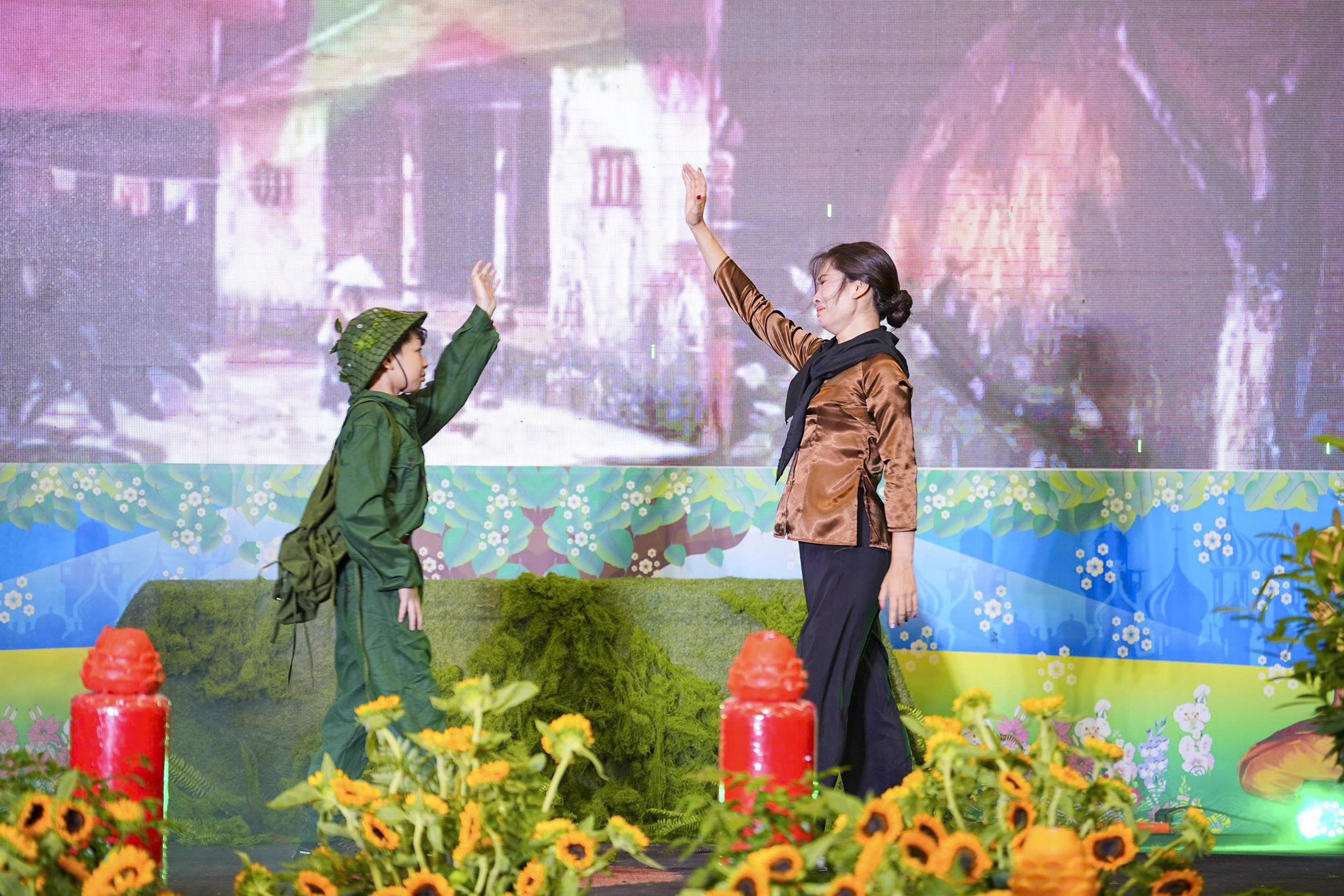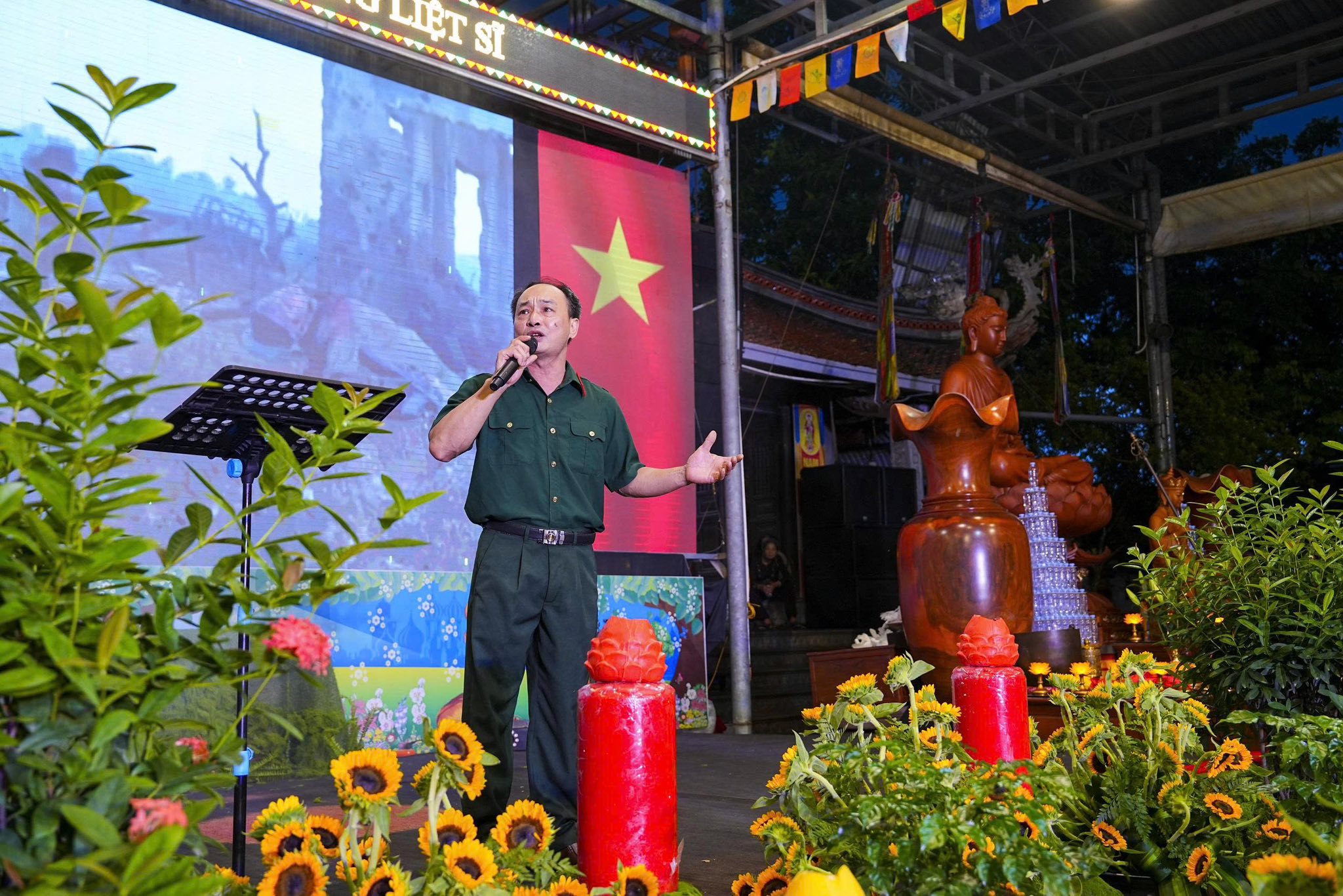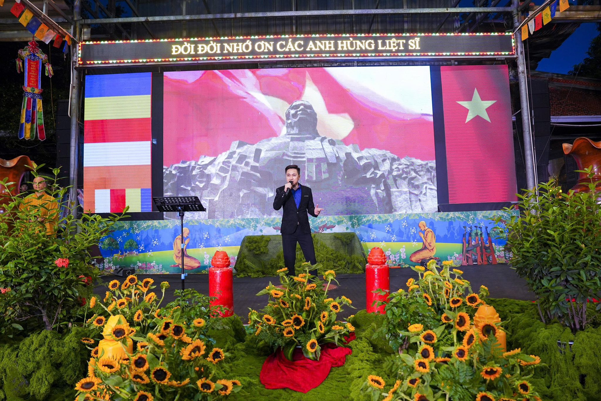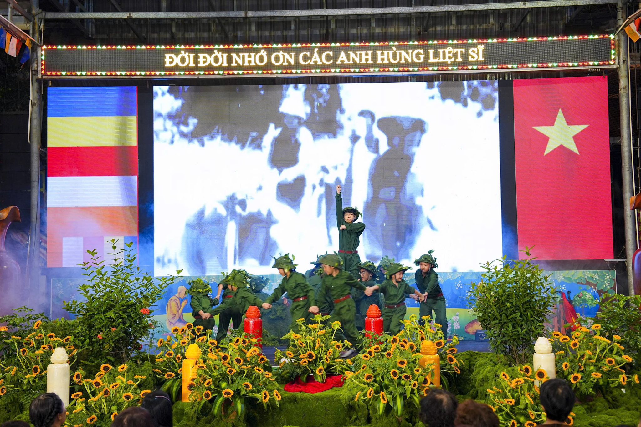 Chương trình nghệ thuật và sân khấu được Ban tổ chức thiết kế, dàn dựng rất công phu, một dải lụa đỏ được kéo từ trên cao xuống dưới sân khấu, tượng trưng cho dòng máu của cha ông, dòng máu các anh hùng liệt sĩ đã đổ xuống để chúng ta có cuộc sống ấm no, hạnh phúc như ngày hôm nay. Đêm nghệ thuật có sự góp mặt của các văn nghệ sĩ Nhà hát nghệ thuật truyền thống Hà Nội, các ca sĩ, nghệ sĩ Phật tử Ban văn nghệ chùa Tân Hải, các cháu thiếu niên nhi đồng nhóm mùa “Từ Tâm”… Rất nhiều ca khúc ý nghĩa, những hoạt cảnh, những vở kịch ngắn đầy xúc động, trình diễn lại những chiến thắng oanh liệt của Dân tộc ta qua các cuộc chiến tranh chống thực dân Pháp và đế quốc Mỹ đã được các văn nghệ sĩ thể hiện một cách hoàn hảo, làm cho không khí trong chốn thiền môn trở nên linh thiêng, sâu lắng, rất nhiều những giọt nước mắt đã rơi khi nhớ tới công ơn của các Anh hùng, liệt sĩ.