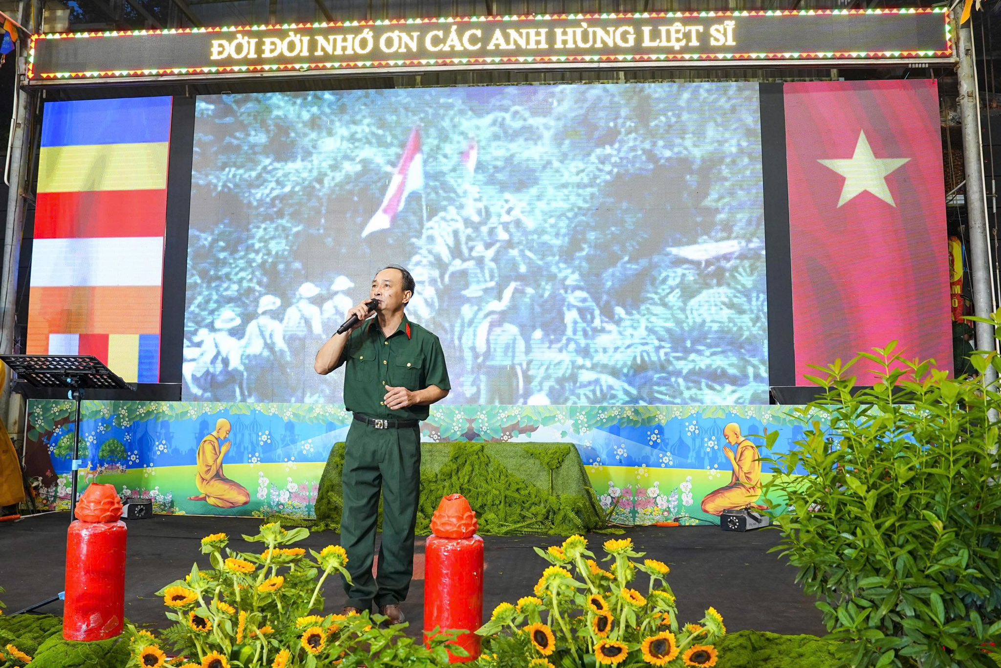 Để ghi nhớ công ơn của các Anh hùng Liệt sĩ đã chiến đấu anh dũng, hy sinh cho Độc lập, tự do của Đất nước, Đại đức Thích Quảng Hiếu – Bản tự chùa Tân Hải đã cùng các Phật tử trong đạo tràng tổ chức Pháp hội cầu siêu, tưởng niệm, tri ân các Anh hùng liệt sĩ thông qua các hoạt động rất thiết thực và ý nghĩa. Đặc biệt, nhân kỷ niệm 78 năm ngày Thương binh liệt sĩ, năm nay chùa Tân Hải đã tổ chức một chương trình nghệ thuật đặc sắc và ấn tượng với chủ đề: “Vì nghĩa Nước non”, nhằm tri ân những người lính đã viết nên biết bao trang sử hào hùng của dân tộc Việt Nam.