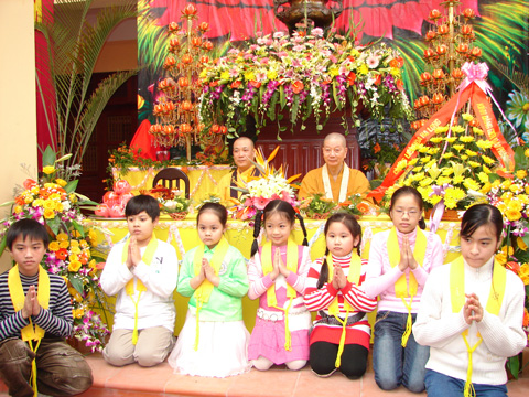 Thiếu nhi Phật tử dâng hoa cúng dàng chư tôn đức