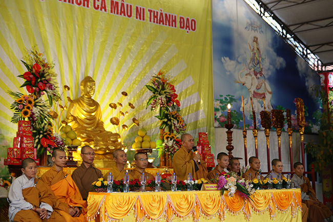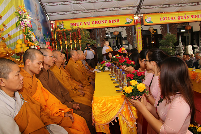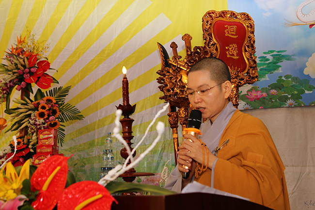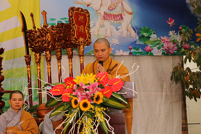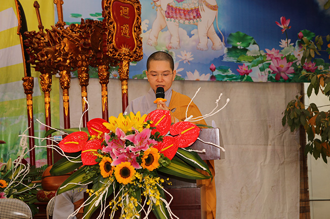 Mở đầu chương trình là lời phát biểu khai mạc của sư cô trụ trì Thích Đồng Hoà, Sư cô đã nhận mạnh: “Sáng hôm nay bốn chúng đệ tử đức Như Lai có mặt tại đây, đồng tâm hướng về thánh địa Bồ đề đạo tràng tại Ấn Độ, hồi tưởng lại khung cảnh hân hoan của ngày Bồ Tát Tất Đạt Đa thành đạo dưới cây Tất bát la sum xuê cành lá đã che nắng che mưa suốt 49 ngày đêm, đem đến cho nhân loại ánh sáng chân lý tối thượng, xua tan bóng đêm u tối, mở ra kỷ nguyên hòa bình, an lạc thức tỉnh và giải thoát cho tất cả chúng sinh.