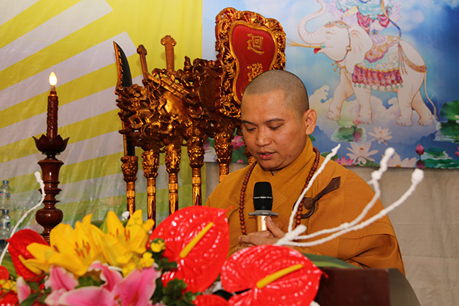 ĐĐ Thích Quảng Phú đã thay mặt Chư tôn đức Tăng Ni tuyên đọc ý nghĩa ngày Đức Phật thành đạo. ĐĐ đã nhắc lại lời đại phát nguyện của Bồ Tát Tất Đạt Đa khi ngồi dưới cội cây Tất bát la hướng về phương Đông phát nguyện rằng: “Từ nay nếu không chứng được đạo quả Bồ đề, thì dù thịt nát xương tan ta quyết không rời khỏi chỗ này, với tấm lòng đại bi, đại trí, đại nguyện, với tinh thần dũng mãnh tinh tiến, Bồ tát đã ngồi tư duy 49 ngày dưới gốc cây chiến đấu với bọn giặc phiền não ở nội tâm như tham, sân, si, mạn, nghi và với giặc thiên ma do ma vương ba tuần chỉ huy. Ngài đã chiến thắng được mọi ma chướng trong ngoài, tâm trí được khai thông, cuối cùng vào đêm mùng 8 tháng 12 canh hai ngài chứng được quả túc mệnh minh thấy rõ tất cả quãng đời của mình trong tam giới, giữa đêm canh ba ngài chứng được thiên nhãn minh thấy rõ tất cả bản thể của vũ trụ và nguyên nhân cấu tạo của nó, đến canh tư chứng được lậu tận minh, thấy rõ nguồn gốc của đau khổ và phương pháp dứt trừ đau khổ để được thoát khỏi sinh tử luân hồi”.