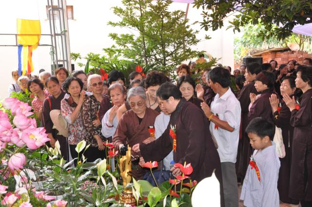 Cuối cùng là nghi lễ tắm Phật – nghi lễ trang nghiêm nhất của buổi lễ. Đông đảo Phật tử đạo tràng đã cùng tham gia vào nghi thức tắm Phật trong niềm hoan hỷ, an lạc của ngày Đức Từ Phụ đản sinh.