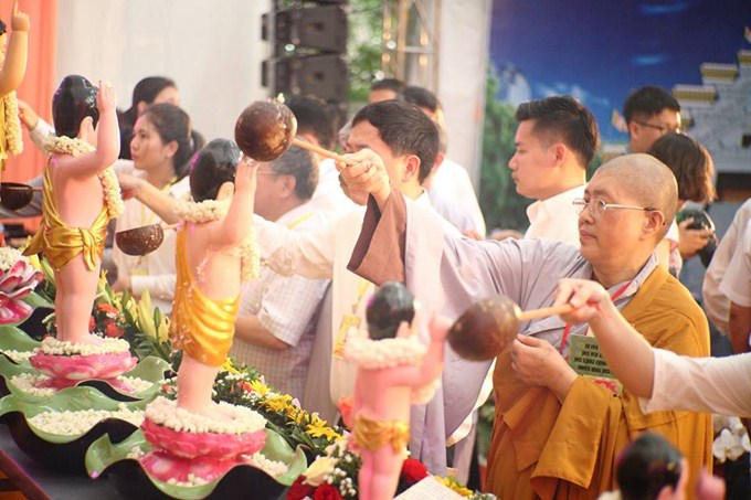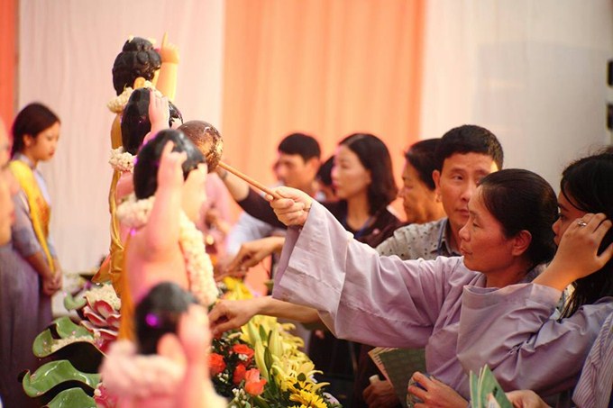Toàn thể đạo tràng đã trang nghiêm nghe ba hồi chuông trống bát nhã cung đón Đức Phật đản sinh. Chư Tôn đức cử hành nghi lễ khánh đản và thực hiện nghi thức tắm Phật.