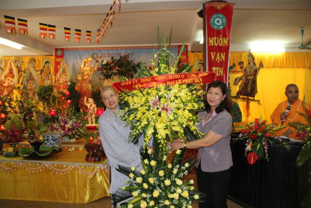 Tiếp đó, thay mặt chính quyền các cấp, Bà Trần Thị Ngọc – Phó Chủ tịch UBND Quận Long Biên bày tỏ niềm vui tham dự Đại lễ Phật đản Q.Long Biên tặng hoa và cảm nhận sự đóng góp tích cực của Phật giáo Quận Long Biên vào sự phát triển đi lên của Quận, đồng thời tạo điều kiện tốt hơn cho khối đại đoàn kết toàn dân.