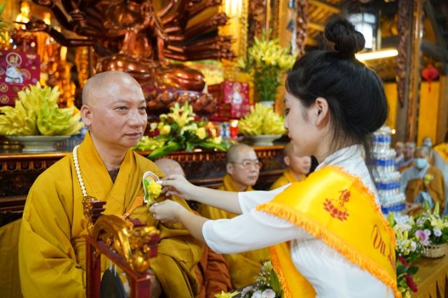 Sau đó là nghi thức cài hoa hồng – một nghi thức vô cùng thiêng liêng nhắc nhở mỗi người nhớ nghĩ về ân đức sinh thành dưỡng dục sâu dày của hai đấng song thân. Trên những chiếc y vàng giải thoát của quý Thầy, từng đóa hồng vàng được đại diện Phật tử cung kính cài lên nơi ngực áo. Đóa hoa hồng màu vàng là màu của sự giải thoát như vô thượng phúc điền y, màu của tuệ giác, tượng trưng cho sự buông bỏ, xả ly, không chấp thủ và thành tựu giải thoát. Trên nền nhạc phẩm Bông Hồng Cài Áo, hàng Phật tử tại gia cảm nhận sự thiêng liêng, gần gũi khi được đón nhận những bông hồng, nâng niu, cẩn trọng cài lên ngực. Hoa hồng đỏ thắm khi còn cha lẫn mẹ, khi mất cha mà còn mẹ sẽ cài hoa màu hồng, đóa hoa màu trắng dành cho người mất cả cha và mẹ.
