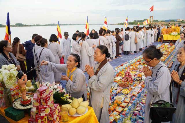 Ngoài ra, chư Tôn đức cùng toàn thể Phật tử đã tụng kinh Chuyển Pháp Luân và làm lễ mộc dục giữa mênh mang sông nước, để cầu nguyện cho Phật pháp trường tồn, thế giới hòa bình, chúng sinh an lạc.