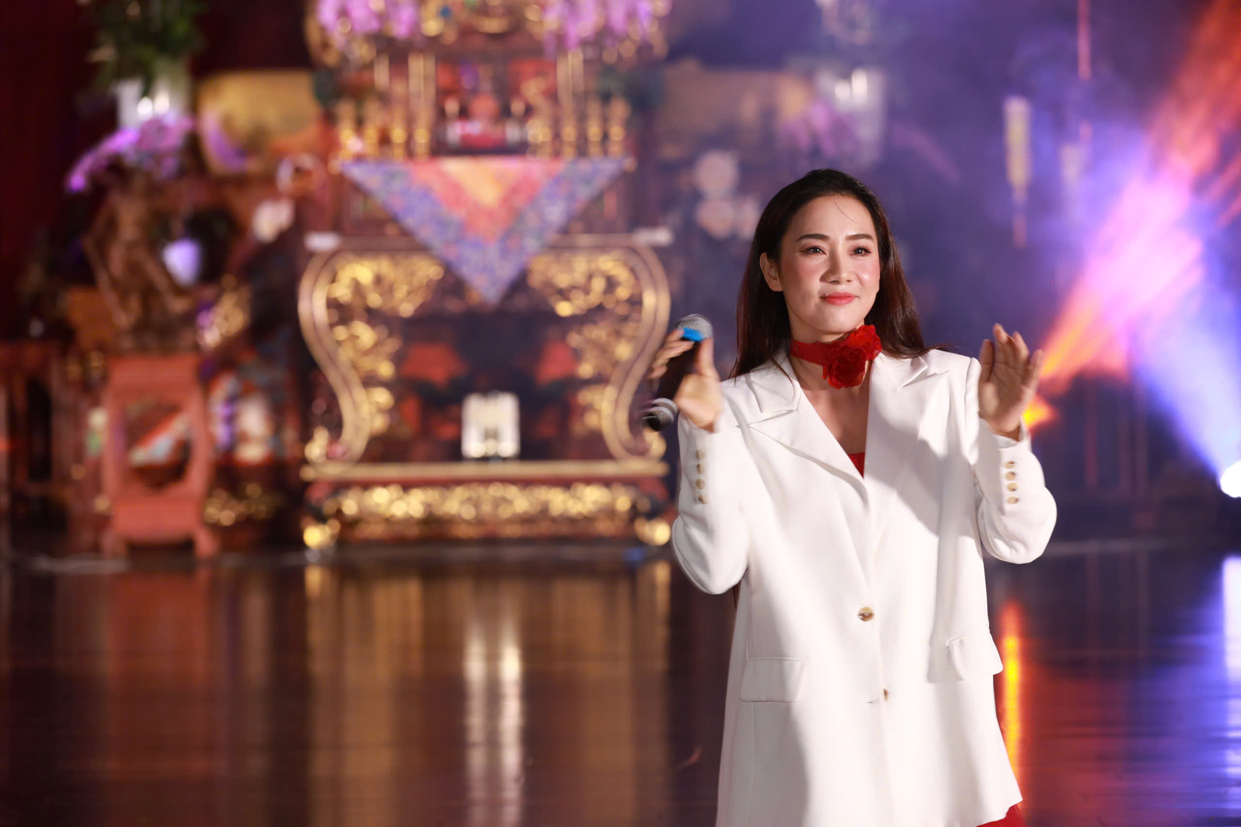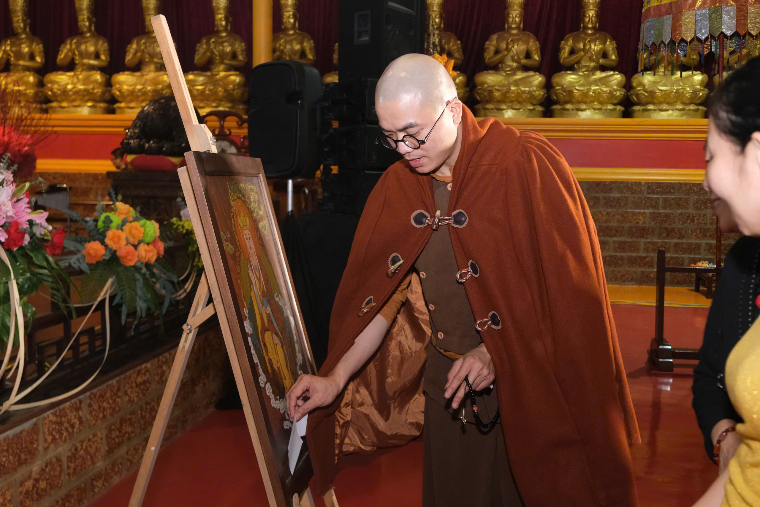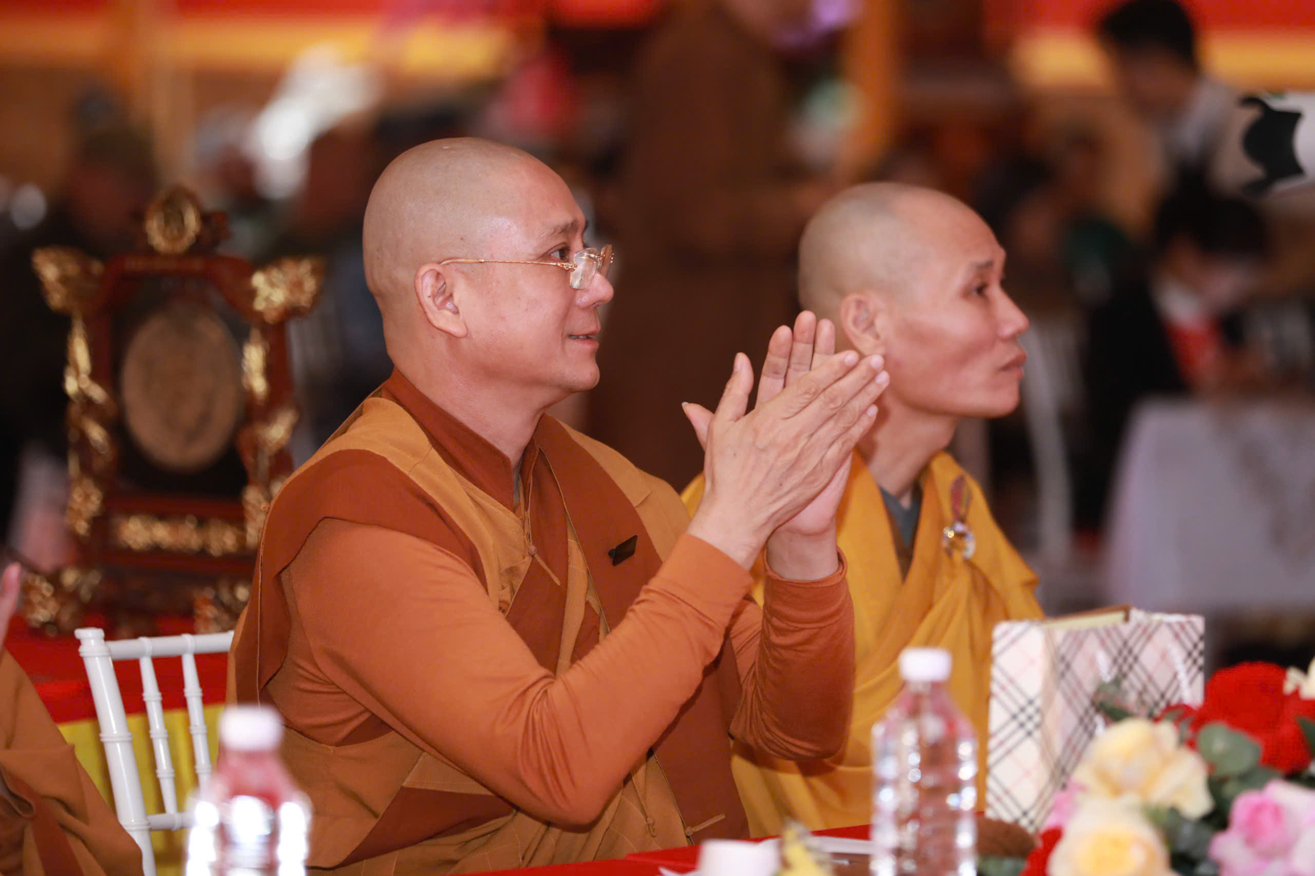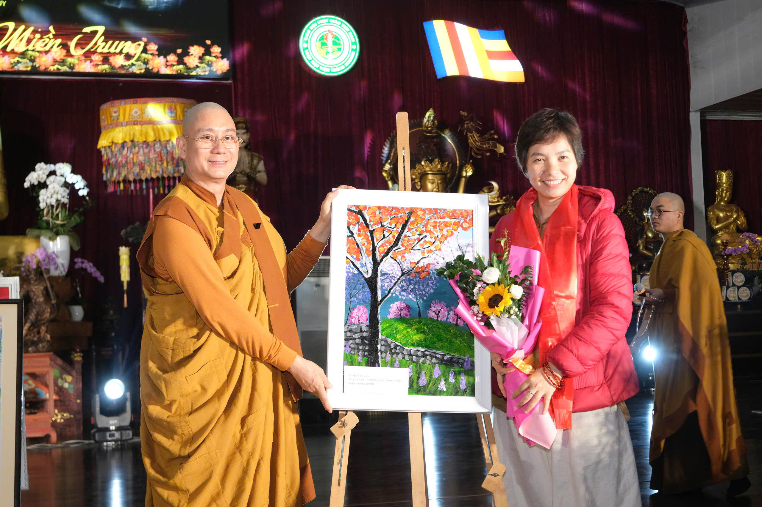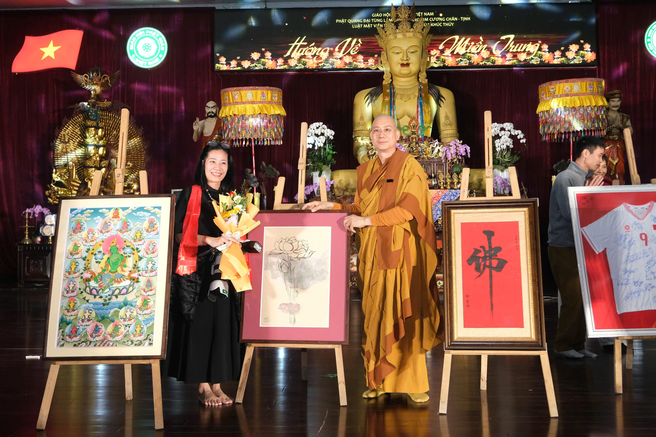 Thượng tọa trụ trì tặng hoa tri ân các văn nghệ sĩ đã tới tham dự và biểu diễn tại đêm nhạc gây quỹ từ thiện ủng hộ đồng bào miền Trung