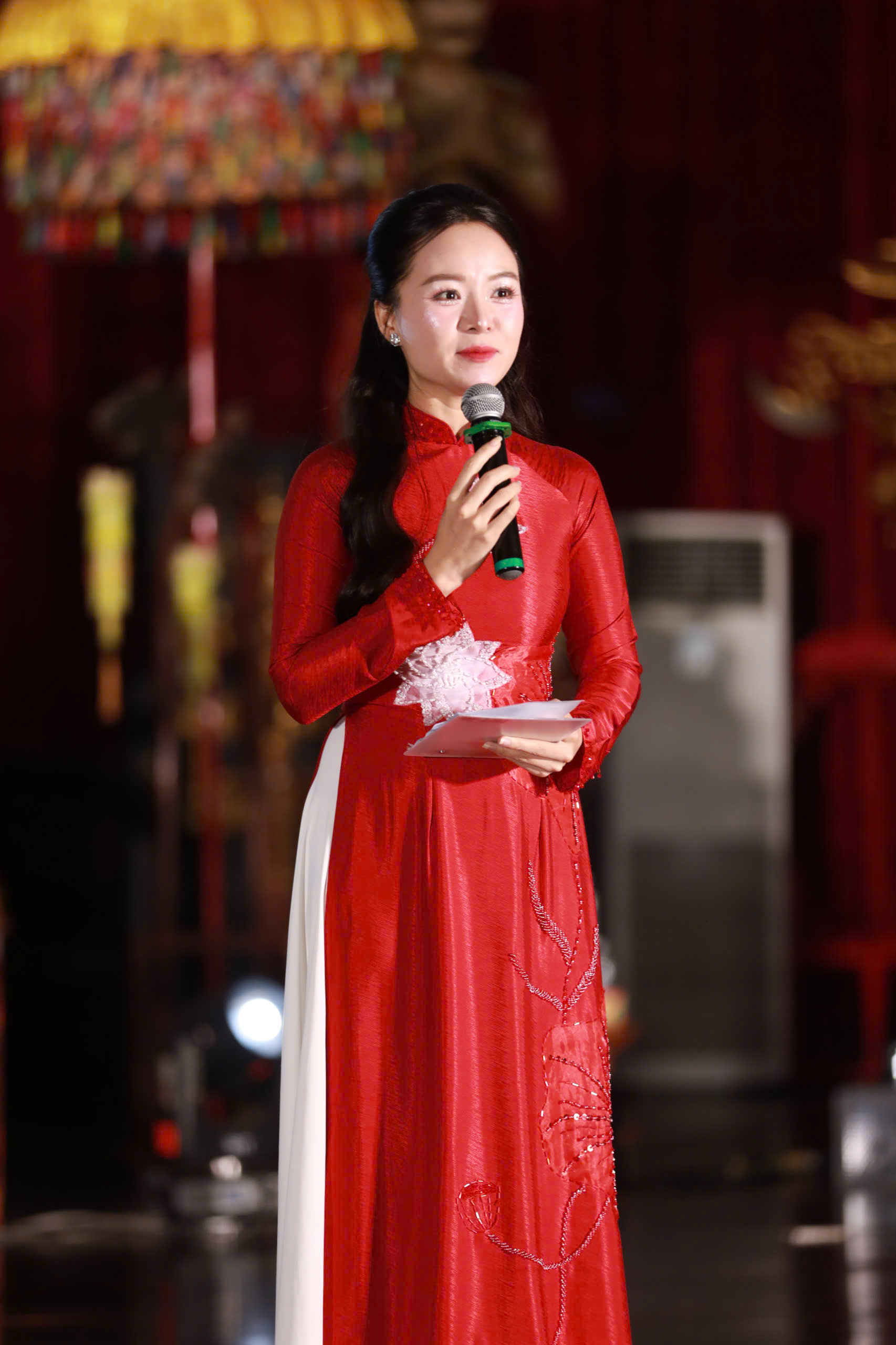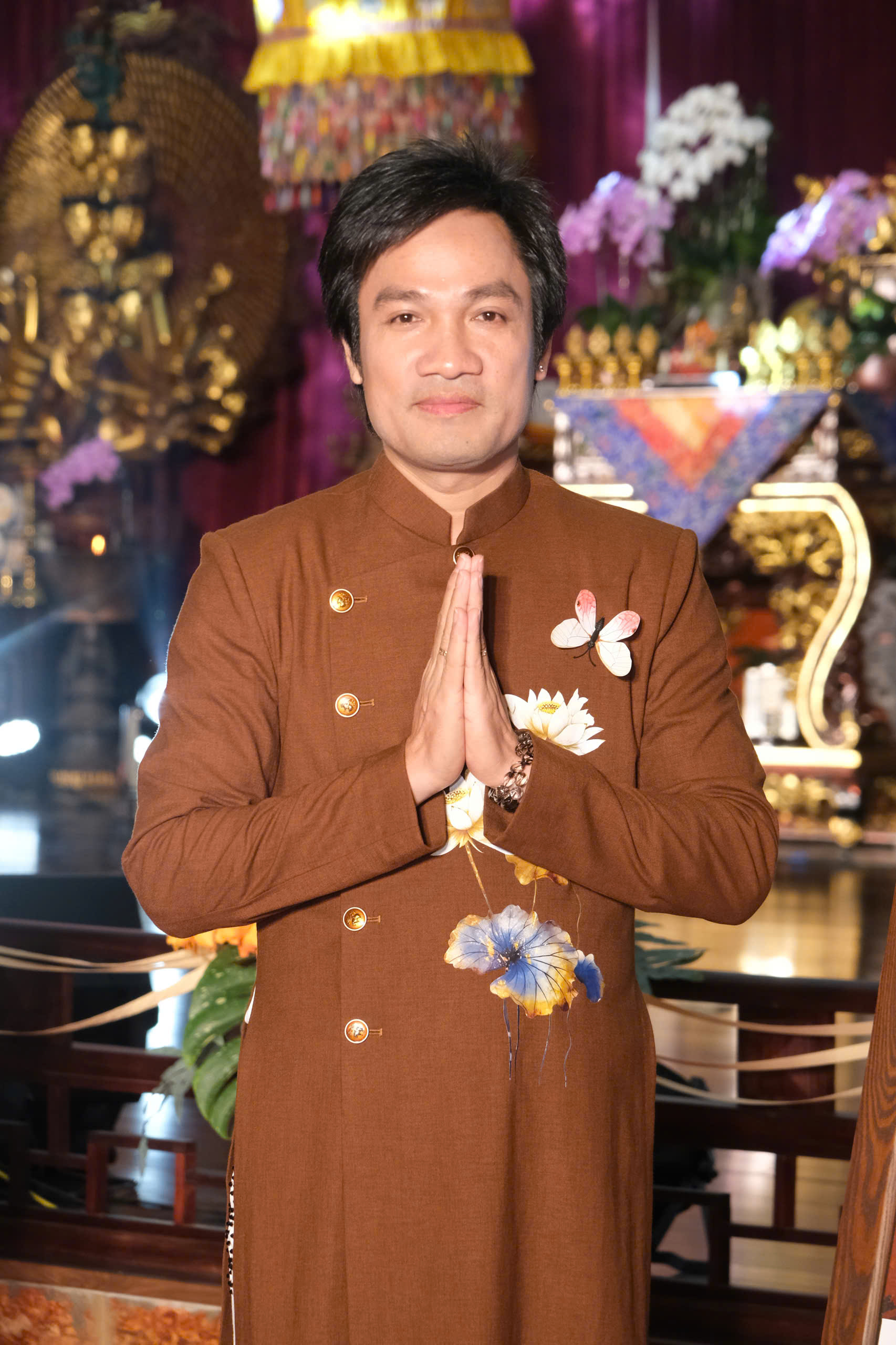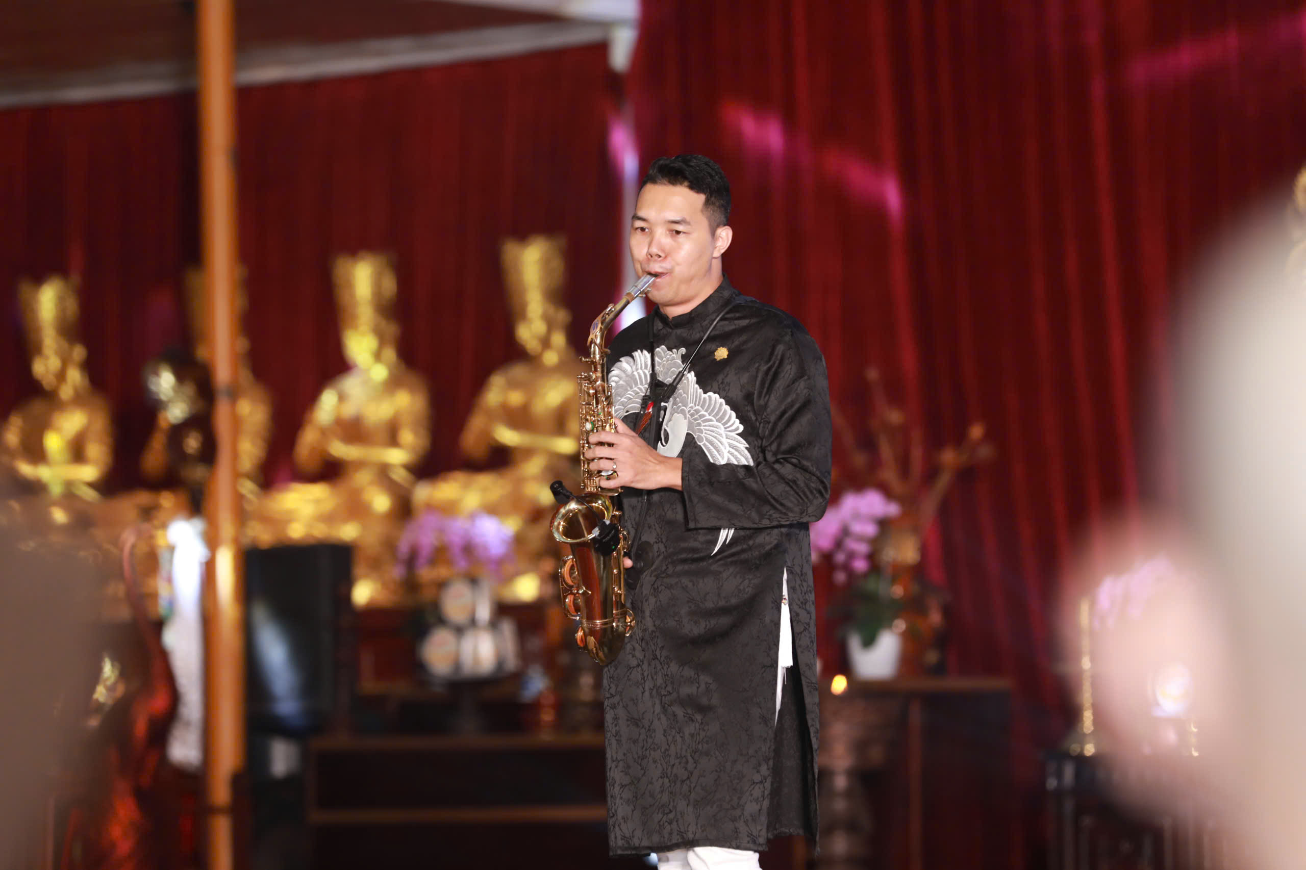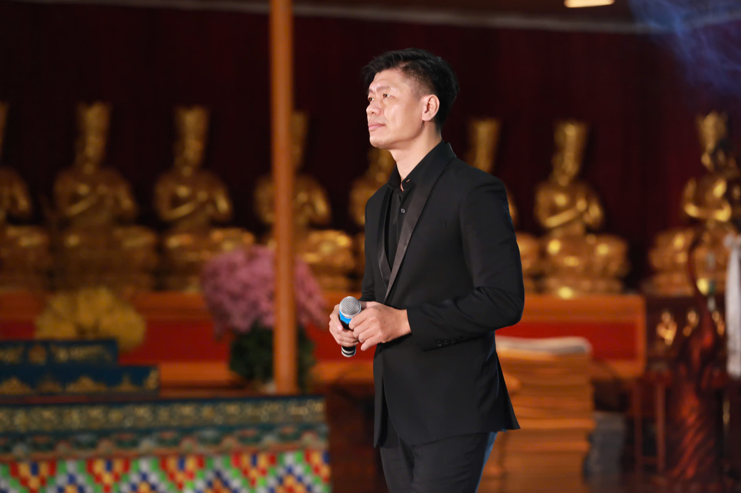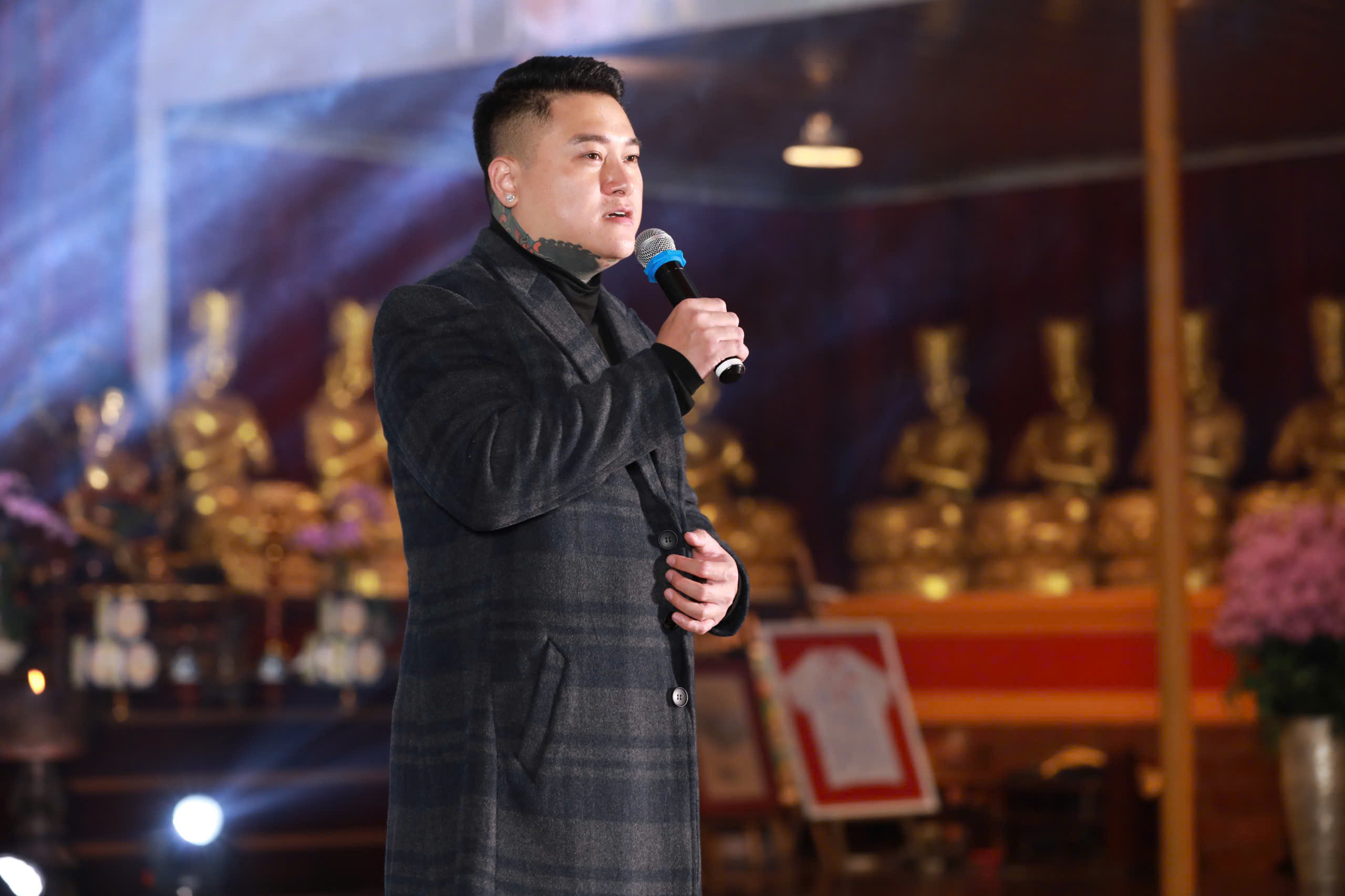 Thượng tọa trụ trì tặng hoa tri ân các văn nghệ sĩ đã tới tham dự và biểu diễn tại đêm nhạc gây quỹ từ thiện ủng hộ đồng bào miền Trung