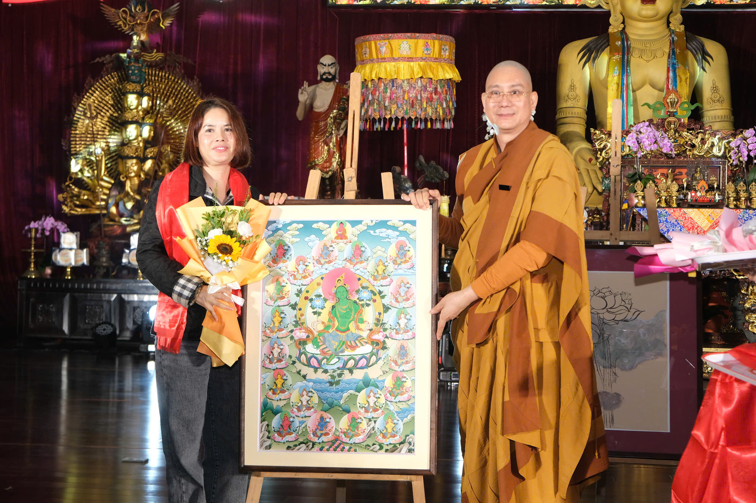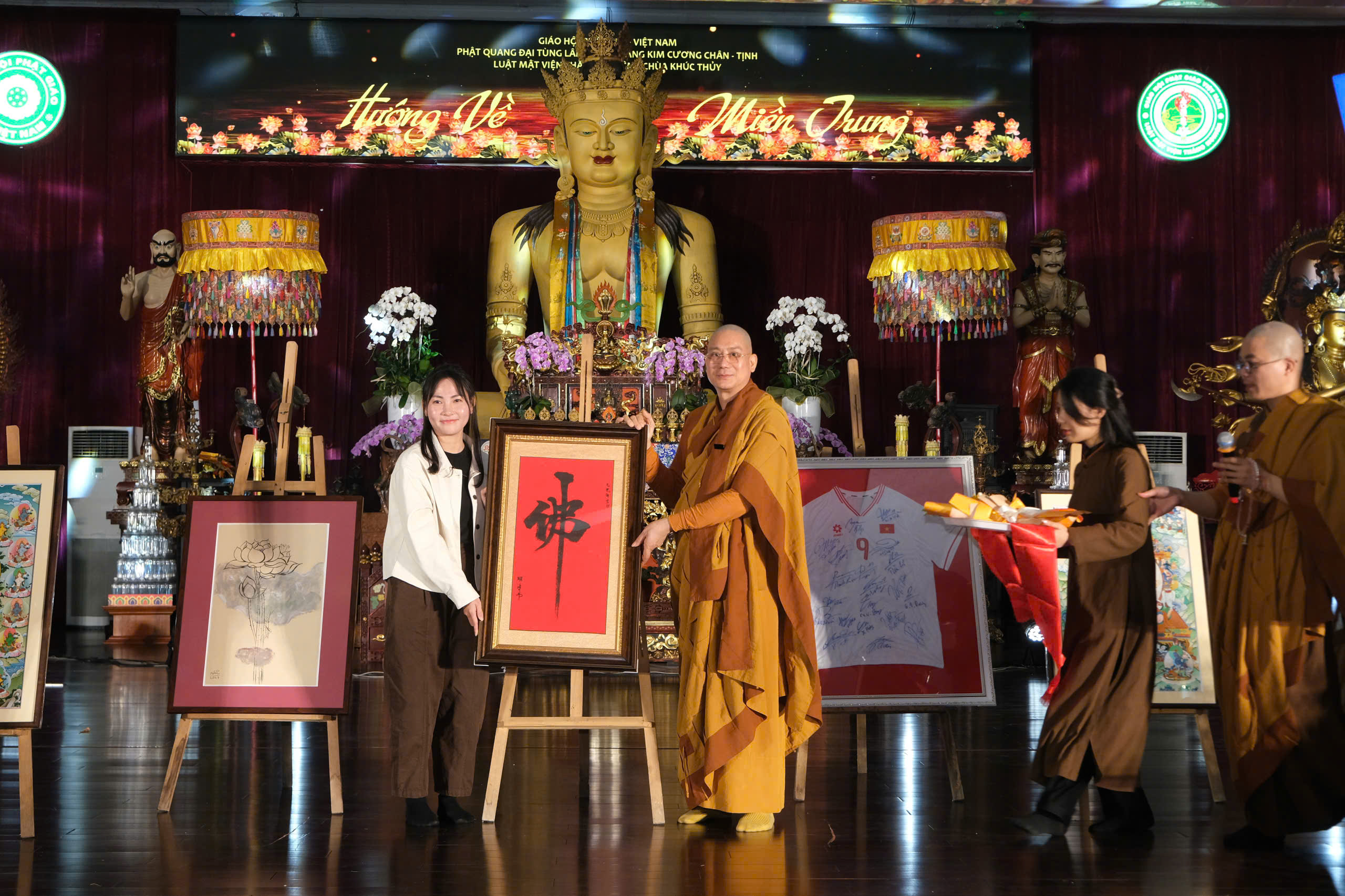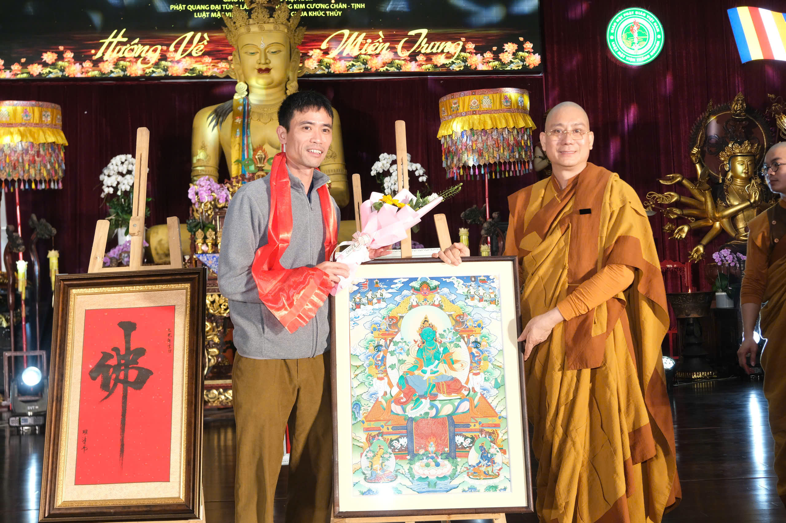 Thượng tọa trụ trì tặng hoa tri ân các văn nghệ sĩ đã tới tham dự và biểu diễn tại đêm nhạc gây quỹ từ thiện ủng hộ đồng bào miền Trung