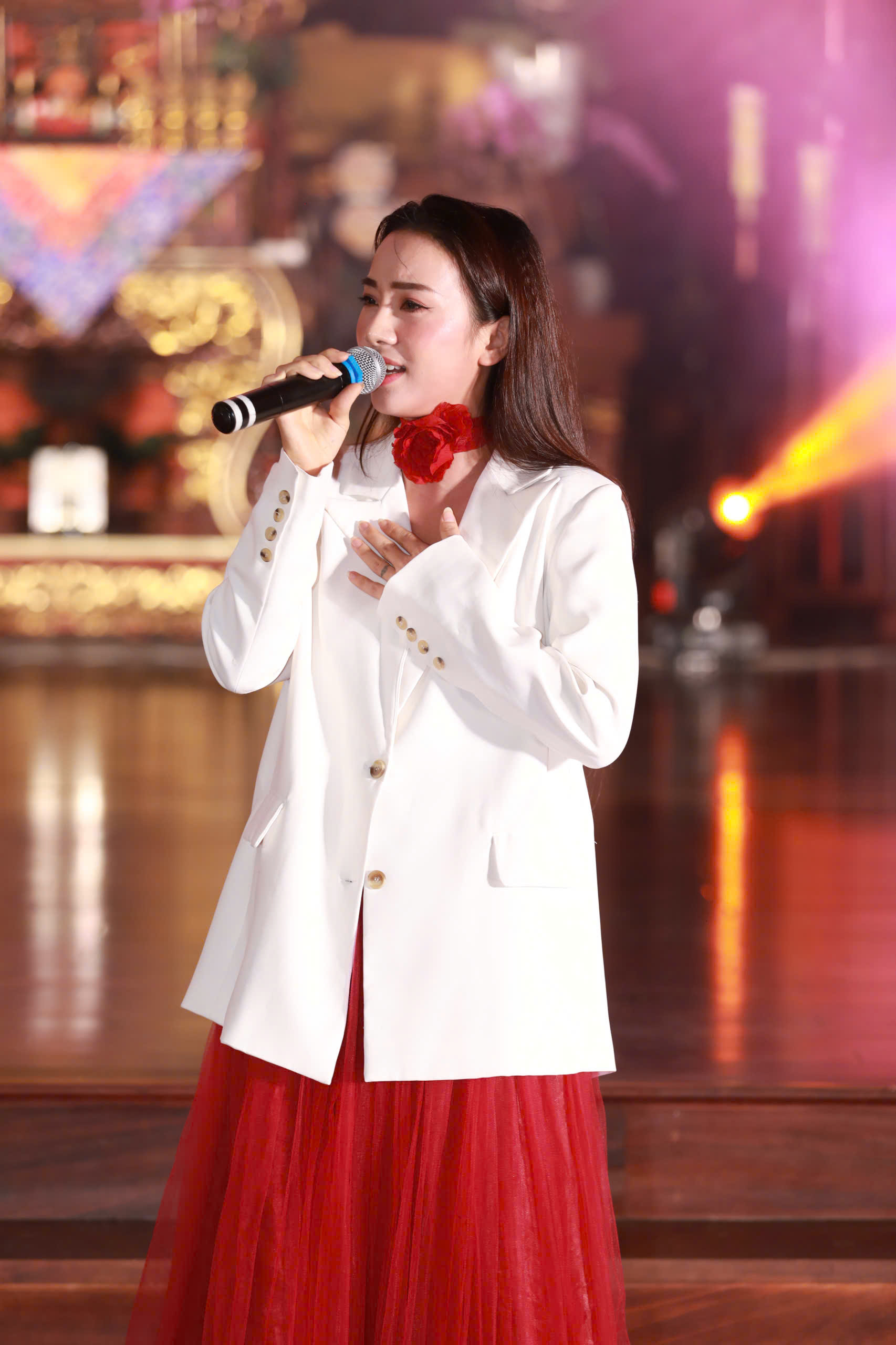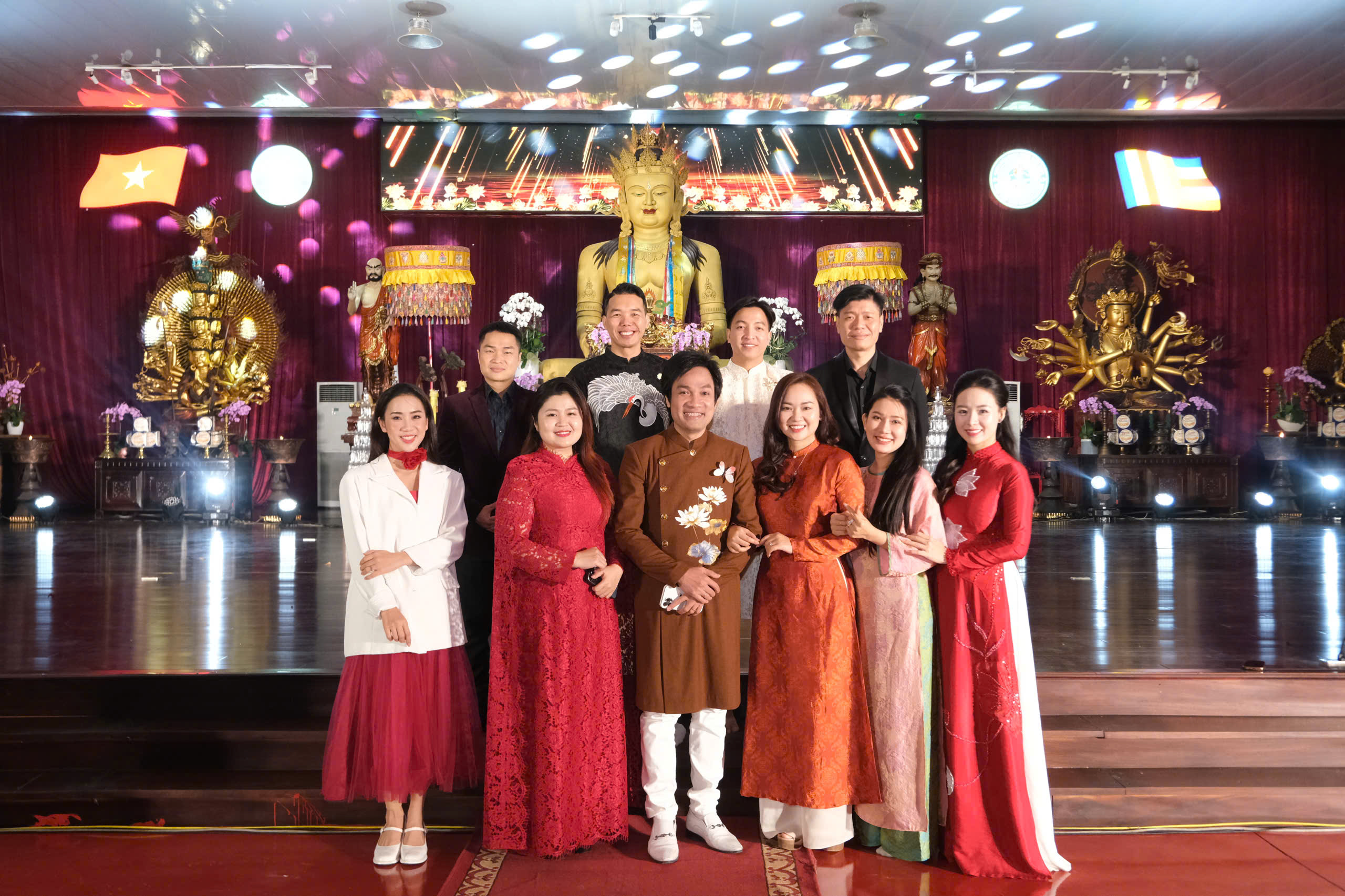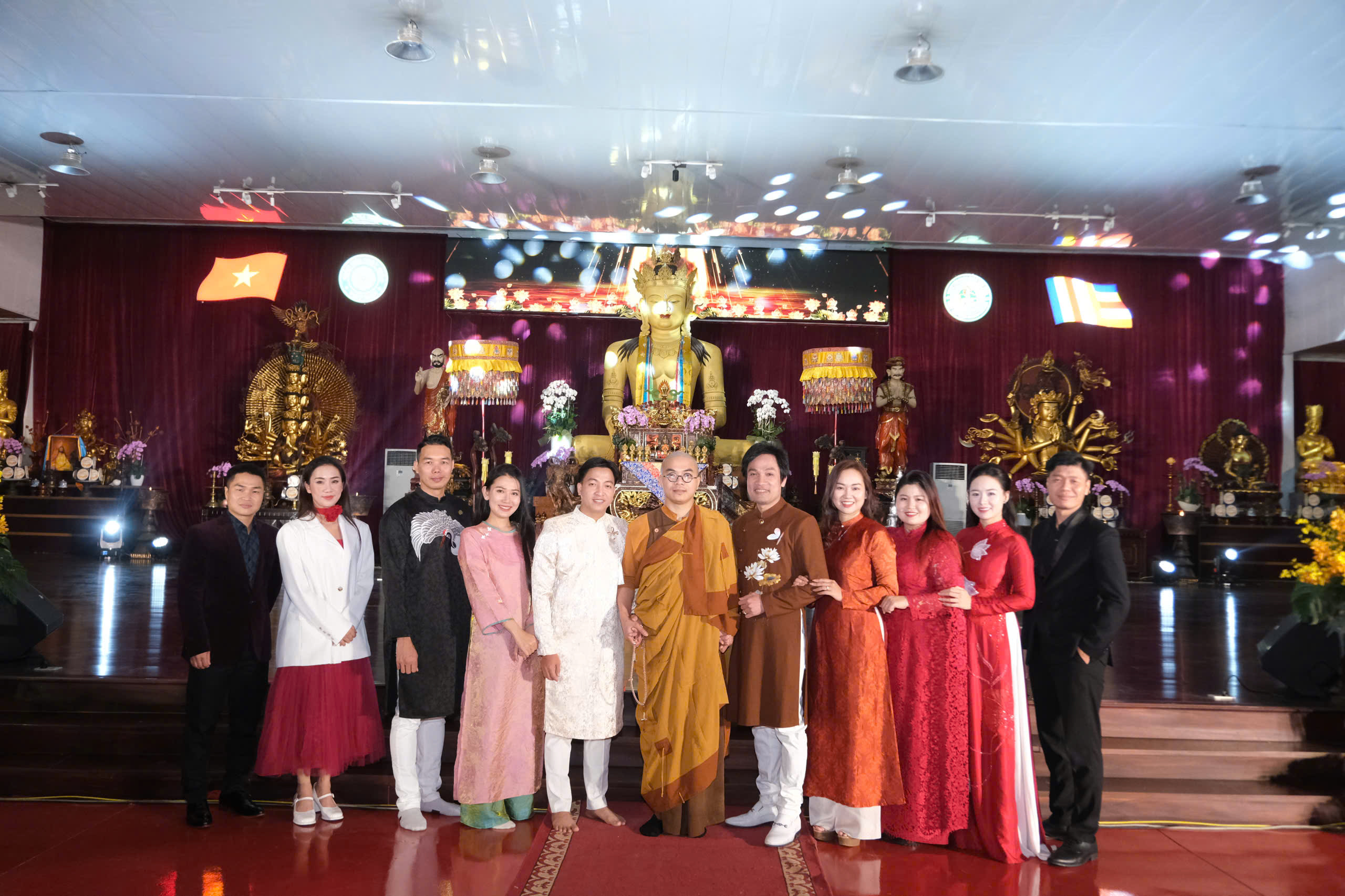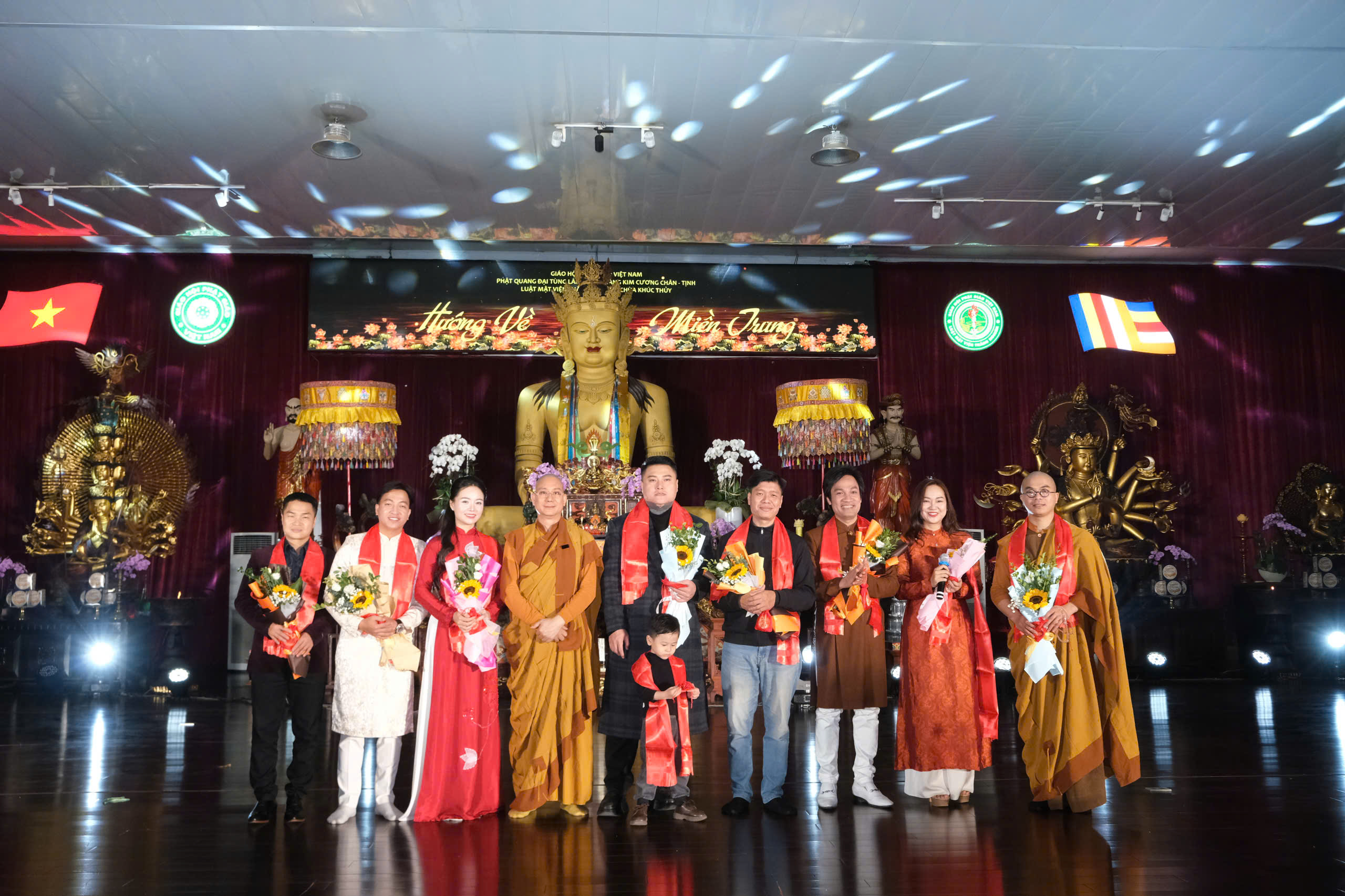 Thượng tọa trụ trì tặng hoa tri ân các văn nghệ sĩ đã tới tham dự và biểu diễn tại đêm nhạc gây quỹ từ thiện ủng hộ đồng bào miền Trung