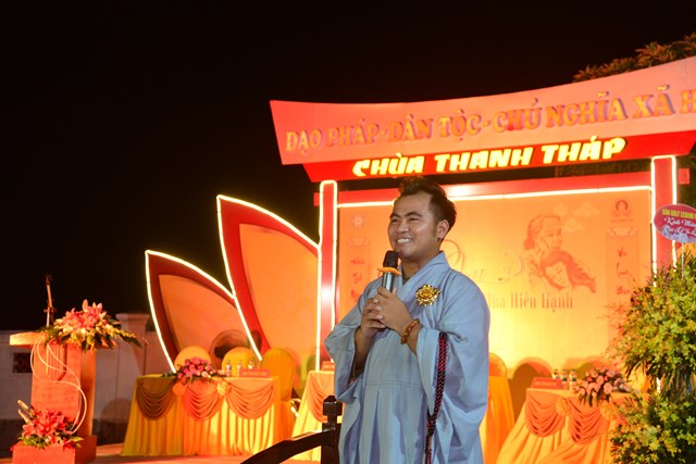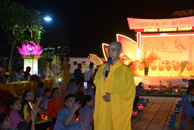 Dịp này, Đại đức Thích Khai Bảo – Bản tự chùa Thanh Tháp, trưởng BTC đại lễ đã ban chia sẻ cùng toàn thể đại chúng một thời pháp ngắn với chủ đề: “ Món nợ suốt đời”. Món nợ ở đây chính là món nợ về mặt tình cảm, nhất là nợ công ơn cha mẹ thì suốt cả cuộc đời cũng không thể nào đền đáp được công lao trời biển của cha mẹ. Chính vì lẽ đó, chúng ta hãy biết yêu thương cha mẹ khi cha mẹ còn ở cõi thế, đừng để khi cha mẹ mất rồi mới thấy ân hận thì đã quá muộn màng. Trong kinh Vu Lan – Báo Hiếu, Đức Phật cũng đã dạy: Cho dù chúng ta có xả thịt, moi gan để đền ơn cha mẹ thì cũng chưa trả được ơn của cha mẹ…Hay trong kinh Nhất A Hàm, Đức Phật có dạy: “ Này các Thầy Tỳ Kheo ! Nếu người nào biết ơn và đền ơn cho dù ở cách xa Ta ngàn dặm, nhưng ta vẫn xem người đó như đứng hầu gần bên Ta. Còn nếu như người nào không biết ơn và đền ơn, cho dù người đó có đứng hầu gần bên Ta nhưng Ta vẫn xem họ cách xa ngàn dặm”.
