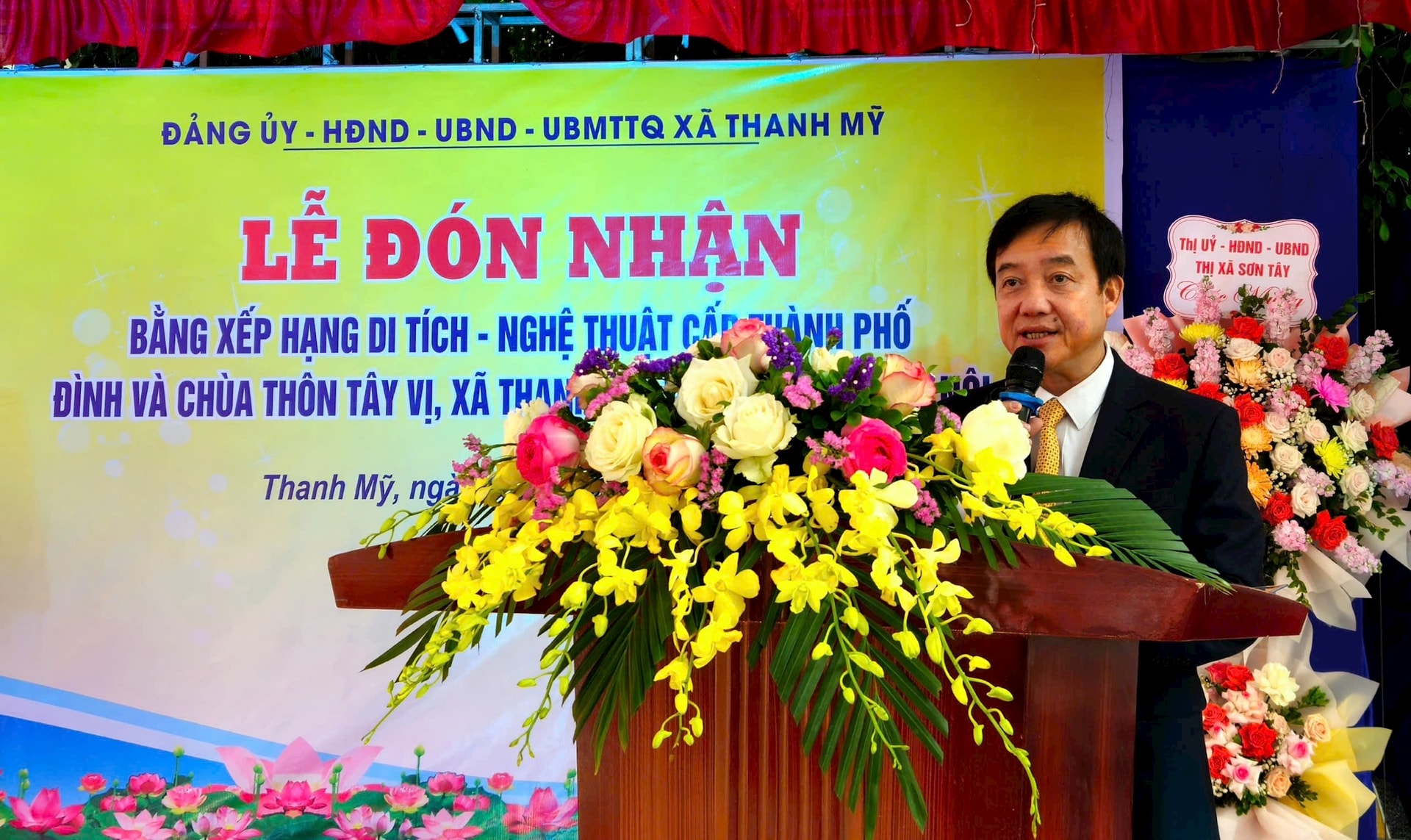 Phát biểu tại buổi lễ, Phó Chủ tịch UBND thị xã Sơn Tây Lê Đại Thăng chúc mừng xã Thanh Mỹ, đồng thời đề nghị cấp ủy Đảng, chính quyền và nhân dân xã Thanh Mỹ, thôn Tây Vị thực hiện tốt một số nội dung: Đẩy mạnh công tác tuyên truyền, giáo dục về giá trị các di tích lịch sử, văn hóa gần với việc giáo dục truyền thống yêu nước, lòng tự hào dân tộc, tinh thần đoàn kết gắn bó trong cộng đồng dân cư, ý thức giữ gìn, bảo vệ di sản văn hóa trong nhân dân, nhất là thế hệ trẻ. Đảng bộ, chính quyền, nhân dân xã Thanh Mỹ tiếp tục có trách nhiệm, chung tay bảo tồn và phát huy giá trị di tích đình – chùa Tây Vị xứng tầm với vị thế của một di sản cấp thành phố; gắn trách nhiệm của chính quyền, các đoàn thể ở xã, thôn trong việc bảo vệ và phát huy giá trị di tích; bảo tồn có chọn lọc các giá trị văn hóa truyền thống tốt đẹp, đặc sắc trong các di sản văn hóa trên địa bàn; tăng cường, củng cố khối đoàn kết, gắn bó mật thiết trong công tác bảo tồn di tích; gắn việc bảo tồn phát huy giá trị di tích với phát triển du lịch.