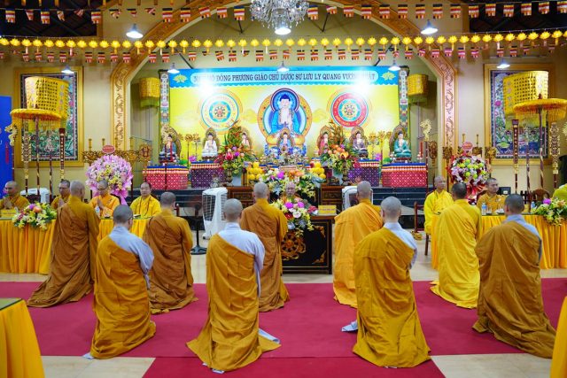 Trong không khí trang nghiêm, đại chúng đã thành kính vọng bái Hòa thượng Đường chủ, đỉnh lễ chư Tôn đức giảng sư, cung thỉnh chư vị từ bi hứa khả giảng pháp cho ba tháng an cư tại Hạ trường Trung Hậu.