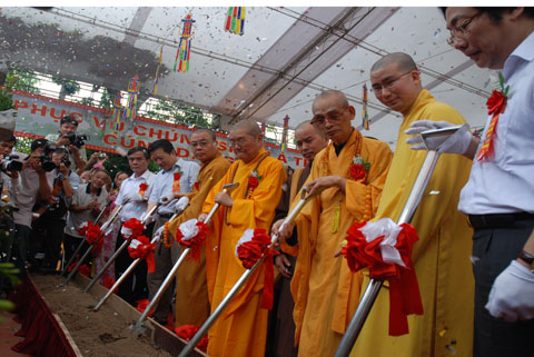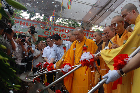 Cuối buổi lễ HT Pháp Chủ cùng Chư tôn đức Tăng Ni và các vị khách quý làm lễ cầu nguyện hoà bình, thả chim bồ câu và động thổ xây dựng chùa.
