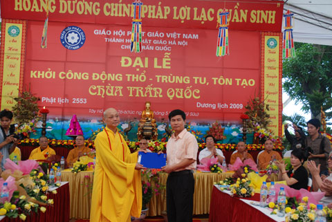 UBND quận Tây Hồ đã quyết định phê duyệt “Báo cáo kinh tế kỹ thuật xây dựng công trình tu bổ, tôn tạo di tích chùa Trấn Quốc". Việc tu bổ, tôn tạo lần này nhằm làm cho chùa Trấn Quốc thêm vững chắc, khang trang và đẹp đẽ hơn, đó cũng là việc làm thiết thực chào mừng kỷ niệm 1000 năm Thăng Long – Hà Nội.