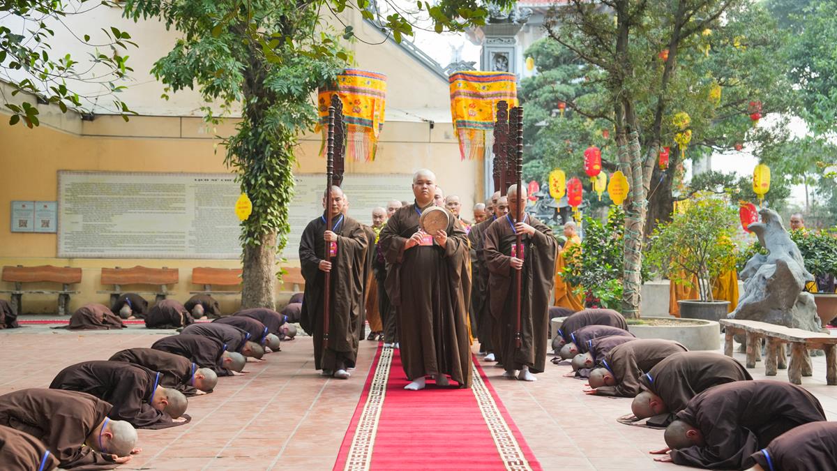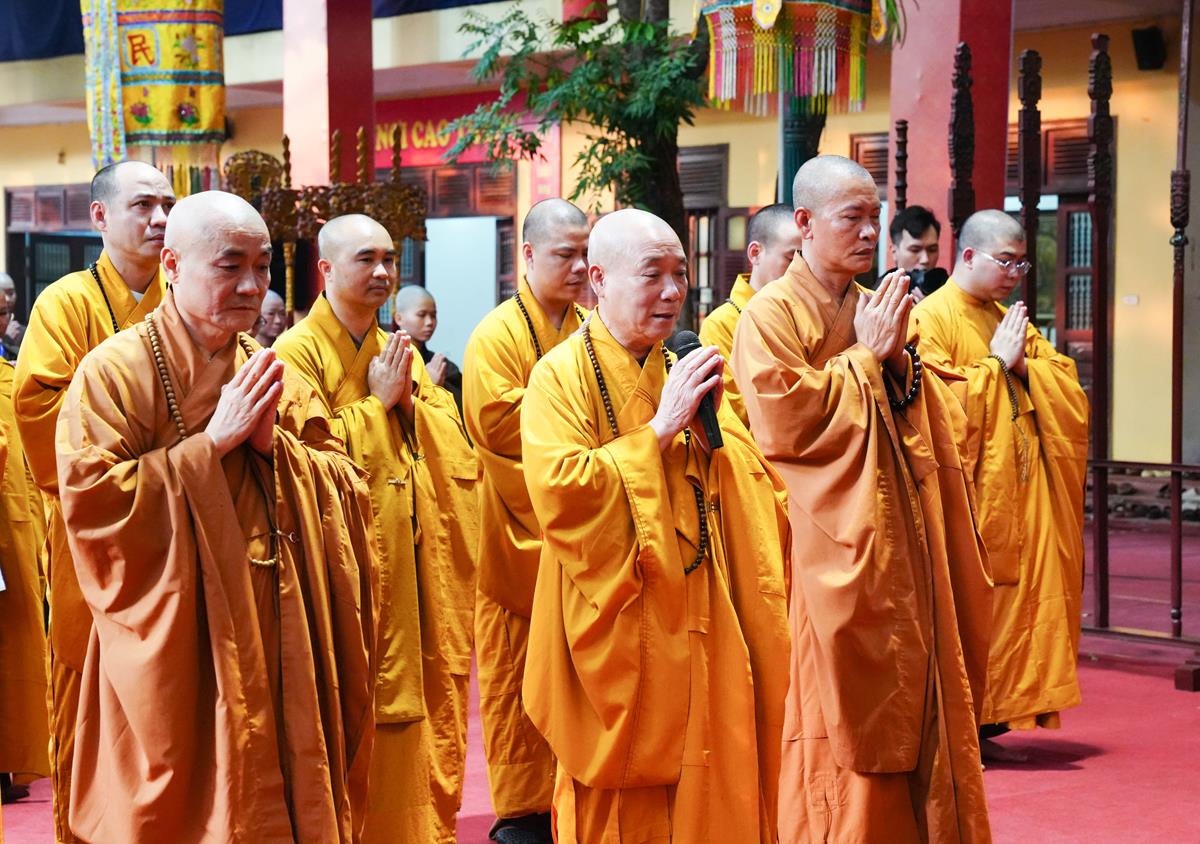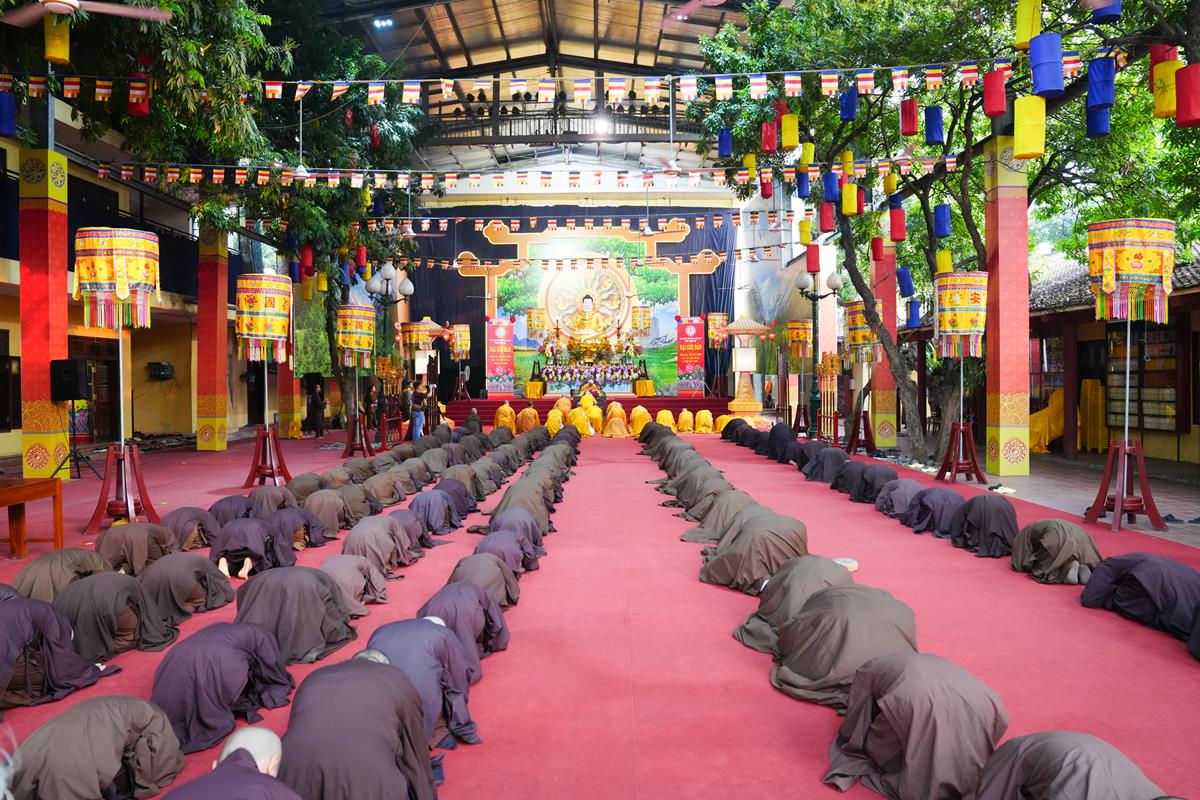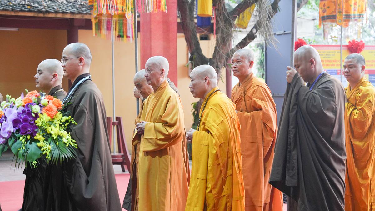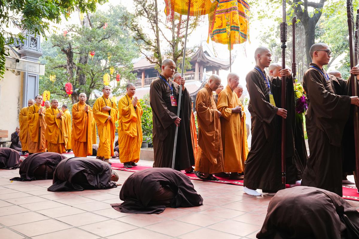 Tại đây, Hòa thượng Thích Bảo Nghiêm – Phó chủ tịch HĐTS, Trưởng Ban Hoằng pháp TW, Trưởng BTS GHPGVN thành phố Hà Nội, Trưởng Ban tổ chức đã cùng chư Tôn đức BTS, Ban kiến đàn, đại diện hai hội đồng Giới sư, đại diện Nghiệp sư cùng các Giới tử đã vân tập đỉnh lễ bái chào Đức Đệ tứ Pháp Chủ GHPGVN theo nghi thức truyền thống thiền môn phía Bắc.