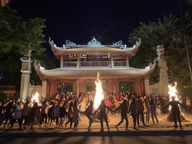 Tiếp theo chương trình, Hòa thượng đã đón nhận ngọn lửa từ bàn thờ Phật truyền ra bên lửa trại. Ngọn lửa hồng bập bùng cháy trong đêm u tịch, như chính sức trẻ và nhiệt huyết của các bạn trong thời kỳ hội nhập. Ngọn lửa mang lại sự ấm áp giữa đêm đông giá lạnh, khiến những trái tim như đang hòa cùng một nhịp đập và sát lại gần nhau hơn. Các bạn cùng nắm tay nhau hát vang, nhảy múa bên đám lửa hồng trong ngày cuối cùng của năm cũ. Những tiếng chúc tụng hò reo “Chúc mừng năm mới 2021” cứ vang mãi khắp không gian, phá tan đi cái tĩnh lặng vốn dĩ của màn đêm…