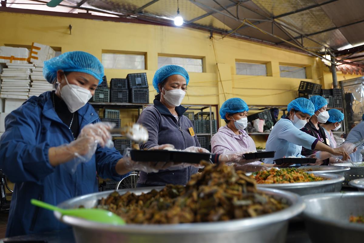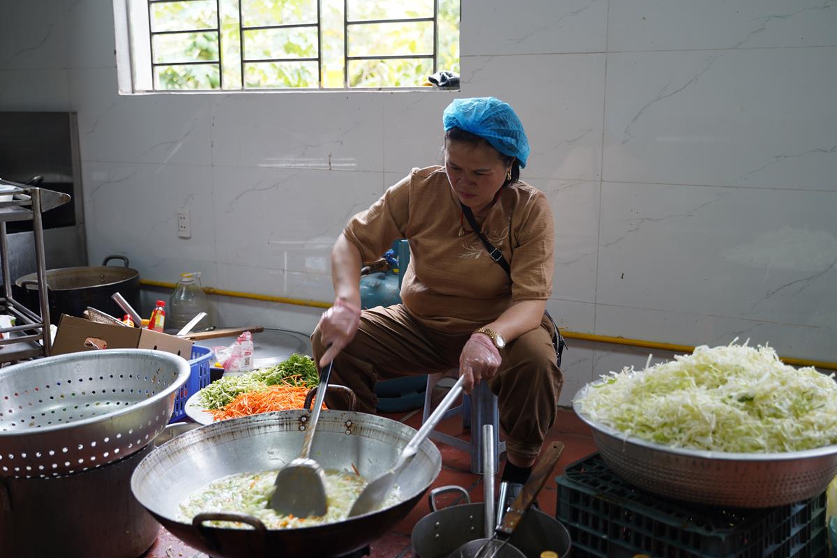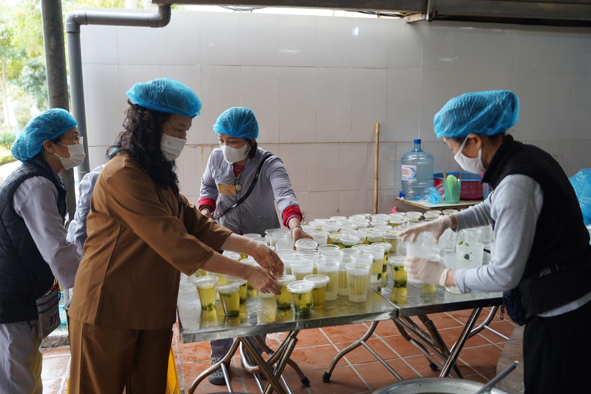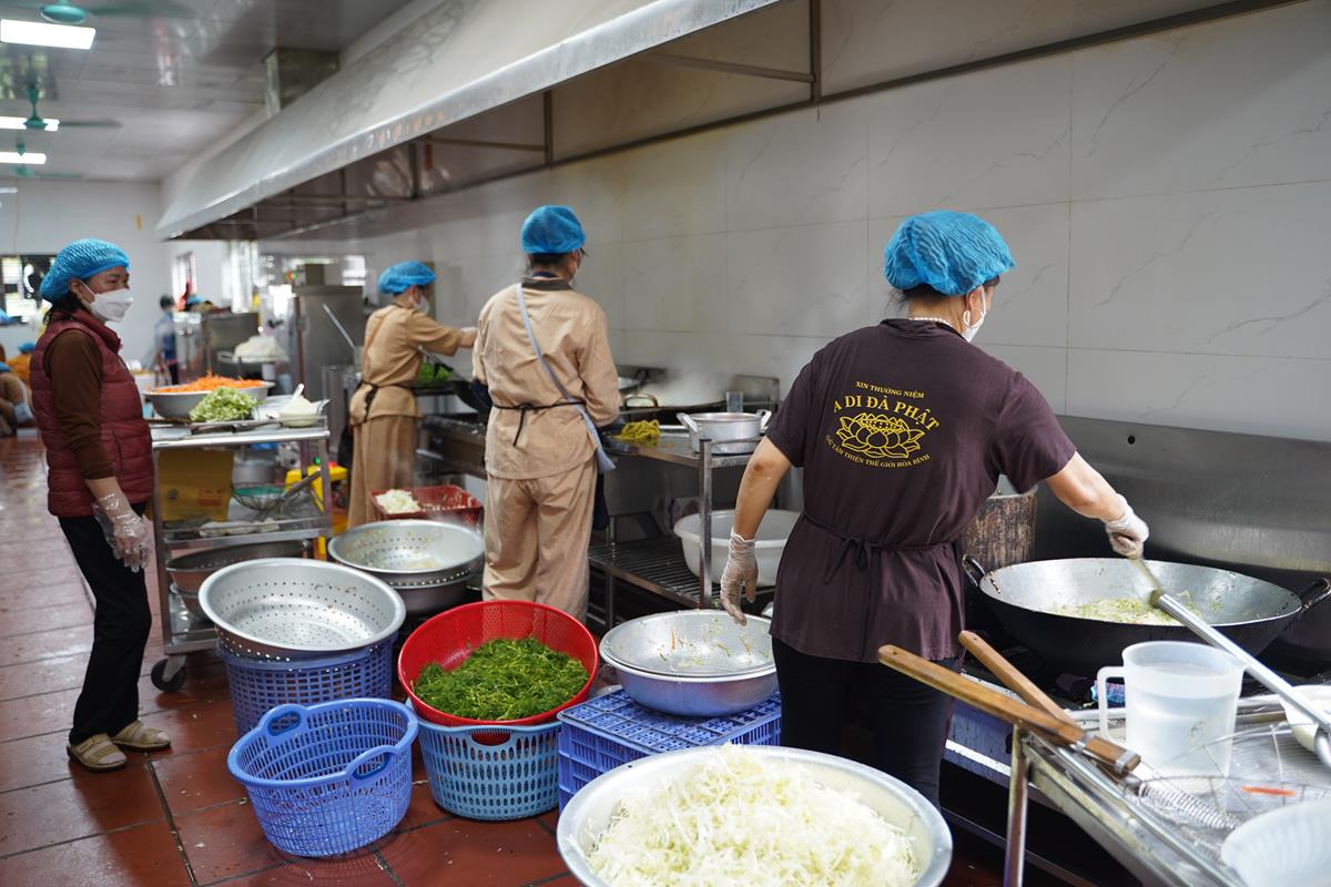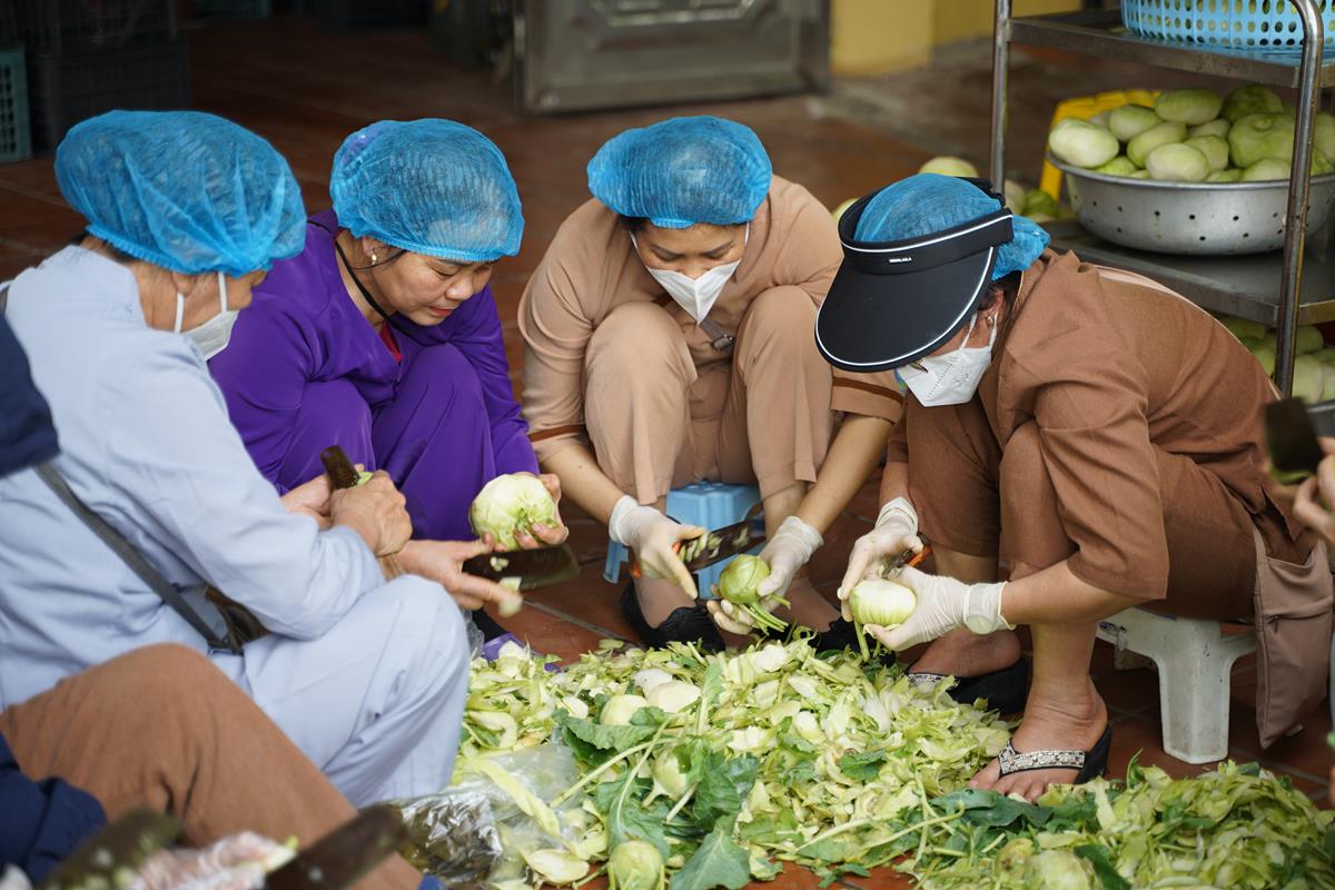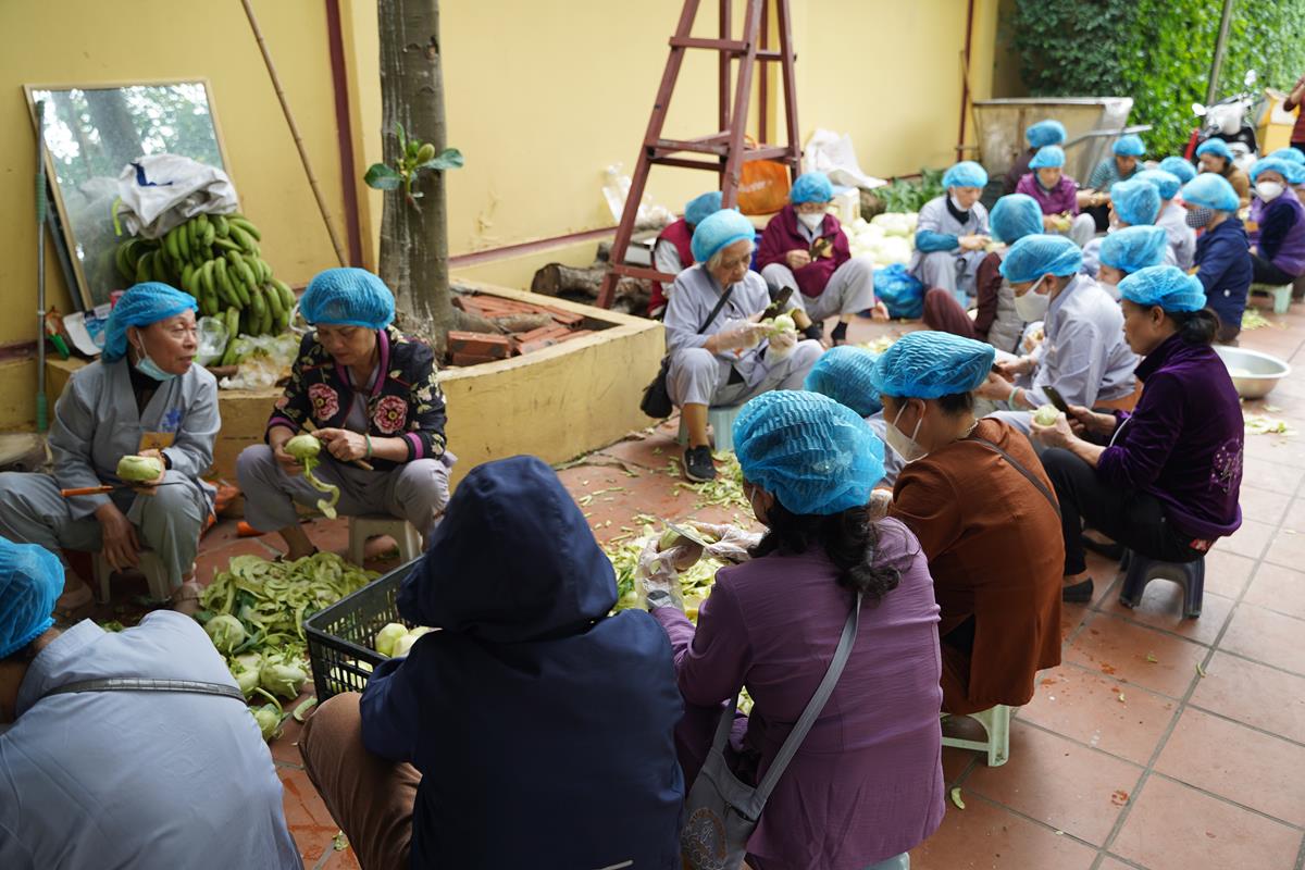 Trong buổi sáng, Ban tri khách đã đón tiếp các đoàn Phật tử từ các tỉnh thành vân tập về chùa Bằng, bố trí nơi nghỉ ngơi cho những Phật tử ở xa. Đội ngũ ban công quả cũng nỗ lực chuẩn bị thực phẩm từ sáng sớm để kịp cho bữa cúng Ngọ buổi trưa.