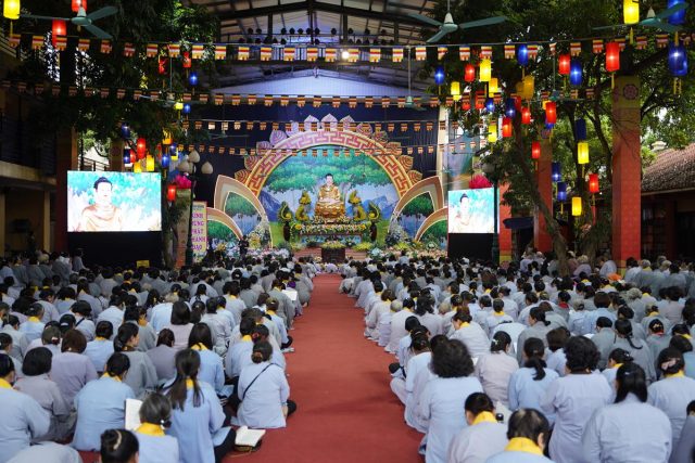 Cũng trong thời điểm này, các Phật tử không tham gia nghi thức khảo kinh đã vân tập về tại nơi lễ đường lớn để lắng nghe Thượng tọa Thích Chiếu Tuệ – Ủy viên HĐTS, Phó trưởng Ban thường trực Ban Hoằng pháp TW, Giáo thọ sư Đạo tràng Pháp Hoa miền Bắc giảng dạy về Oai nghi người Phật tử.