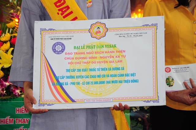 Nhân đây, Đại Đức Thích Quảng Phúc đã trao bằng tuyên dương công đức cho các tập thể, cá nhân đã có thành tích đóng góp cho phong trào từ thiện của Đạo tràng Ngũ Bách Hành Thiện trong thời gian qua. Đồng thời, nhân Đại lễ Phật đản năm nay, ĐĐ Thích Quảng Phúc cùng đạo tràng Ngũ Bách Hành Thiện đã trợ cấp 200 xuất thuốc chữa bệnh, trợ cấp cho trẻ mồ côi, người tàn tật, gia đình có hoàn cảnh khó khăn xã Dương Xá với tổng số tiền là 22 triệu đồng. Thay mặt cho Hội chữ thập đỏ huyện Gia Lâm, bà Đào Thúy Quỳnh đã đón nhận món quà này từ ĐĐ. Thích Quảng Phúc. Mặc dù chùa đang trong thời gian thi công, xây dựng, kinh phí thì eo hẹp nhưng Đại Đức trụ trì vẫn làm tốt các công việc từ thiện.
