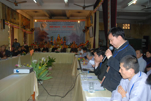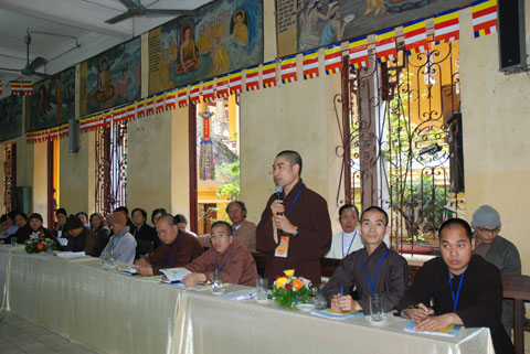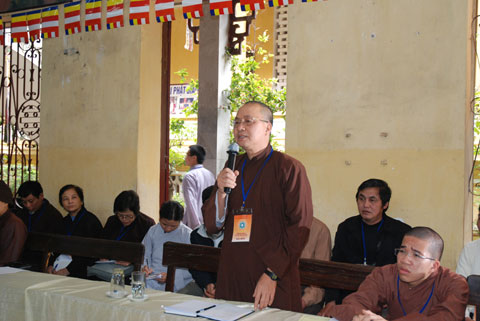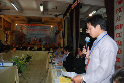 Cư sĩ Trí Minh – Trần Sơn Trà, ủy viên Tiểu ban Thanh thiếu niên Phật tử thuộc Phân ban Hướng dẫn Cư sĩ Phật tử Trung ương, Chủ nhiệm CLB TNPT Hà Nội phát biểu ý kiến về vai trò của Tuổi trẻ đối với sự phát triển của Phật giáo Việt Nam