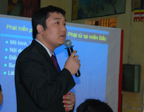 Phật tử Anh Minh – Hoàng Anh Tuyển, Chủ nhiệm Câu lạc bộ Thanh niên Phật tử Quán Sứ trình bày tham luận "Vai trò của người trí thức đối với văn hoá Phật giáo"