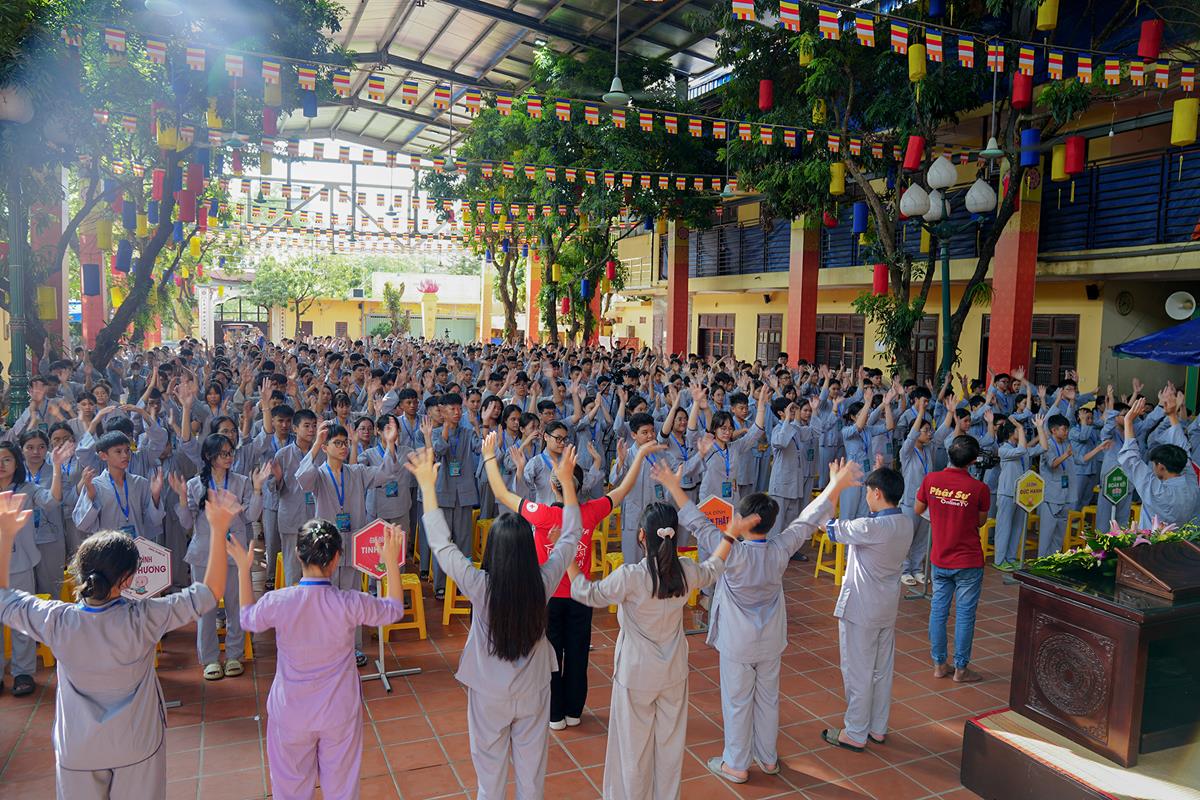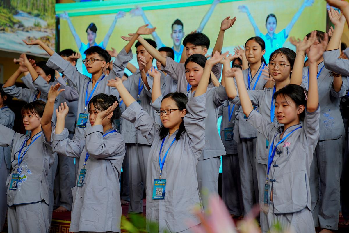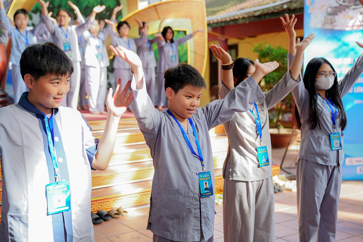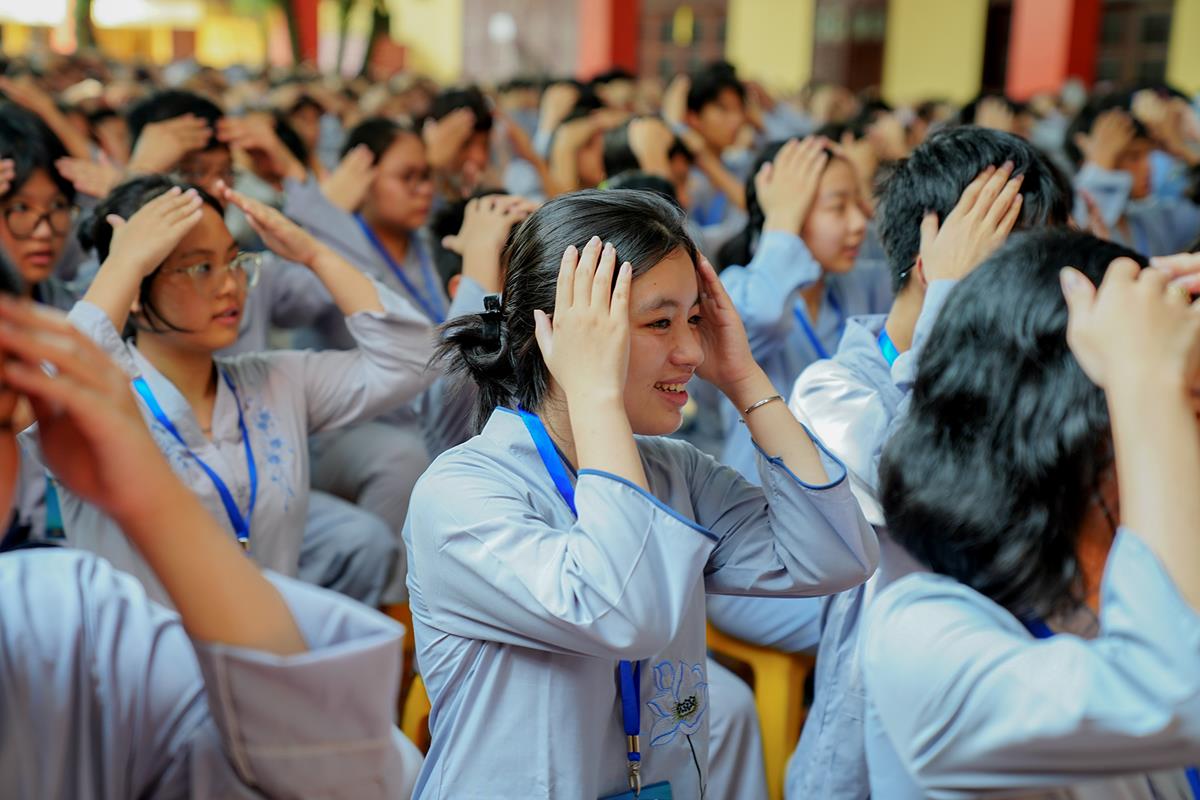 Trước khi kết thúc buổi chia sẻ, các khóa sinh đã có buổi tập múa đồng diễn đầy sôi nổi dưới sự hướng dẫn của sư cô Anh Nghiêm, được cùng nhau biểu diễn và đón nhận những món quà nhỏ khích lệ, khiến các bạn đã dần bớt đi sự rụt rè ban đầu.