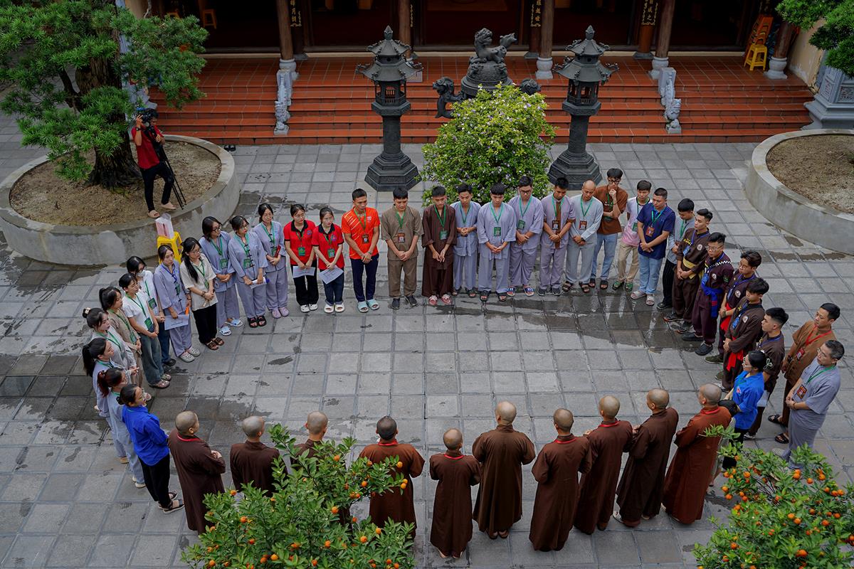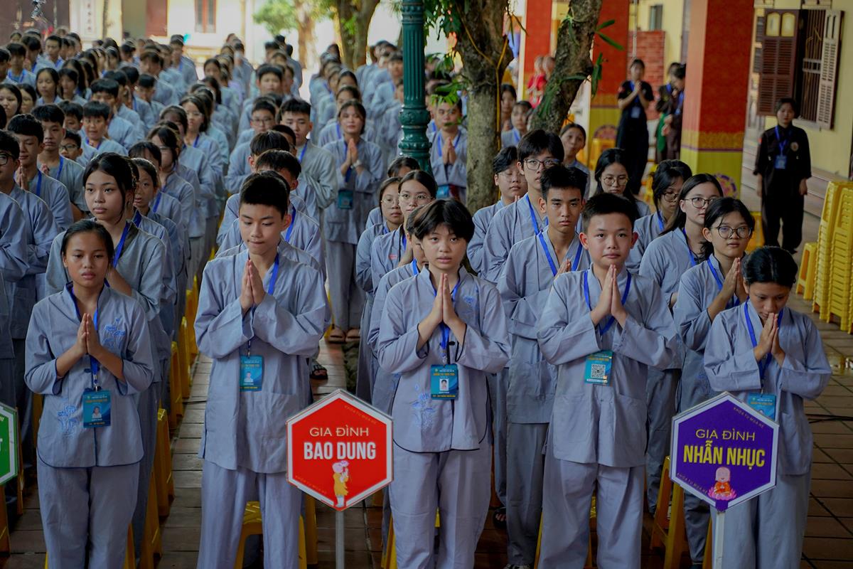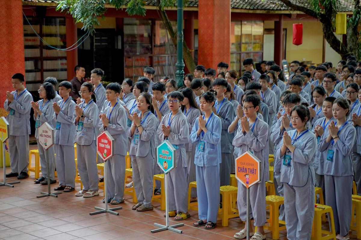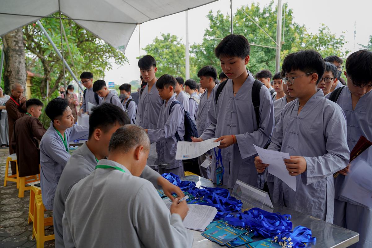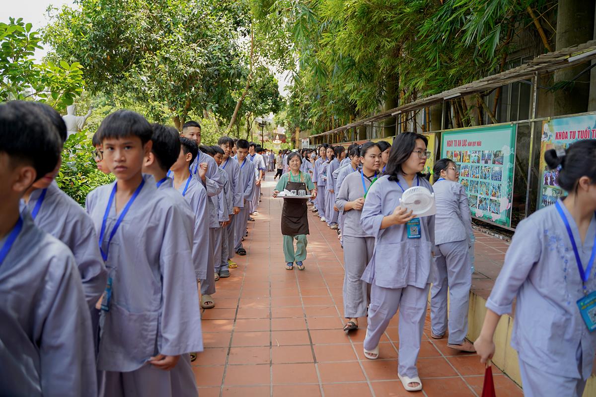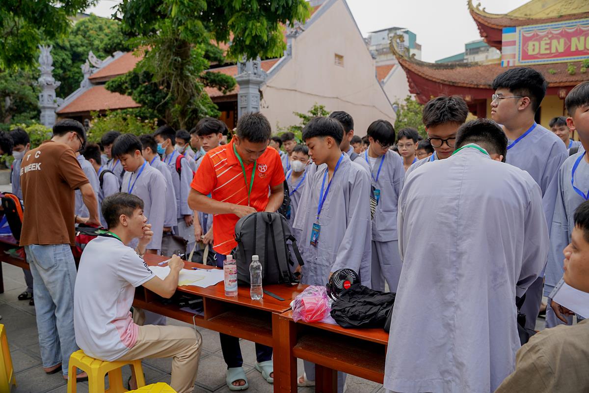Tiếp theo, Thủ tục nhập khóa đã được diễn ra nhanh chóng. Ngay sau khi được các anh chị tình nguyện viên chu đáo hướng dẫn nhận thẻ đeo, sắp xếp ổn định nơi nghỉ ngơi cất đồ, các khóa sinh đã cùng nhau vân tập tại lễ đường chùa Bằng, cùng làm quen với quý Thầy trong Ban tổ chức và được chia ra thành 10 gia đình: Từ Bi, Nhẫn Nhục, Tinh Tiến, Hoan Hỷ, Chân Thật, Đức Hạnh, Đoàn Kết, Bao Dung, Lắng Nghe, Hiểu Thương. Tại đây, các bạn cũng được học hỏi những oai nghi phép tắc chốn thiền môn từ đi – đứng – nằm – ngồi cũng như cách chào hỏi, lễ lạy sao cho đúng chính pháp.