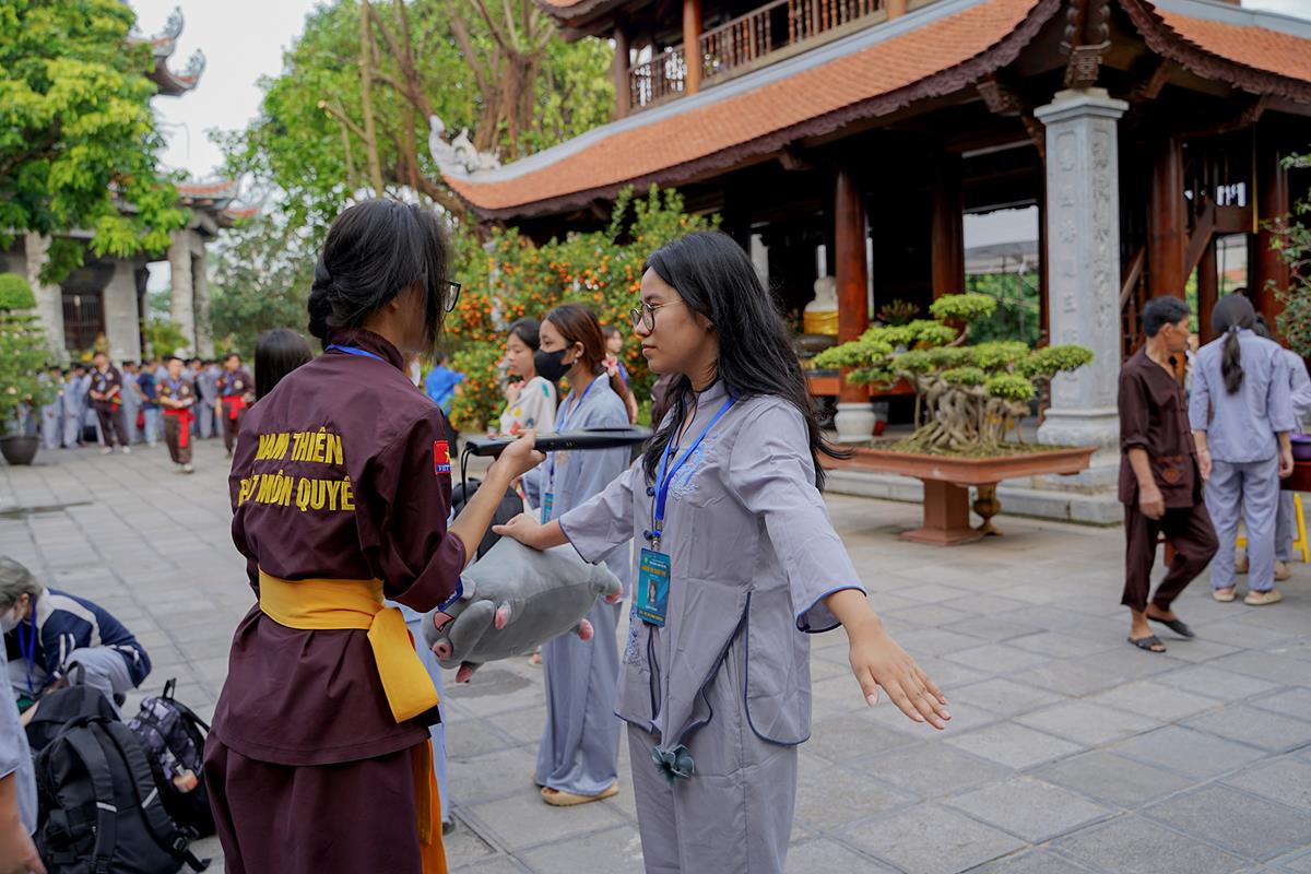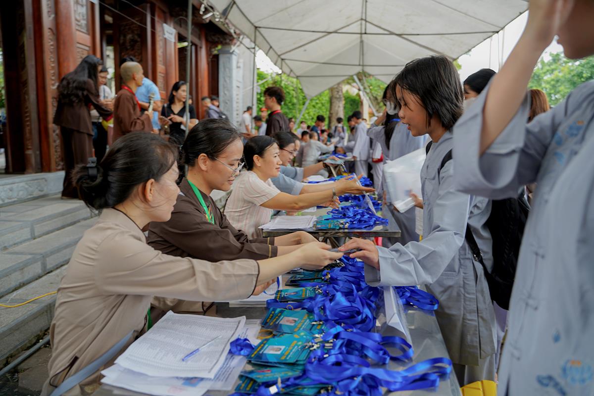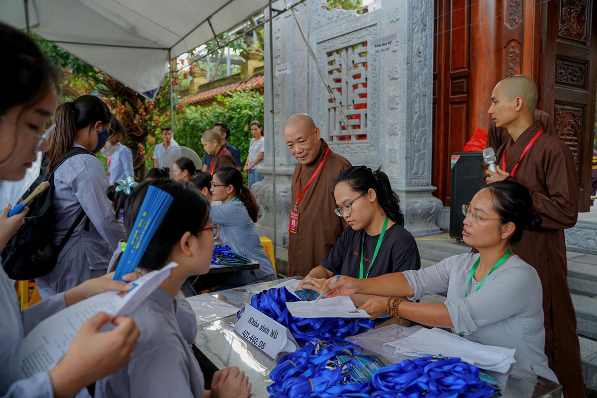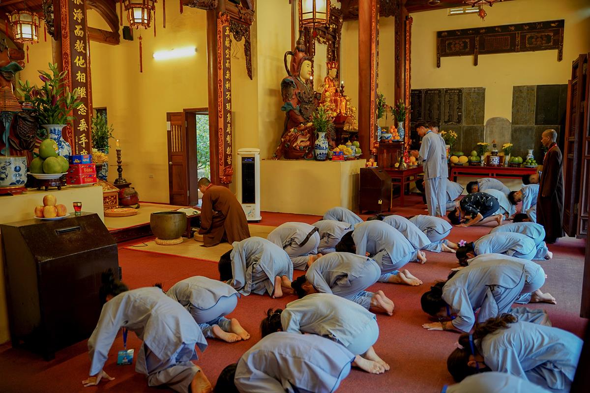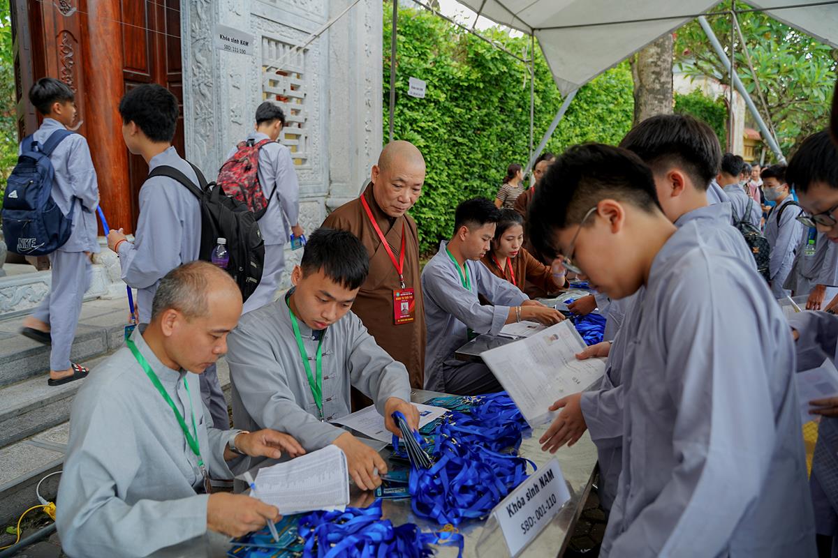 Tiếp theo, Thủ tục nhập khóa đã được diễn ra nhanh chóng. Ngay sau khi được các anh chị tình nguyện viên chu đáo hướng dẫn nhận thẻ đeo, sắp xếp ổn định nơi nghỉ ngơi cất đồ, các khóa sinh đã cùng nhau vân tập tại lễ đường chùa Bằng, cùng làm quen với quý Thầy trong Ban tổ chức và được chia ra thành 10 gia đình: Từ Bi, Nhẫn Nhục, Tinh Tiến, Hoan Hỷ, Chân Thật, Đức Hạnh, Đoàn Kết, Bao Dung, Lắng Nghe, Hiểu Thương. Tại đây, các bạn cũng được học hỏi những oai nghi phép tắc chốn thiền môn từ đi – đứng – nằm – ngồi cũng như cách chào hỏi, lễ lạy sao cho đúng chính pháp.