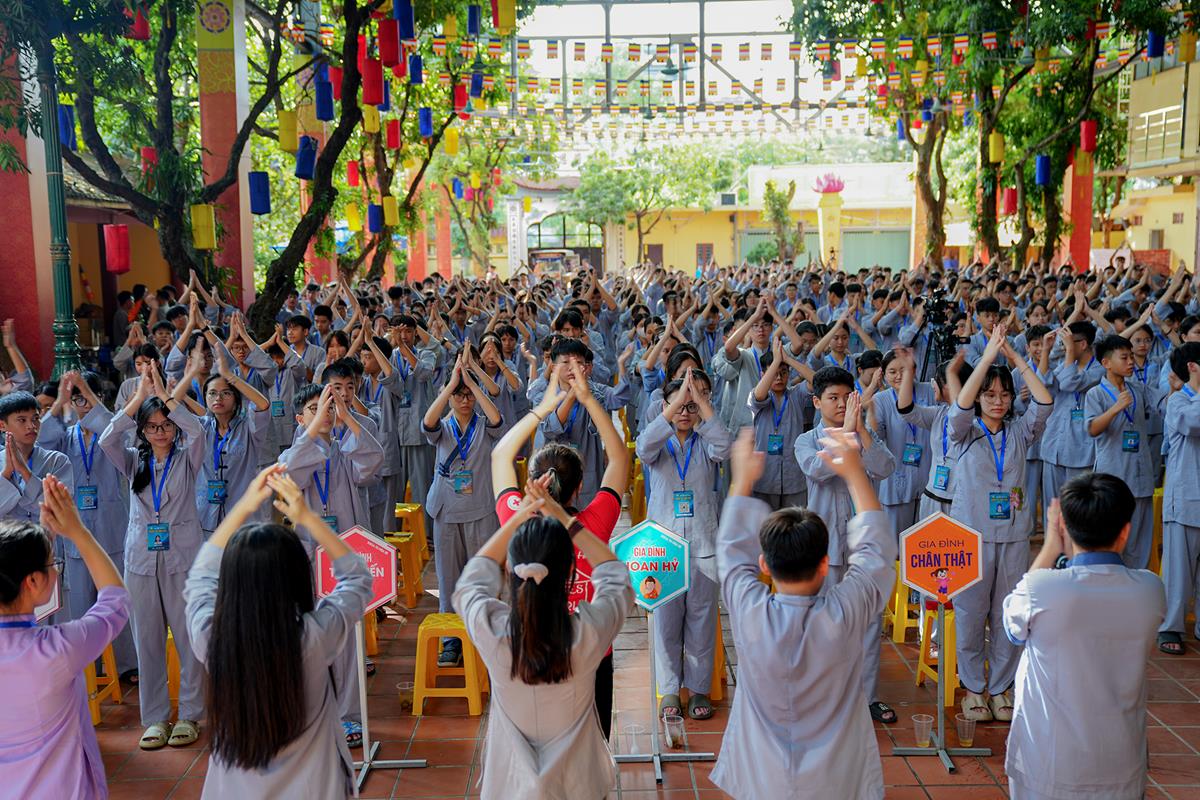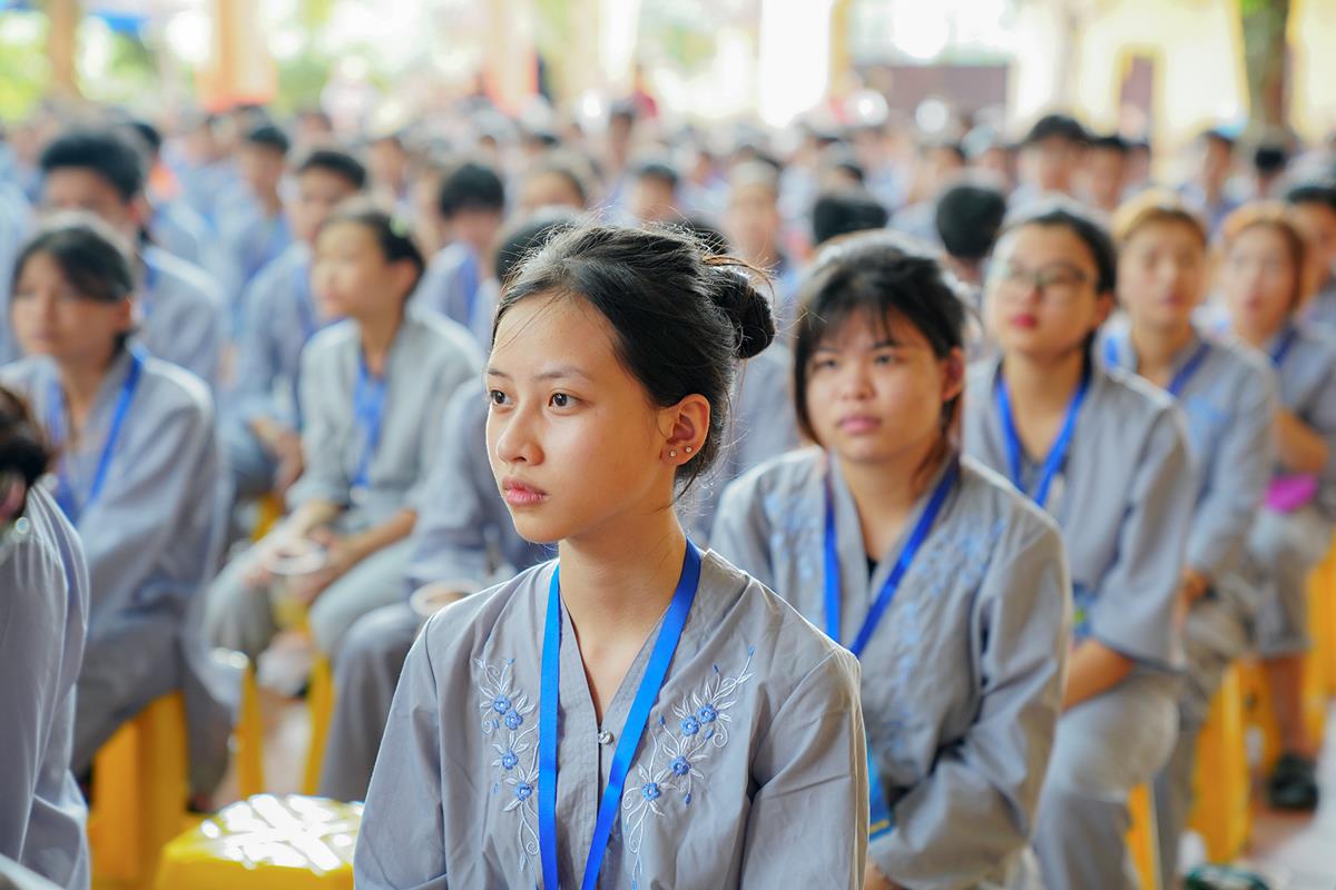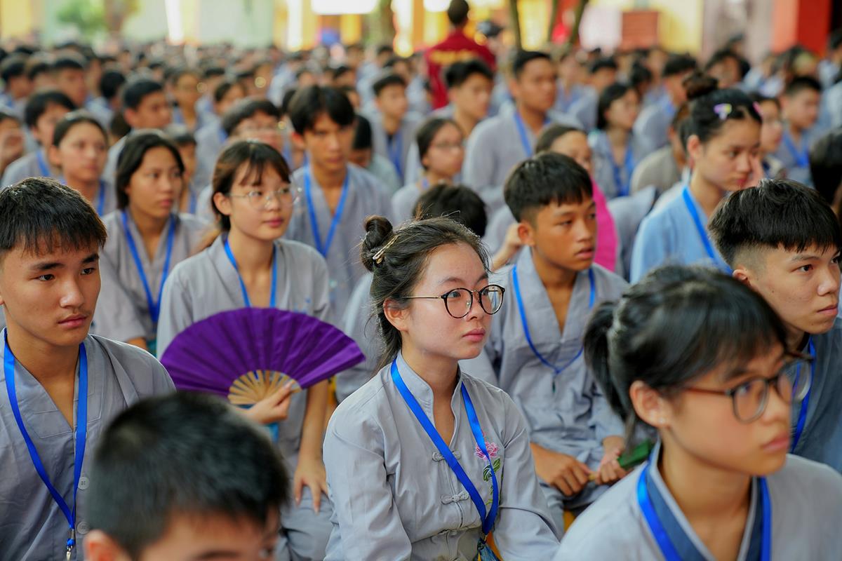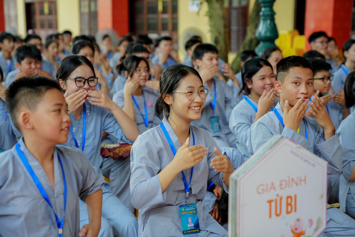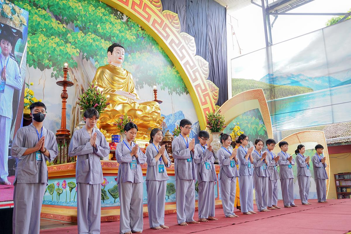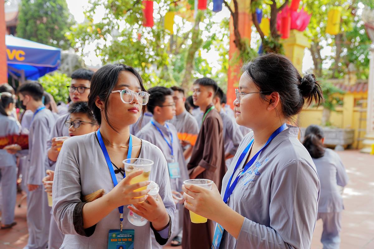 Tiếp theo, Thủ tục nhập khóa đã được diễn ra nhanh chóng. Ngay sau khi được các anh chị tình nguyện viên chu đáo hướng dẫn nhận thẻ đeo, sắp xếp ổn định nơi nghỉ ngơi cất đồ, các khóa sinh đã cùng nhau vân tập tại lễ đường chùa Bằng, cùng làm quen với quý Thầy trong Ban tổ chức và được chia ra thành 10 gia đình: Từ Bi, Nhẫn Nhục, Tinh Tiến, Hoan Hỷ, Chân Thật, Đức Hạnh, Đoàn Kết, Bao Dung, Lắng Nghe, Hiểu Thương. Tại đây, các bạn cũng được học hỏi những oai nghi phép tắc chốn thiền môn từ đi – đứng – nằm – ngồi cũng như cách chào hỏi, lễ lạy sao cho đúng chính pháp.