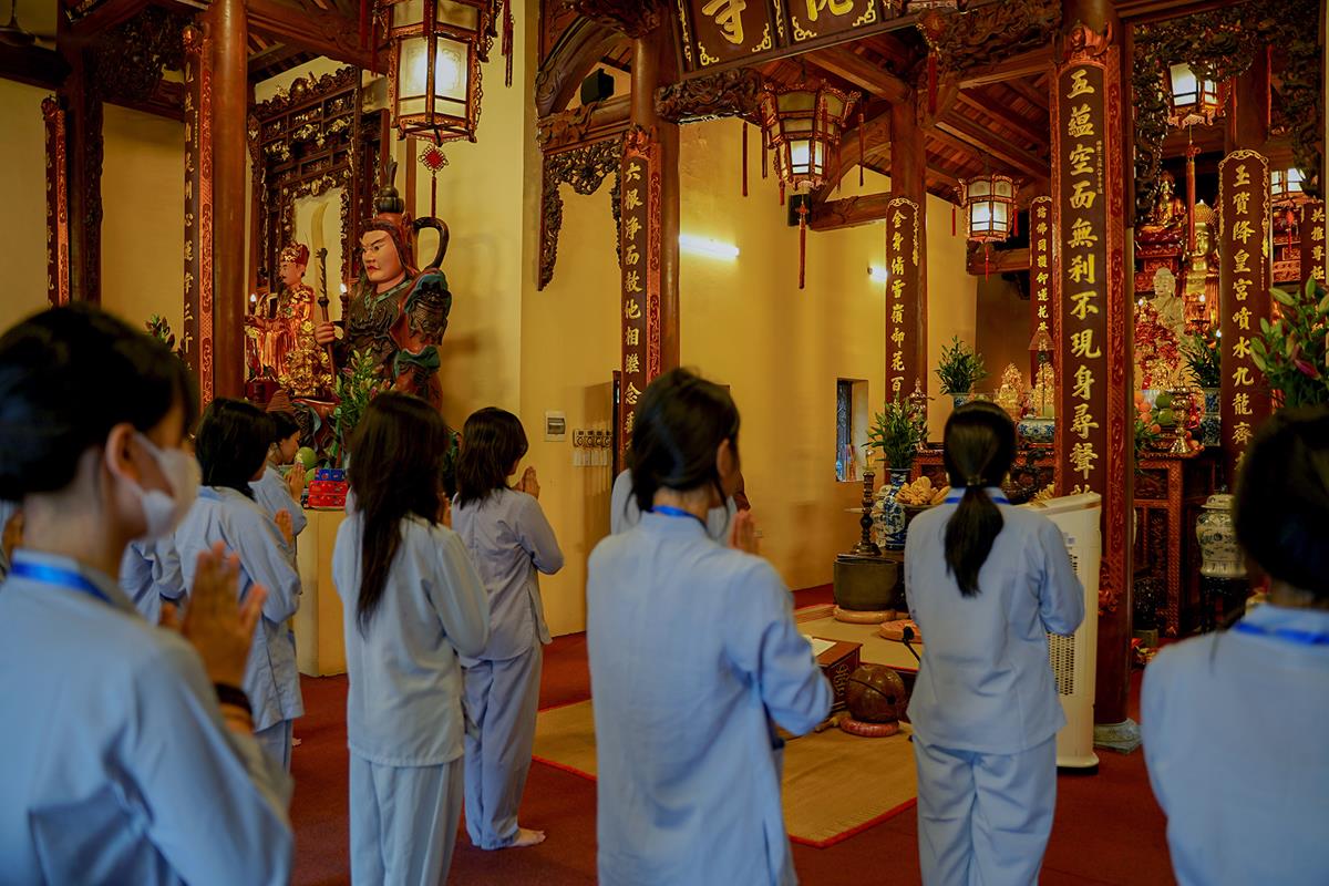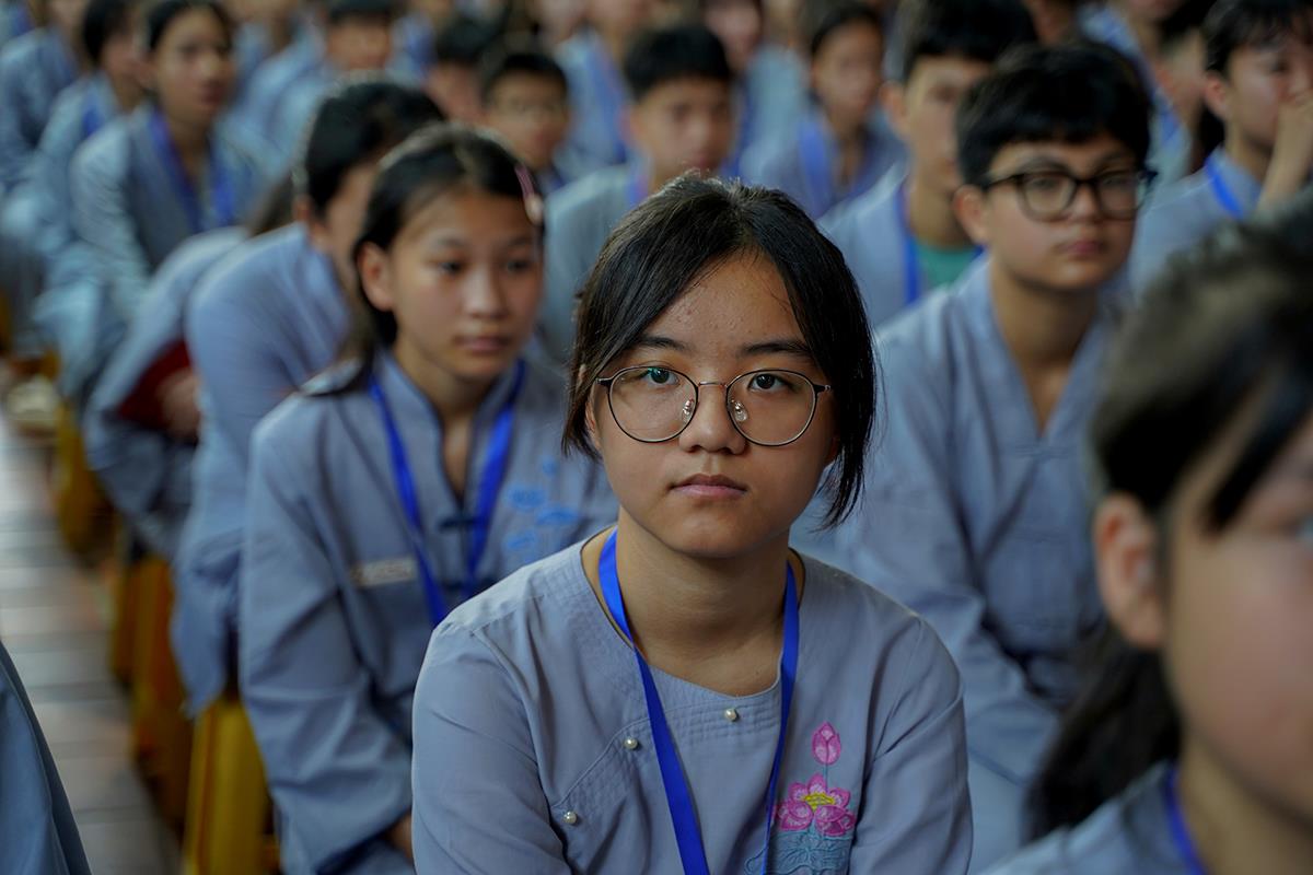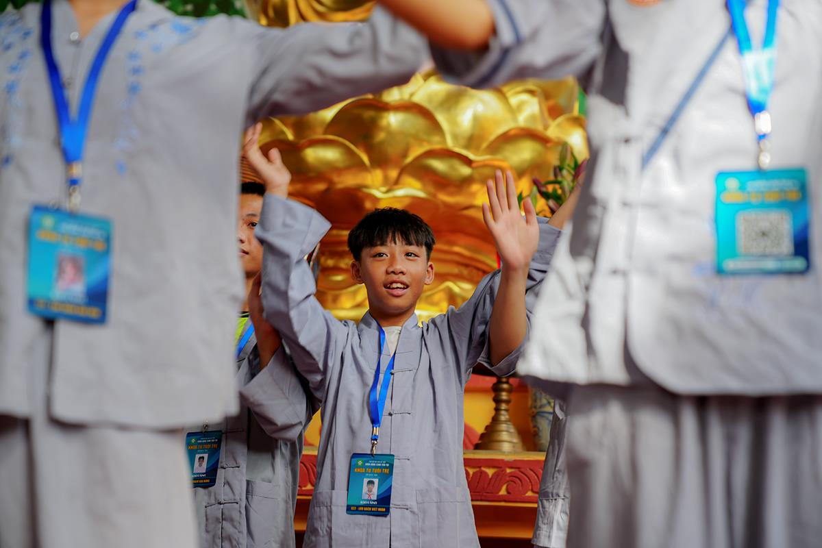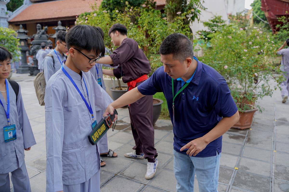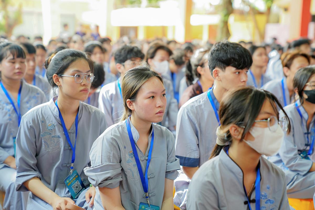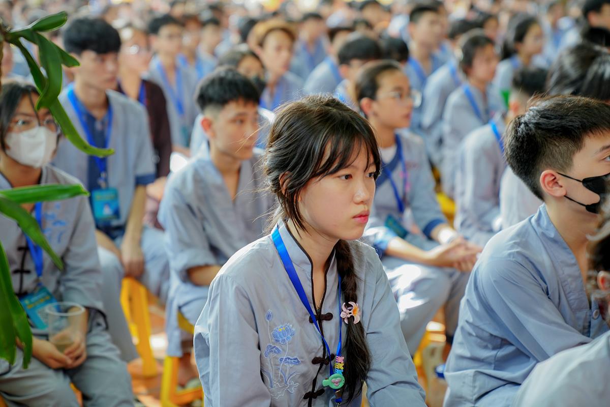 Tiếp theo, Thủ tục nhập khóa đã được diễn ra nhanh chóng. Ngay sau khi được các anh chị tình nguyện viên chu đáo hướng dẫn nhận thẻ đeo, sắp xếp ổn định nơi nghỉ ngơi cất đồ, các khóa sinh đã cùng nhau vân tập tại lễ đường chùa Bằng, cùng làm quen với quý Thầy trong Ban tổ chức và được chia ra thành 10 gia đình: Từ Bi, Nhẫn Nhục, Tinh Tiến, Hoan Hỷ, Chân Thật, Đức Hạnh, Đoàn Kết, Bao Dung, Lắng Nghe, Hiểu Thương. Tại đây, các bạn cũng được học hỏi những oai nghi phép tắc chốn thiền môn từ đi – đứng – nằm – ngồi cũng như cách chào hỏi, lễ lạy sao cho đúng chính pháp.
