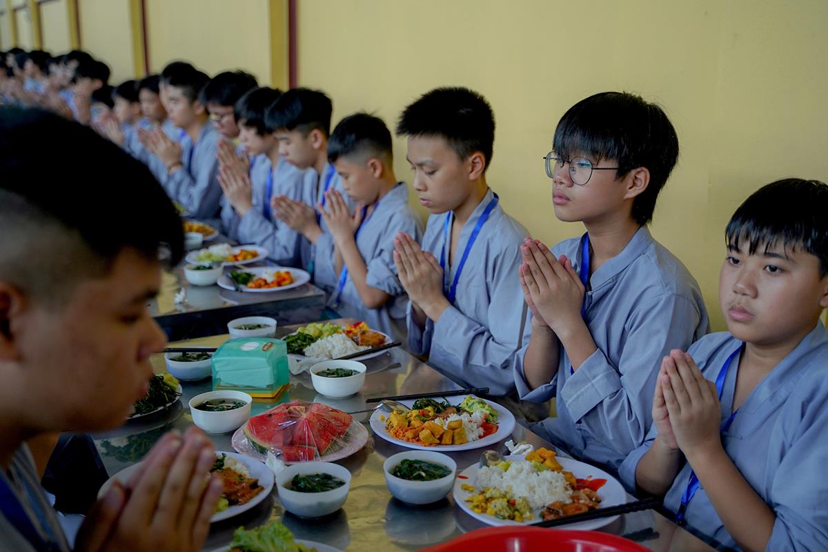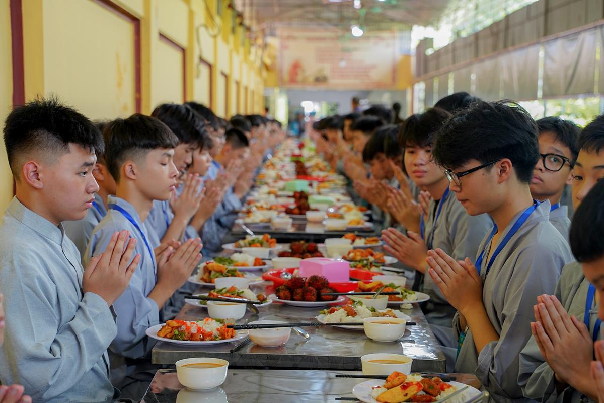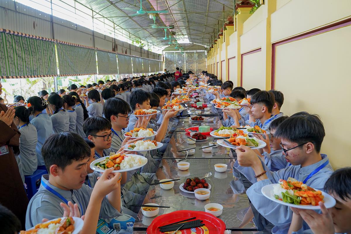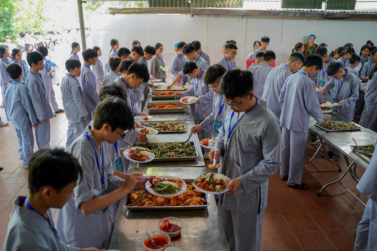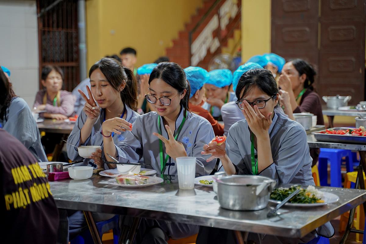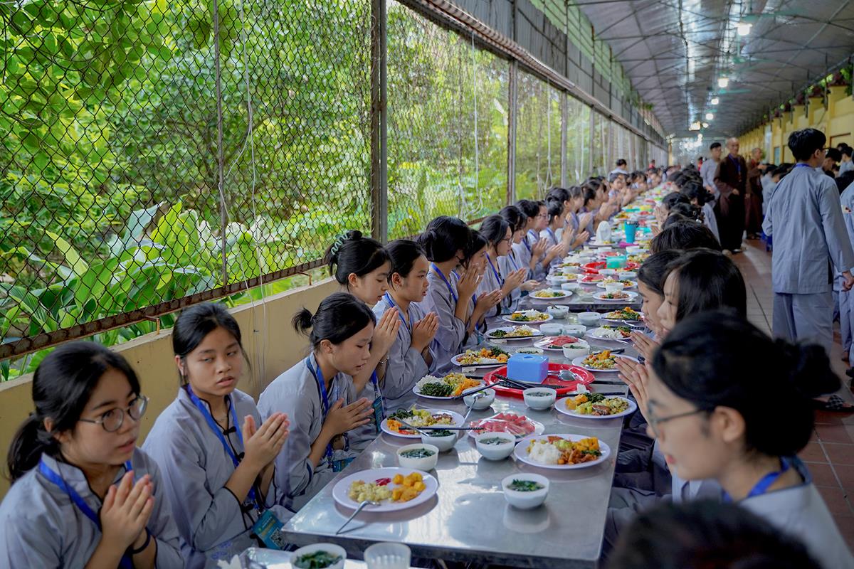 Buổi trưa, các bạn đã có bữa ăn chay đầu tiên đầy lạ lẫm, lần đầu trải nghiệm nghi thức cúng Quá Đường của thiền môn, dùng cơm trong chính niệm, học cách biết ơn tới những người đã làm ra bữa cơm cho mình. Những món ăn đầy hấp dẫn, phù hợp với sở thích, đáp ứng yêu cầu vệ sinh an toàn thực phẩm nghiêm ngặt đã khiến các bạn có một trải nghiệm ăn chay thú vị.